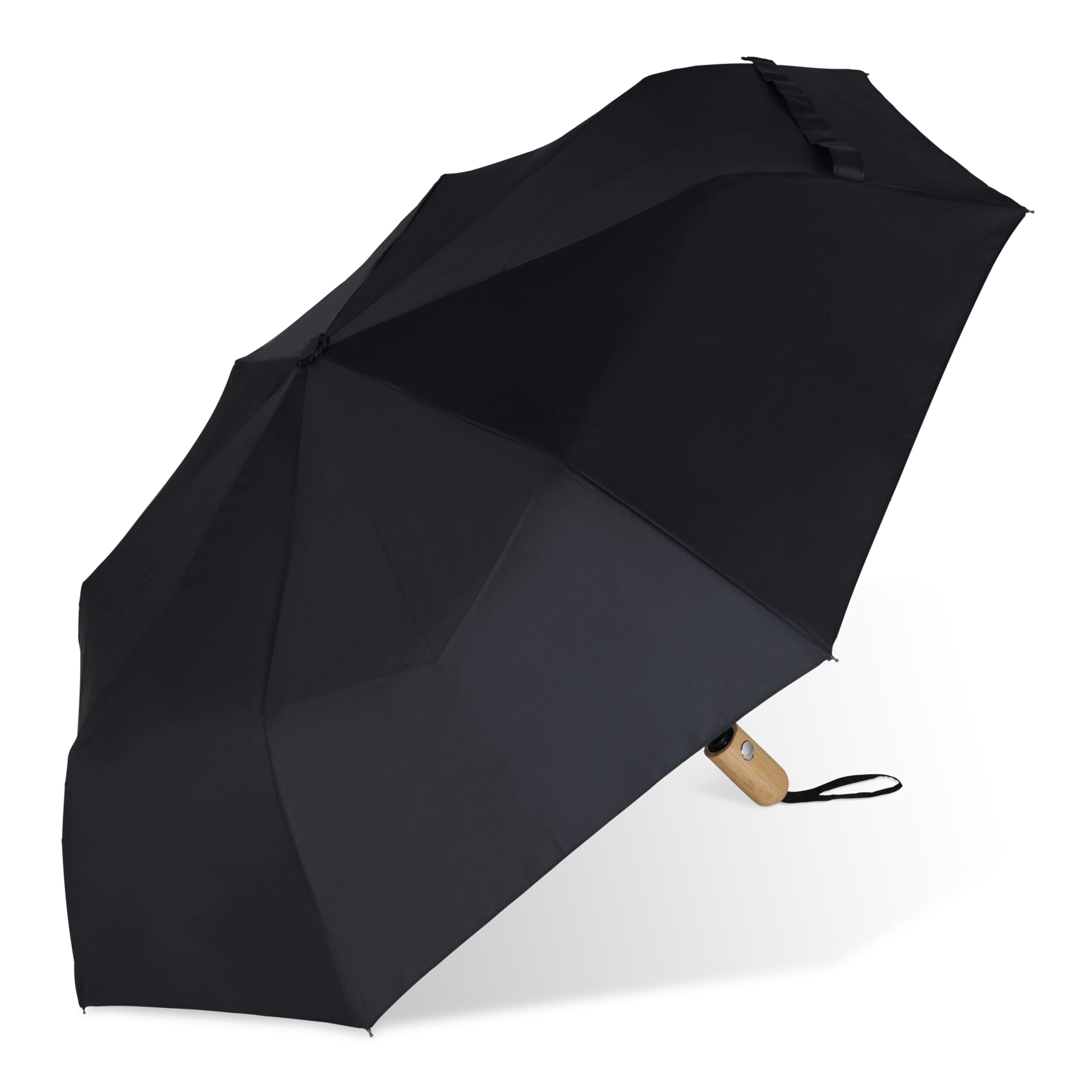 Regenschirm aus R-PET-Material mit einem stilvollen Echtholzgriff. Durch das Fiberglas-Gestänge ist der Regenschirm winddicht und er lässt sich mit einem Knopfdruck automatisch öffnen. Das melierte Material verleiht dem Modell einen luxuriösen Look. (Volltonfarbe schwarz).