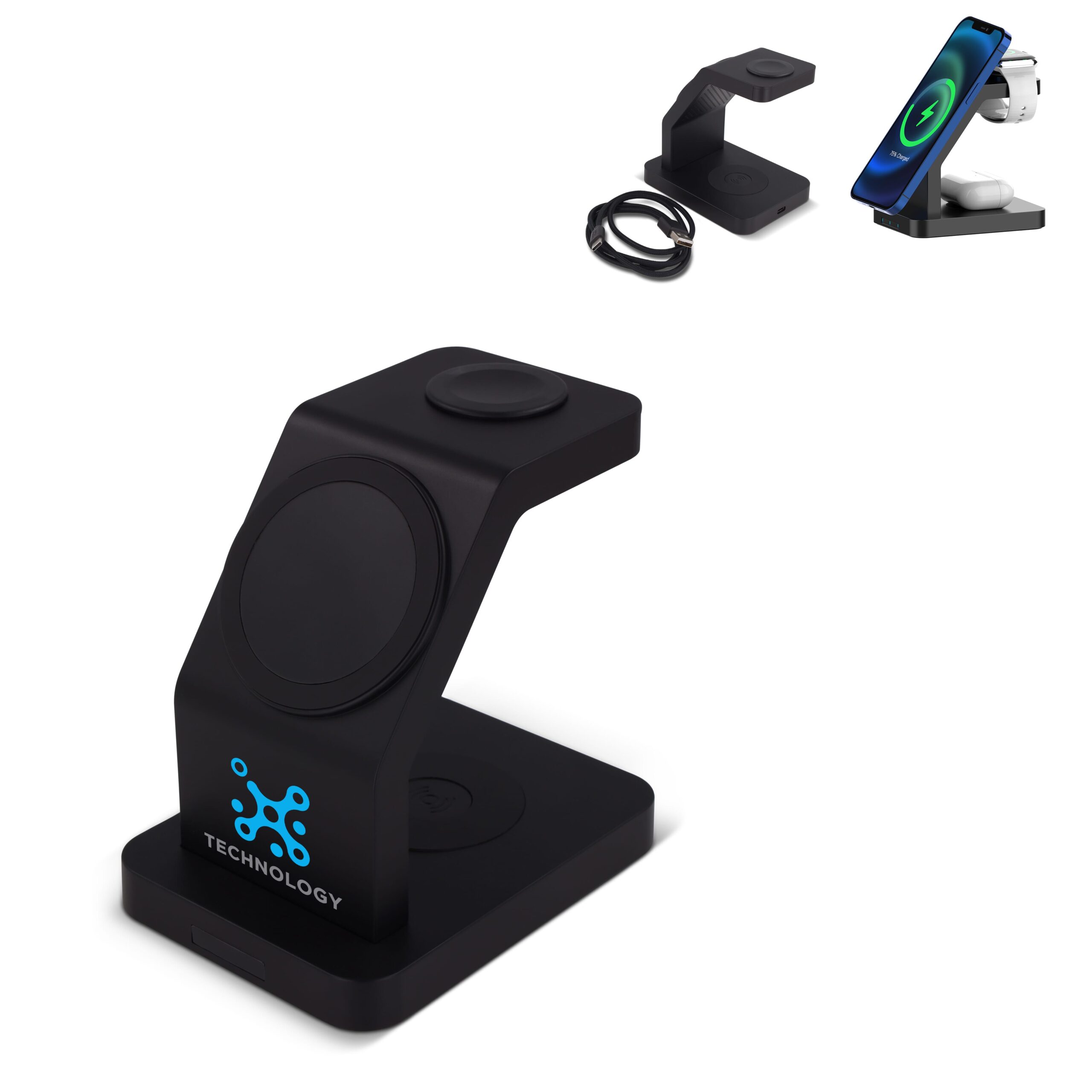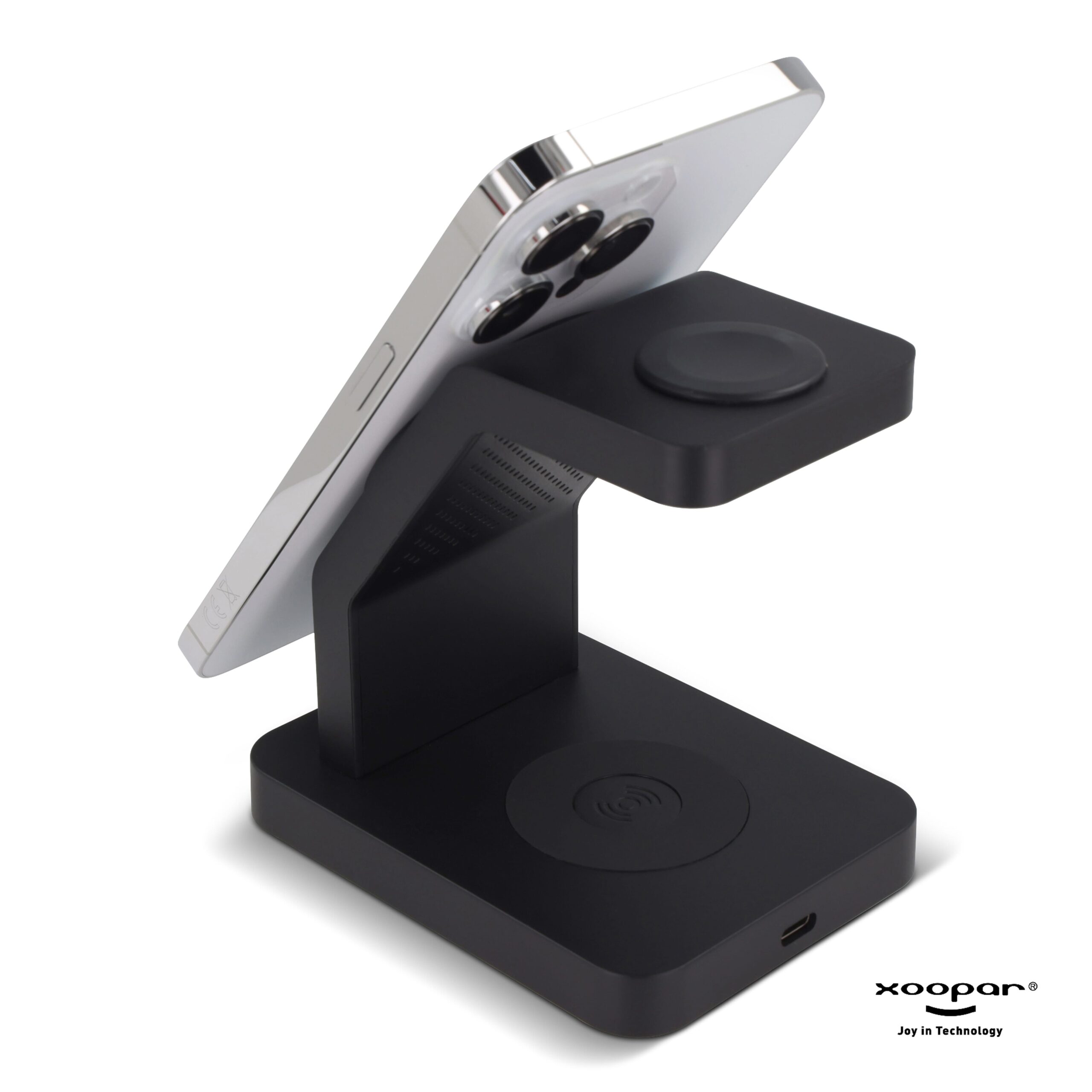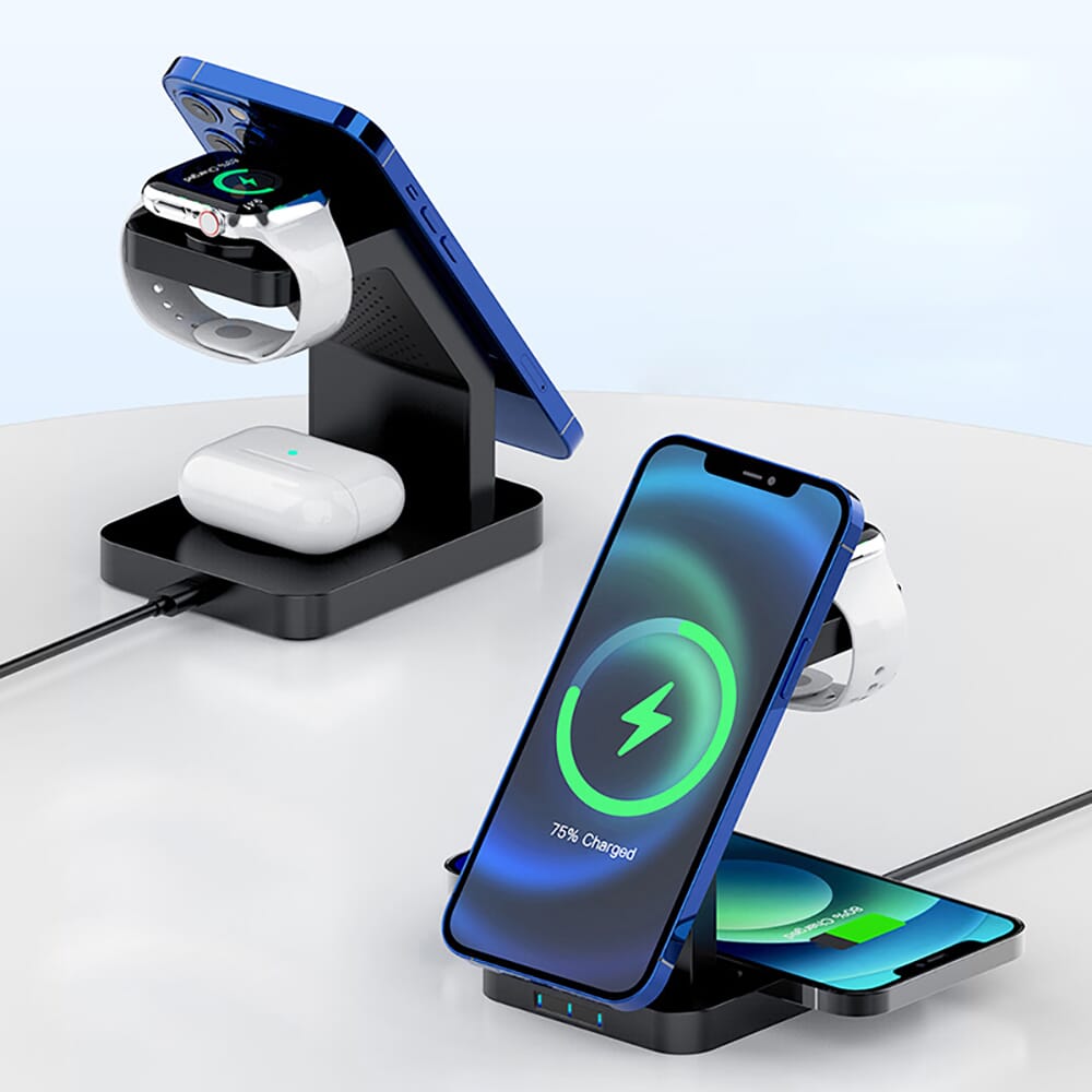 Mit diesem kabellosen 3-in-1-Ladegerät können Sie mehrere Geräte gleichzeitig aufladen. Die magnetische Ladefläche hält Ihr MagSafe-fähiges iPhone in Position. Darüber hinaus kann das Ladepad jedes Qi-fähige Gerät aufladen.