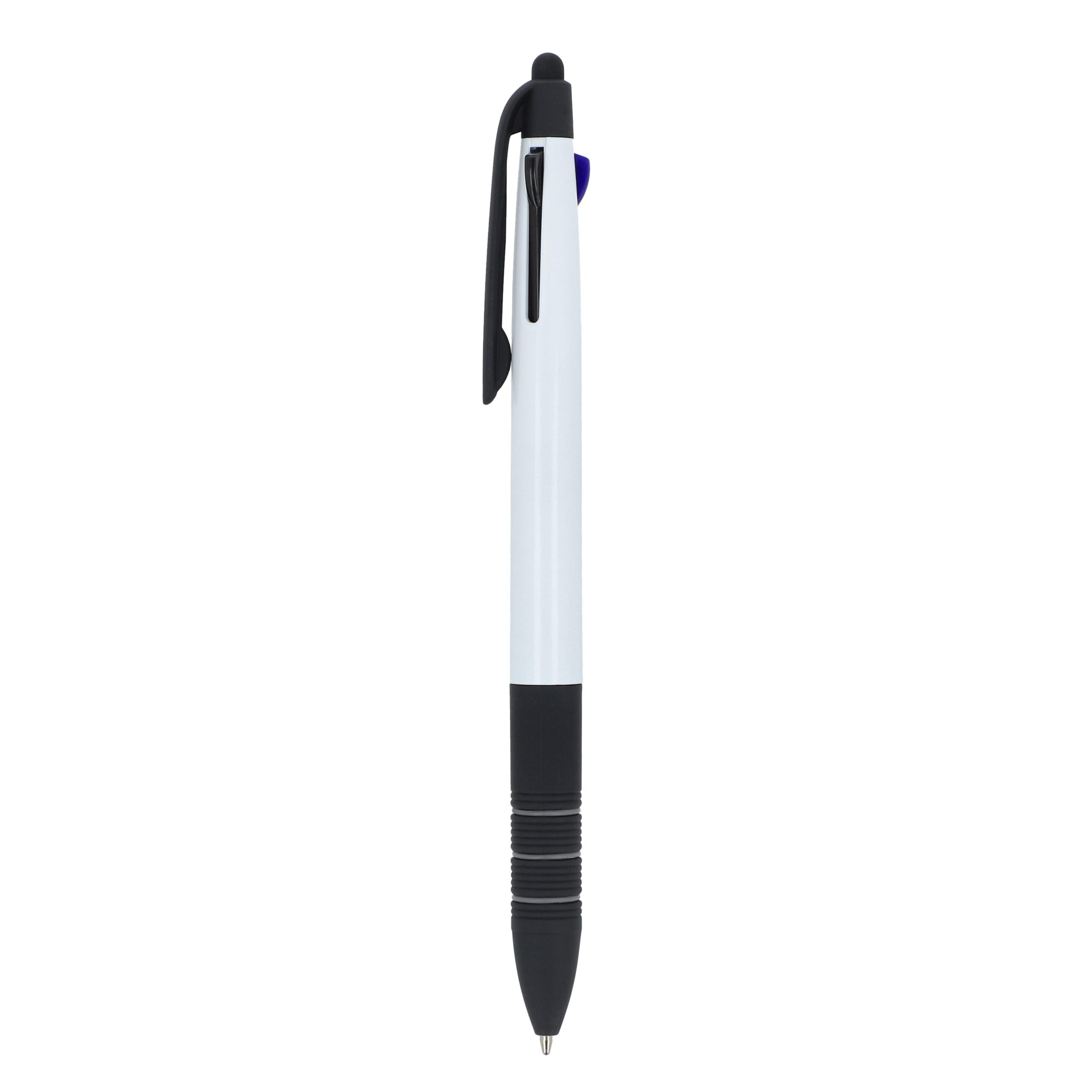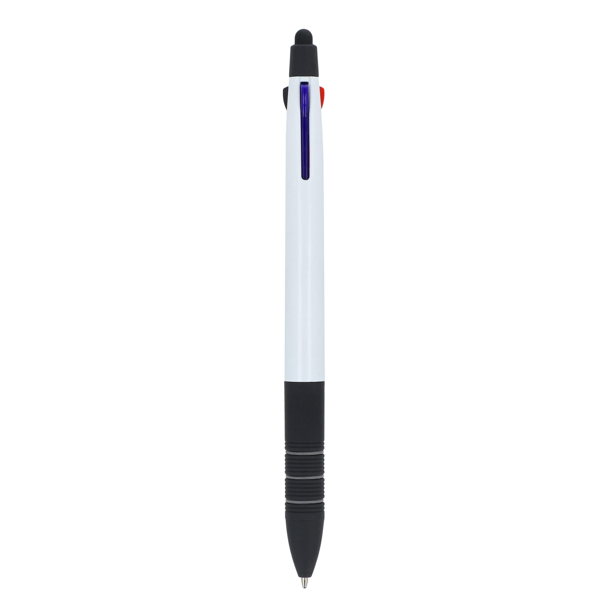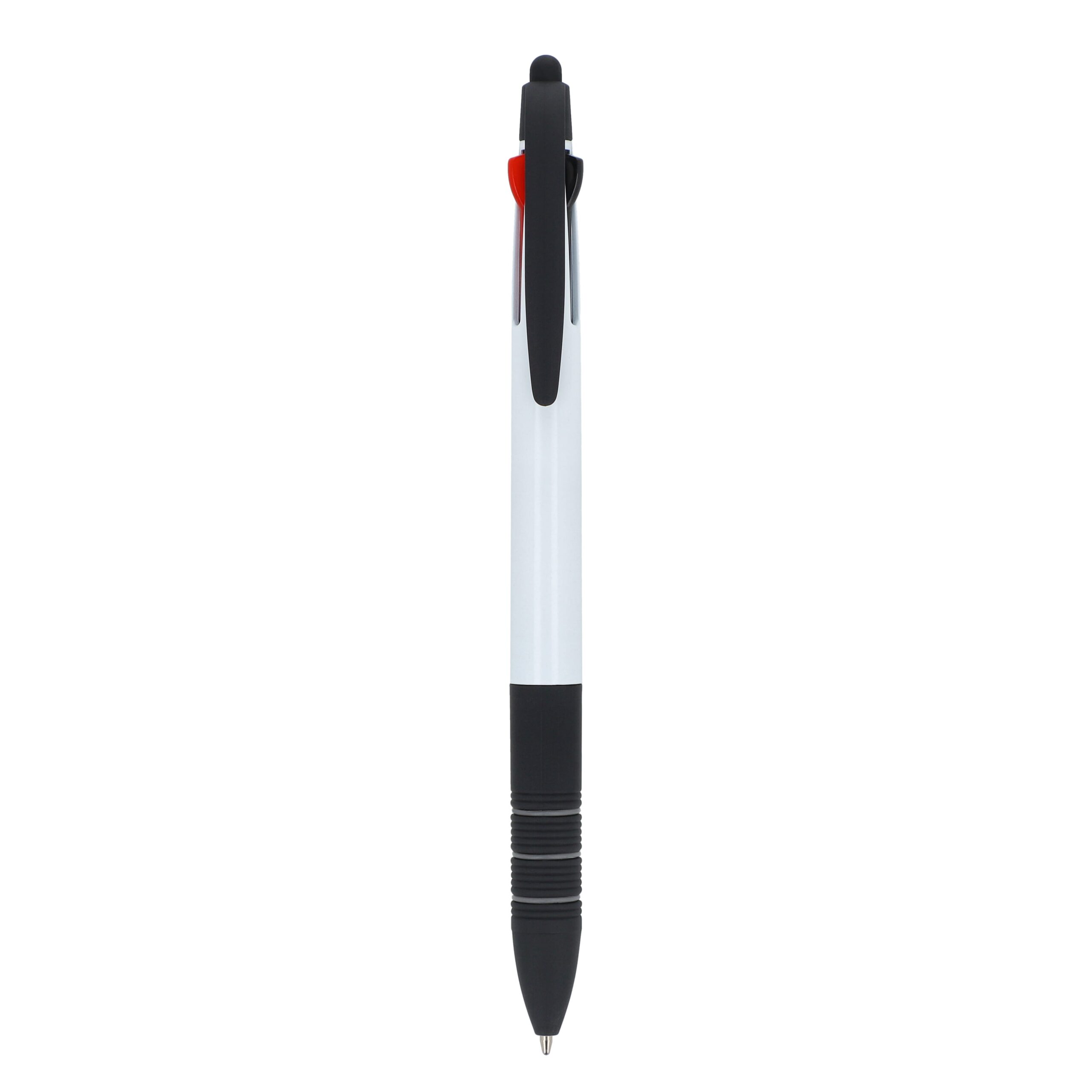 3-farbiger Kugelschreiber mit Stylus und weichem Ergogriff. Die Schreibfarben sind Schwarz, Blau und Rot.