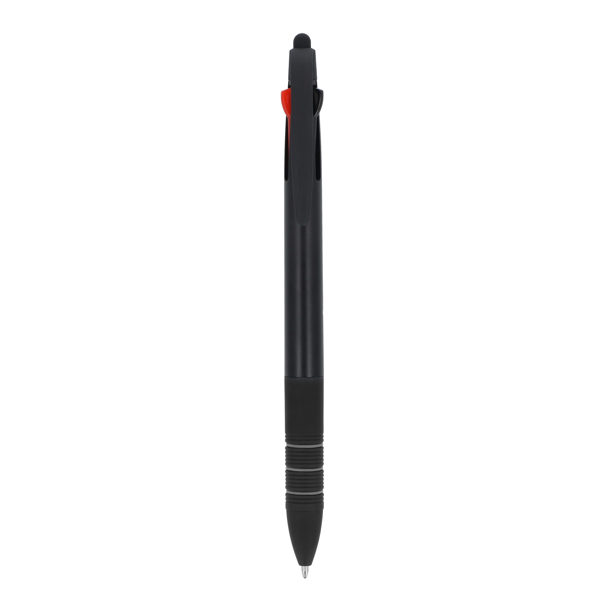 3-farbiger Metallic-Kugelschreiber mit Stylus und weichem Ergogriff. Die Schreibfarben sind Schwarz, Blau und Rot.