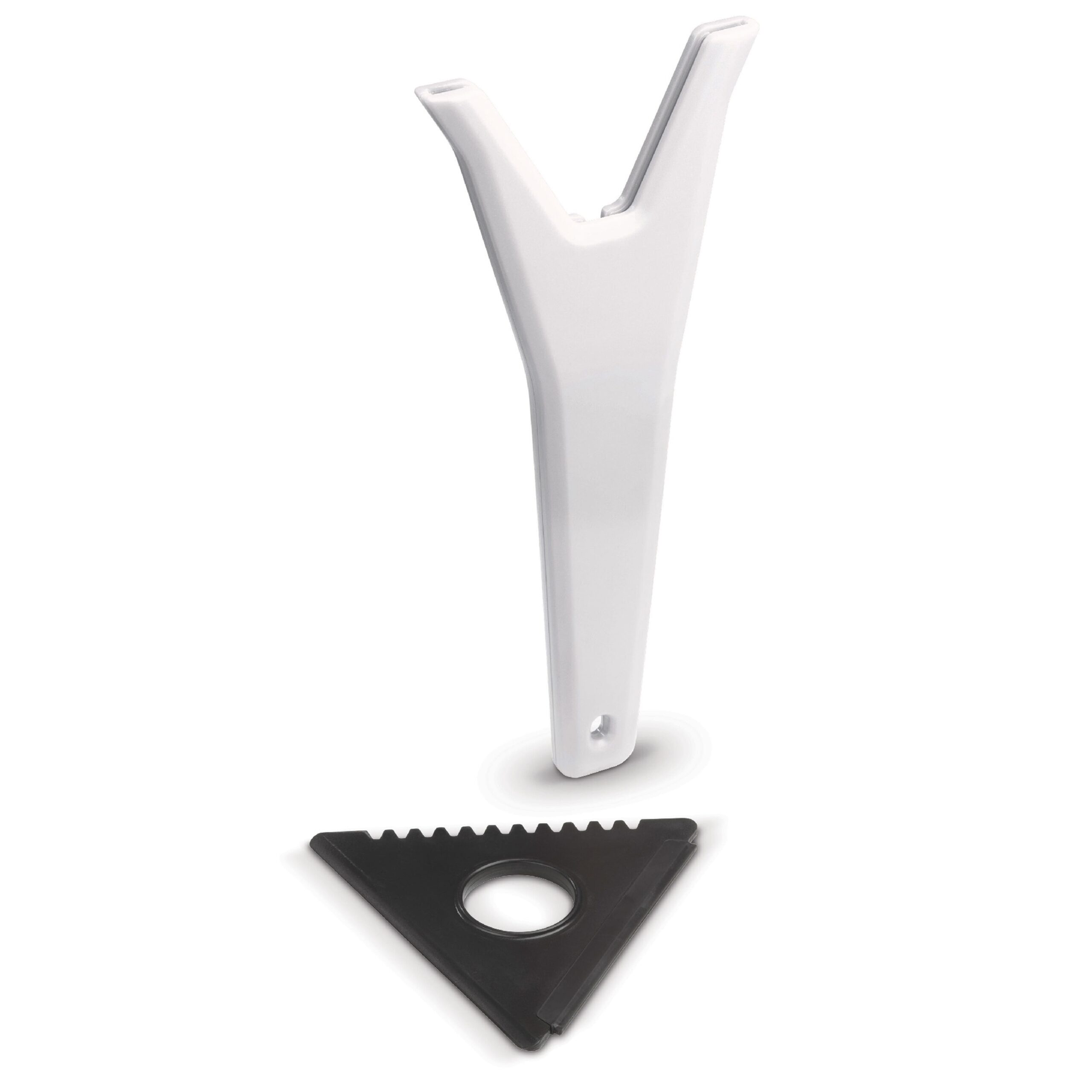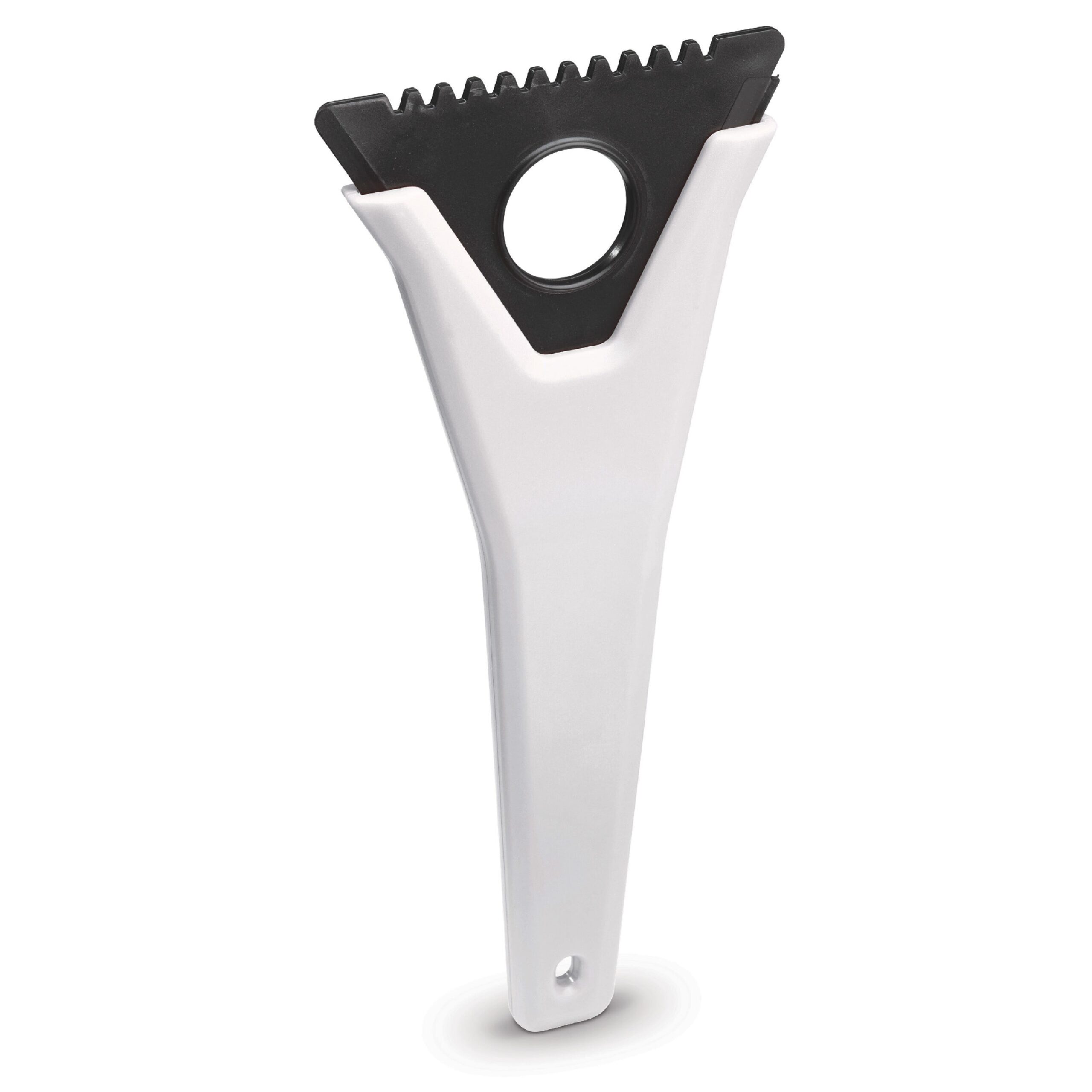 Handlicher Eiskratzer mit austauschbarem Dreieck zum Entfernen von Schnee, Eis und Kondenswasser. Der Griff hat eine große Druckfläche für ein Logo.
