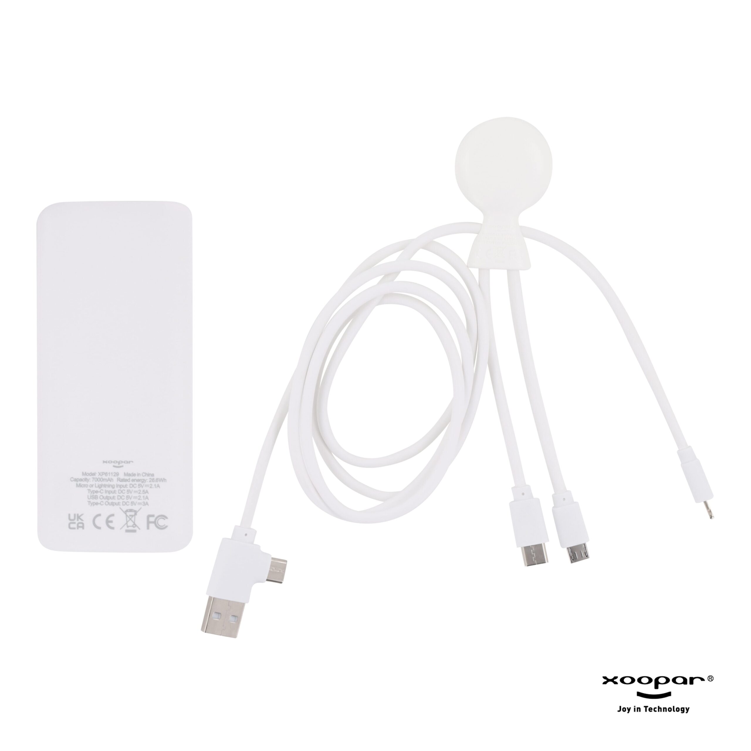 Nachhaltiges Produktset, Kabel und Batteriehalter sind aus recyceltem Kunststoff hergestellt. Tragbarer Akku mit 7000 mAh, kann Ihr Telefon bis zu 2,5 Mal aufladen. Tragbarer Multikabel-Adapter mit USB, Lightning, Typ C, Micro-USB.