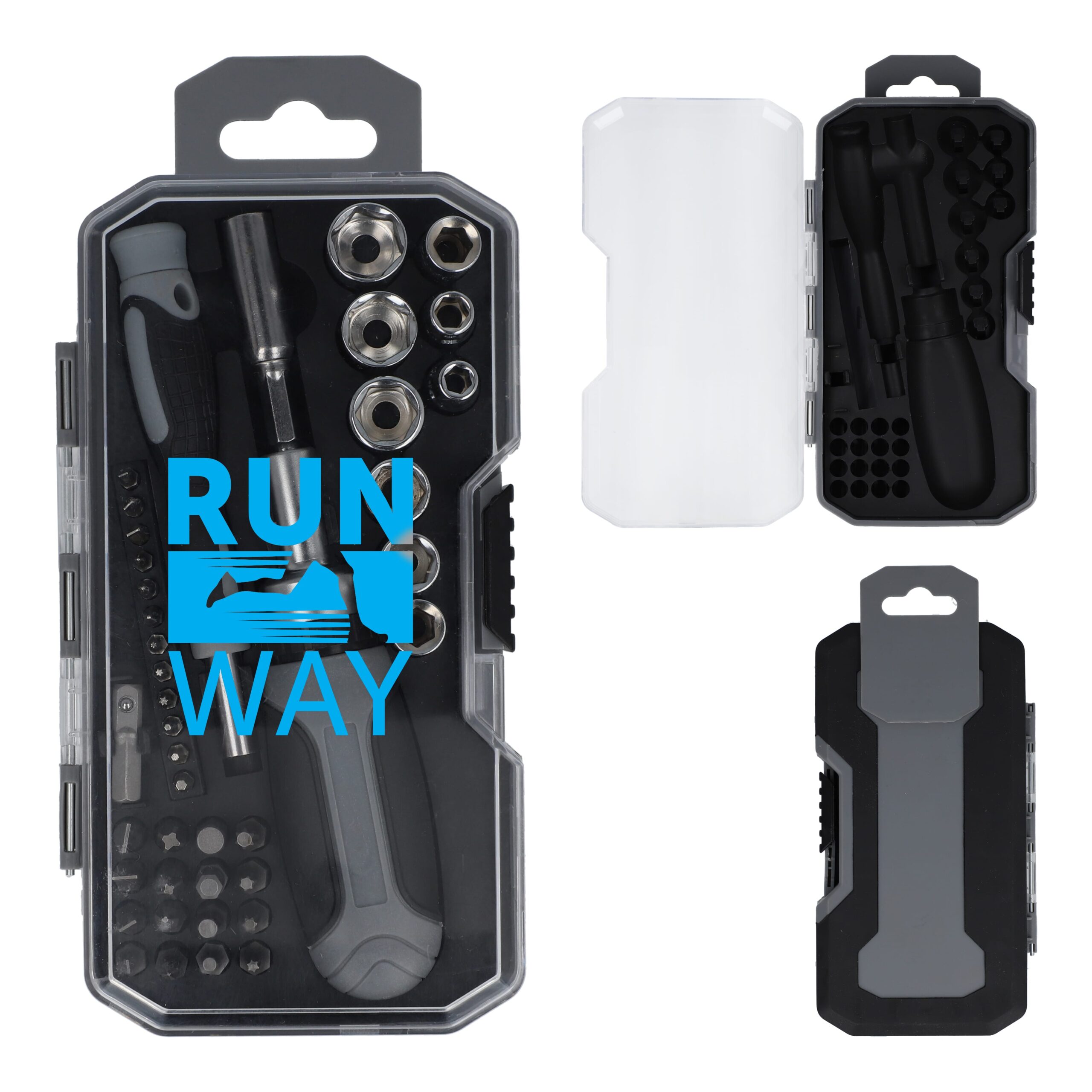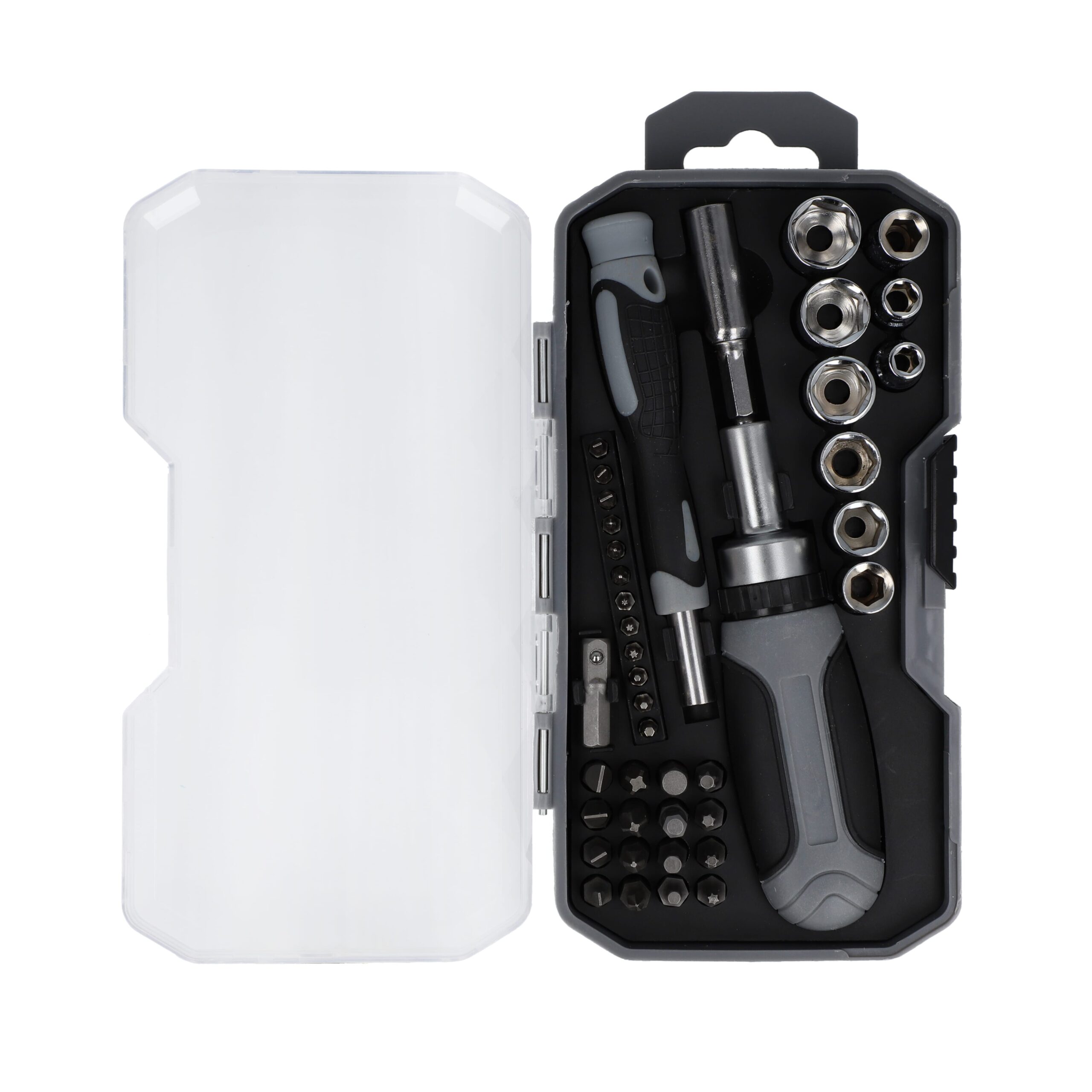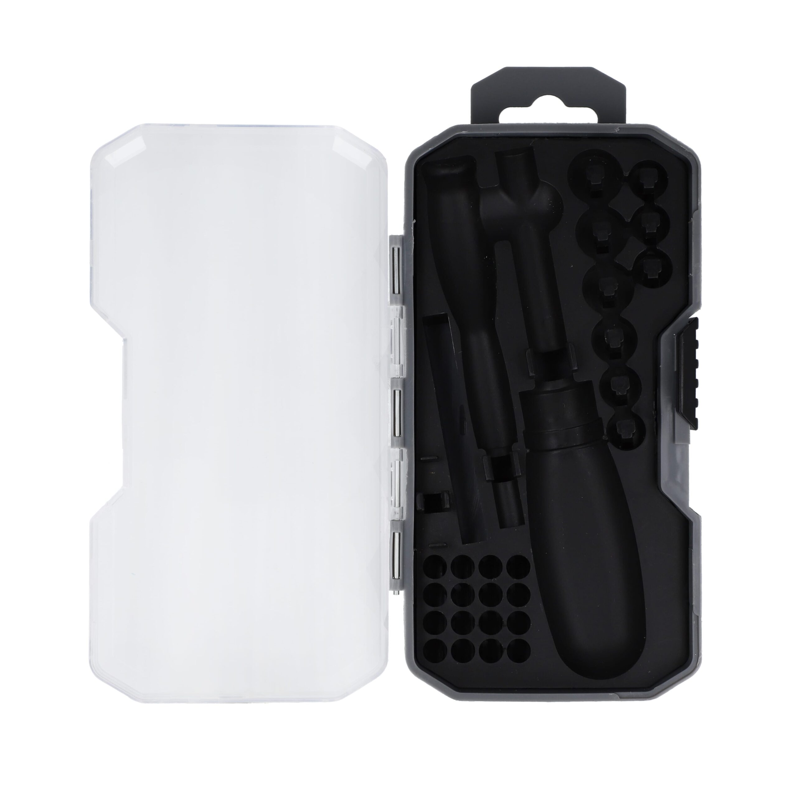 Umfassendes 41-teiliges Werkzeugset: 1 x 60-mm-Schraubendreheranschluss; 1 x Schraubendrehergriff; 1 x Ratschenschraubendreher; 1 x 24-mm-AD; 9 x 1/4-Zoll Steckschlüssel; 16 x 25-mm-Schraubendreherbits; 12 x 28-mm-Schraubendreherbits
