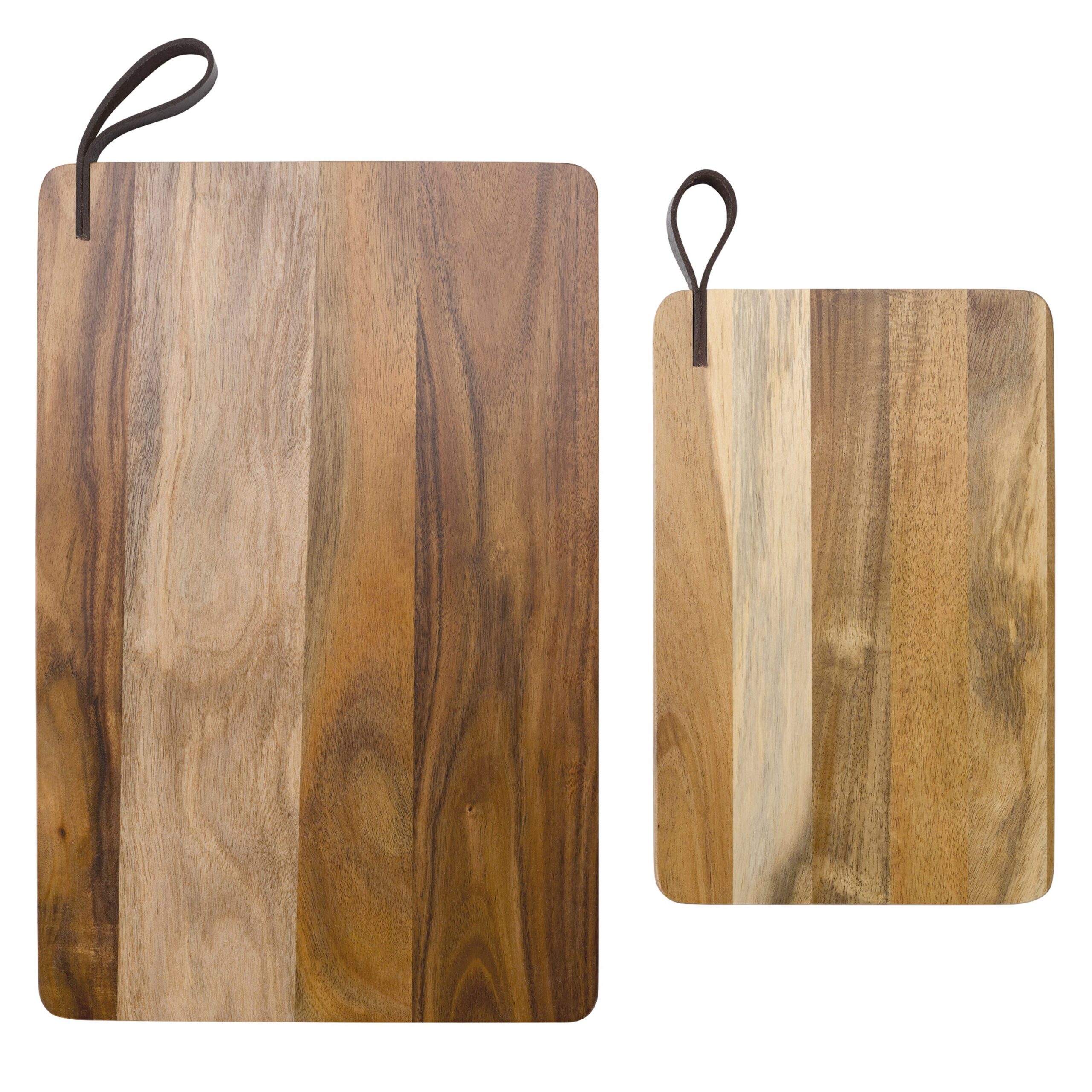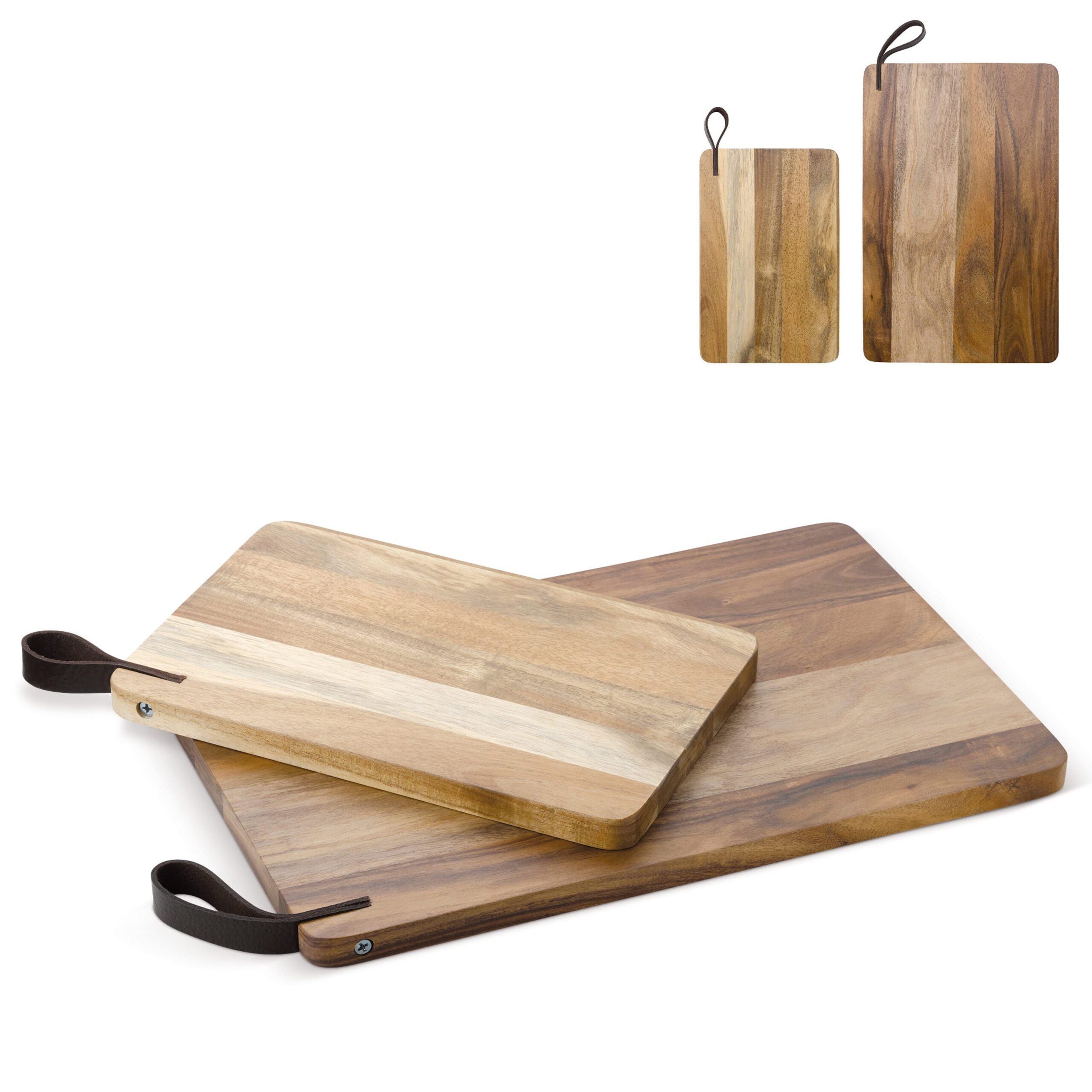 Zwei hochwertige Schneidebretter aus Akazienholz. Es kann als Schneidebrett verwendet werden, sieht aber auch als Snack-Servierplatte toll aus. Luxuriöse Ausführung mit einer Lederschlaufe an der Oberseite und verpackt in einem Geschenkkarton.