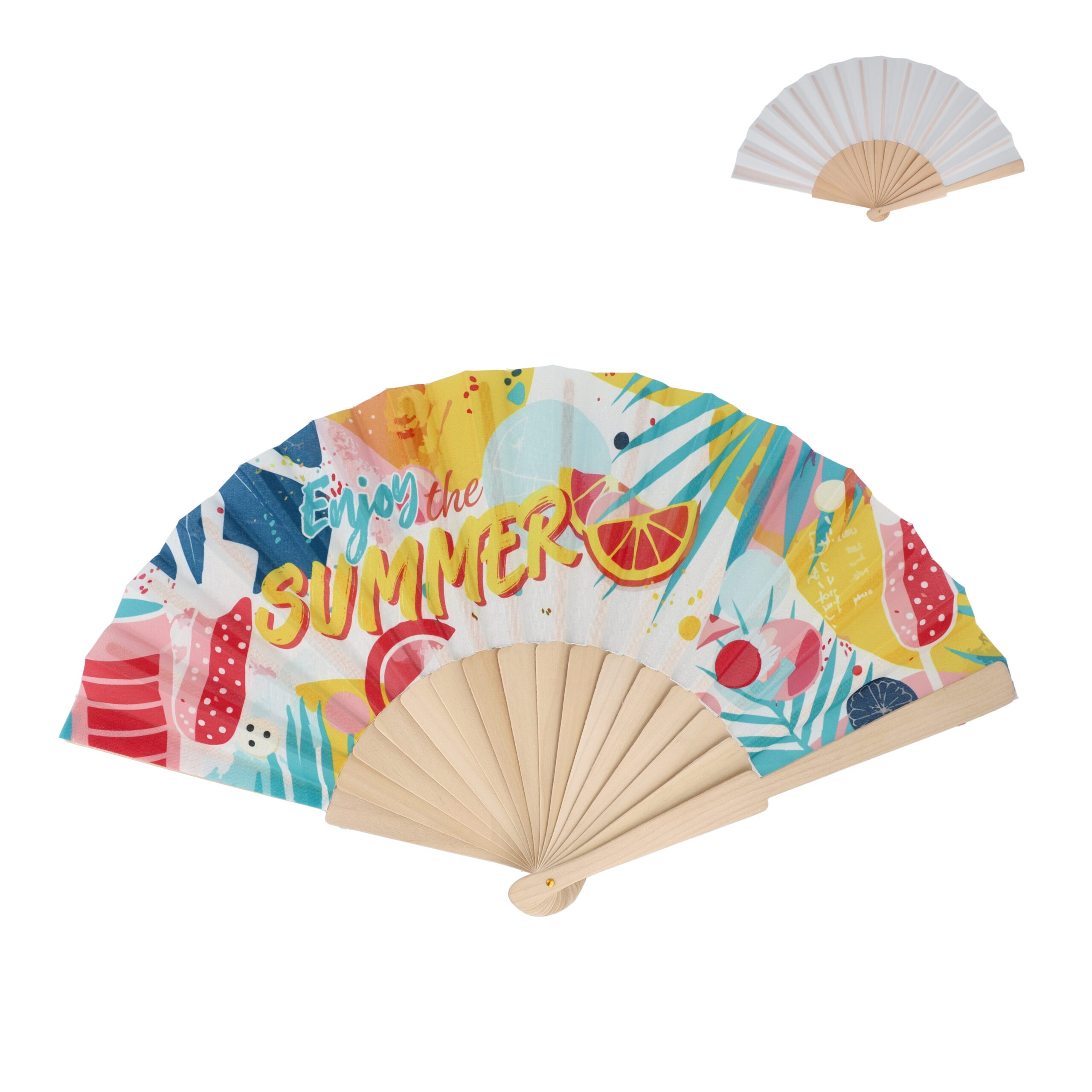 Besiegen Sie die Hitze mit einem Fächer aus Holz und R-PET. Erhältlich in verschiedenen leuchtenden Farben und mit einem Holzgriff; ideal für Veranstaltungen im Freien und heiße Sommertage.
