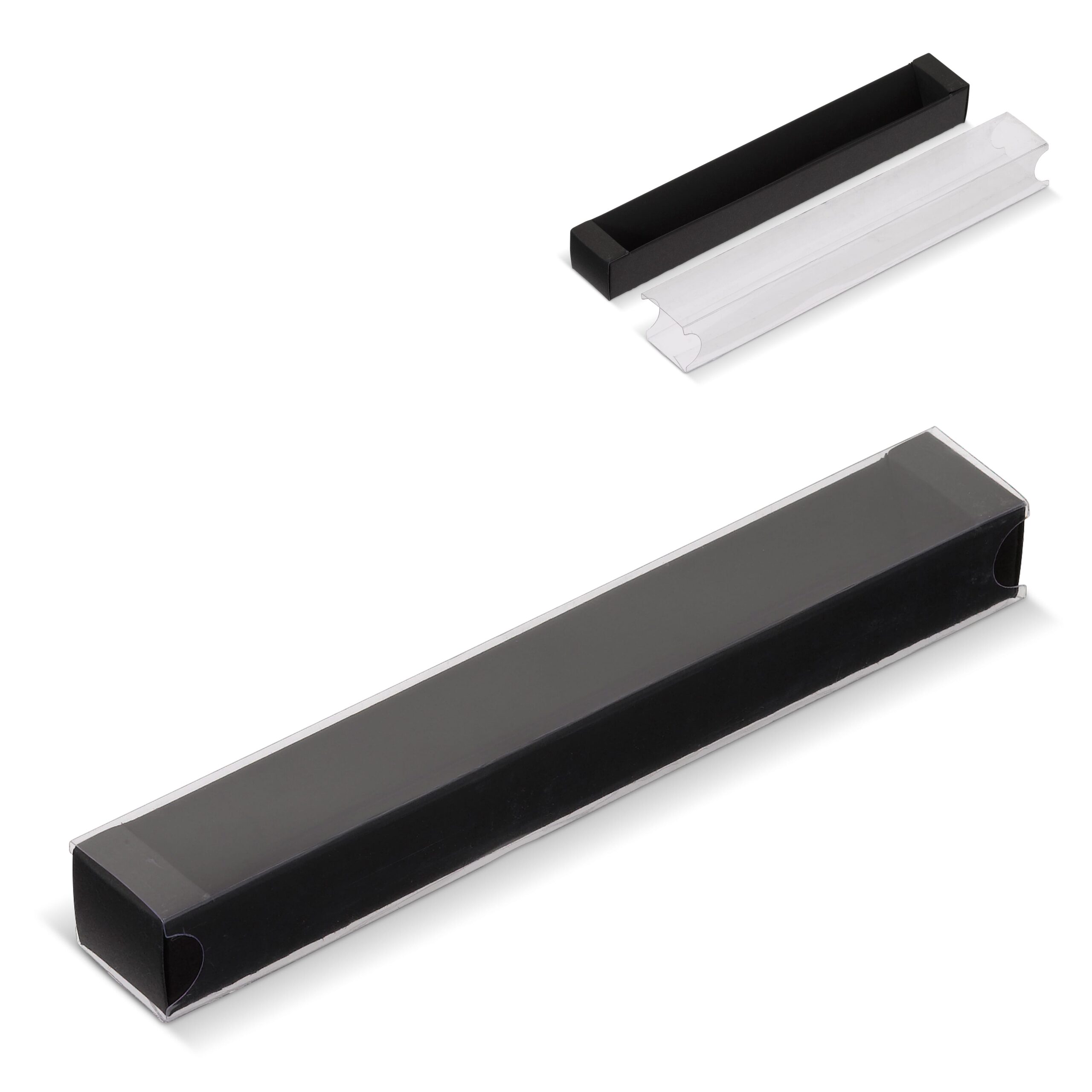 Schwarze Geschenkverpackung mit transparenter Schutzhülle für einen Kugelschreiber.