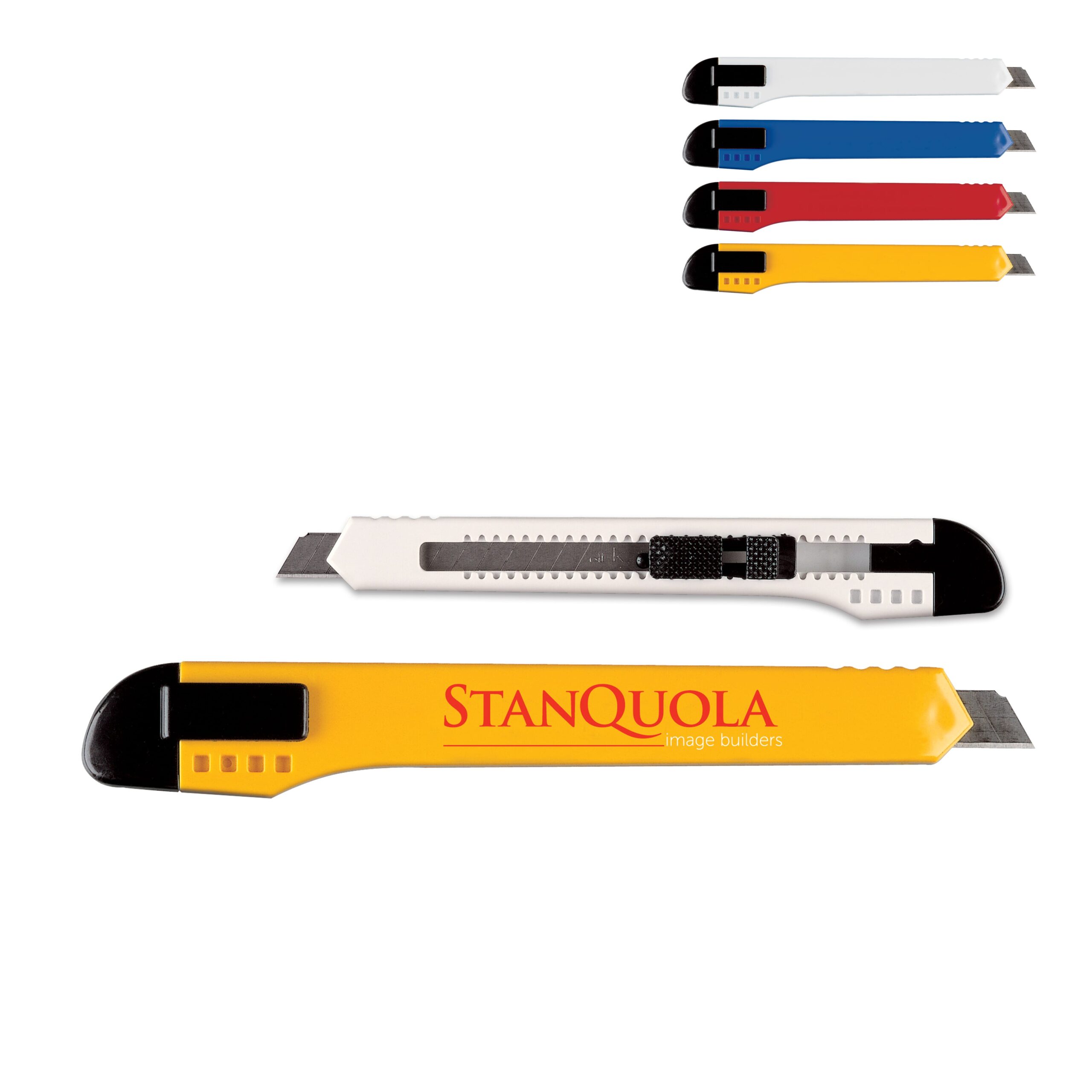 Hobbymesser mit zwölf Abbrechklingen und einer Clip-Befestigung. Die Breite der Klinge beträgt 9 mm.