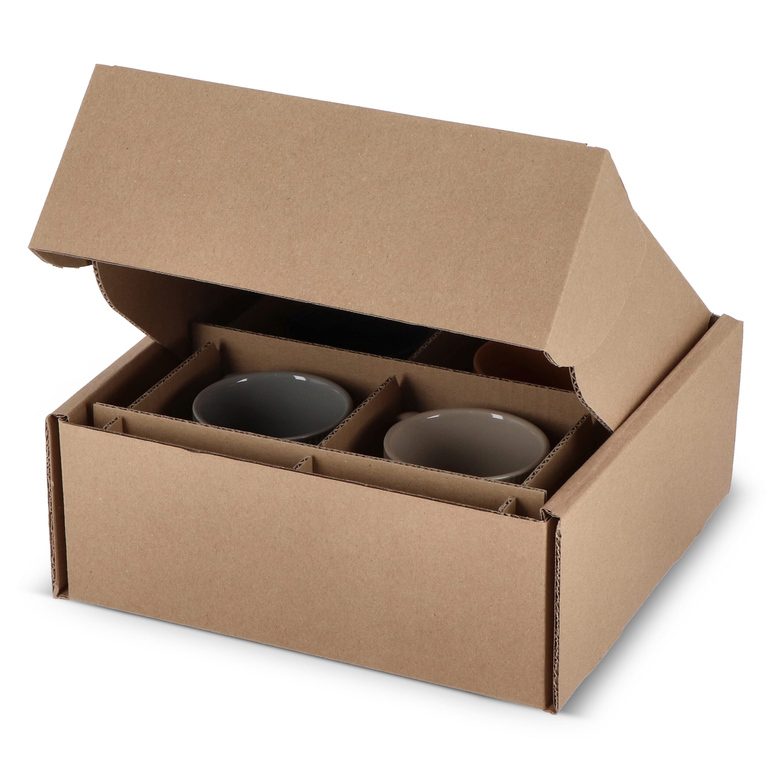 Geschenkkarton für 4 Tassen. Inklusive Kartongitter. Ganzflächiger Digitaler-Eco-Druck möglich. FSC-zertifiziert. Hergestellt in Europa