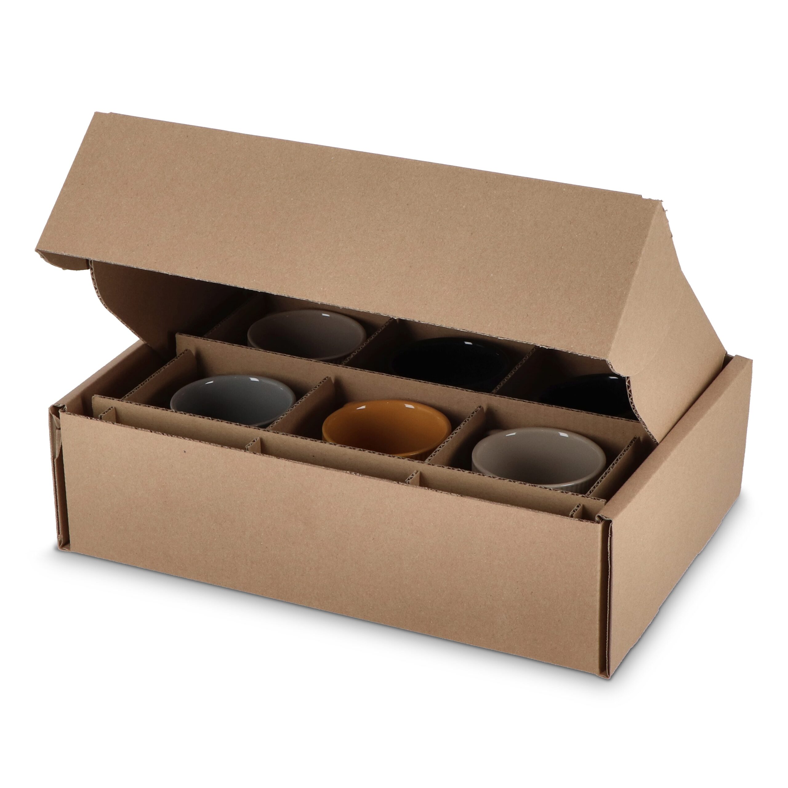 Geschenkkarton für 6 Tassen. Inklusive Kartongitter. Ganzflächiger Digitaler-Eco-Druck möglich. FSC-zertifiziert. Hergestellt in Europa.