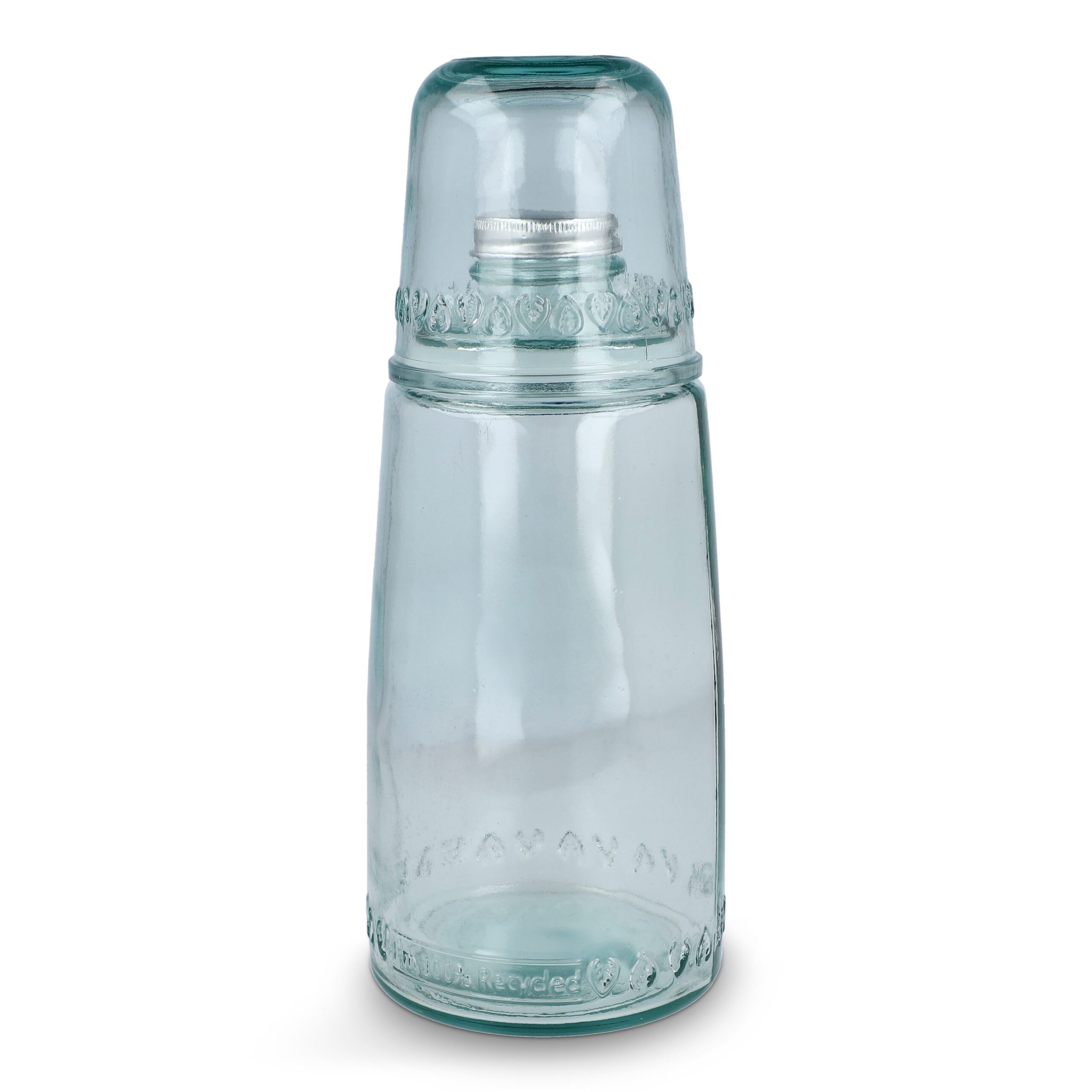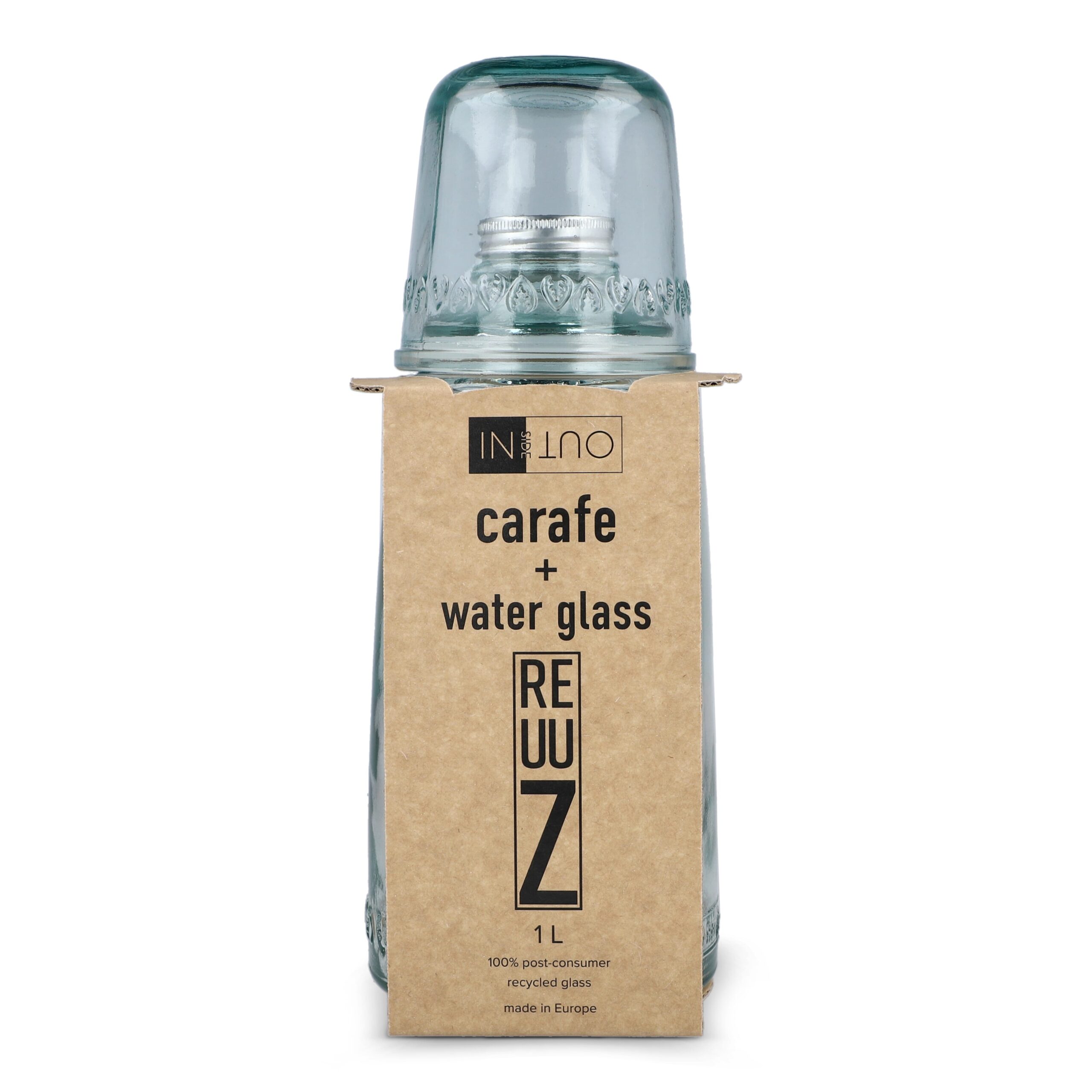 Die InSideOut ReuuZ 1-Liter-Karaffe mit Metallverschluss und passendem Glas (aufsitzbar) wird in Europa aus 100 % recyceltem Altglas gefertigt. Sie betont den einzigartigen Charakter des Materials. Mit schlichtem, natürlichem Design ist sie ein verantwortungsbewusstes Produkt für Hydration zu Hause oder im Büro.
