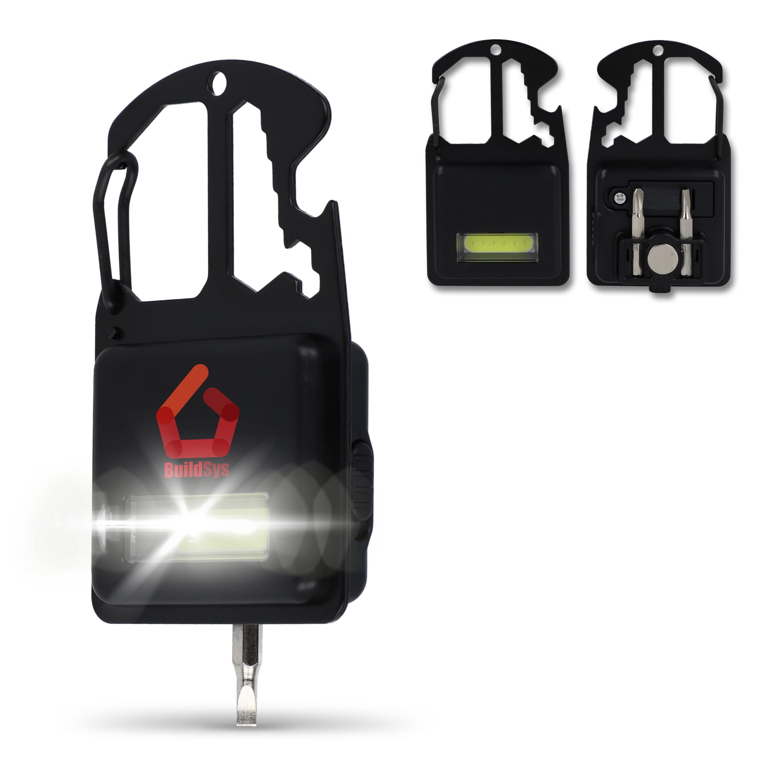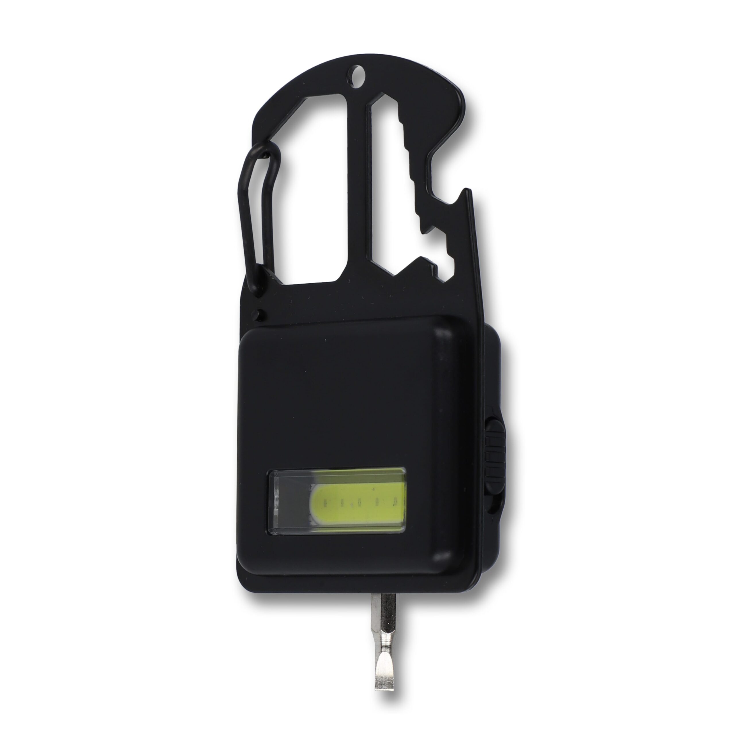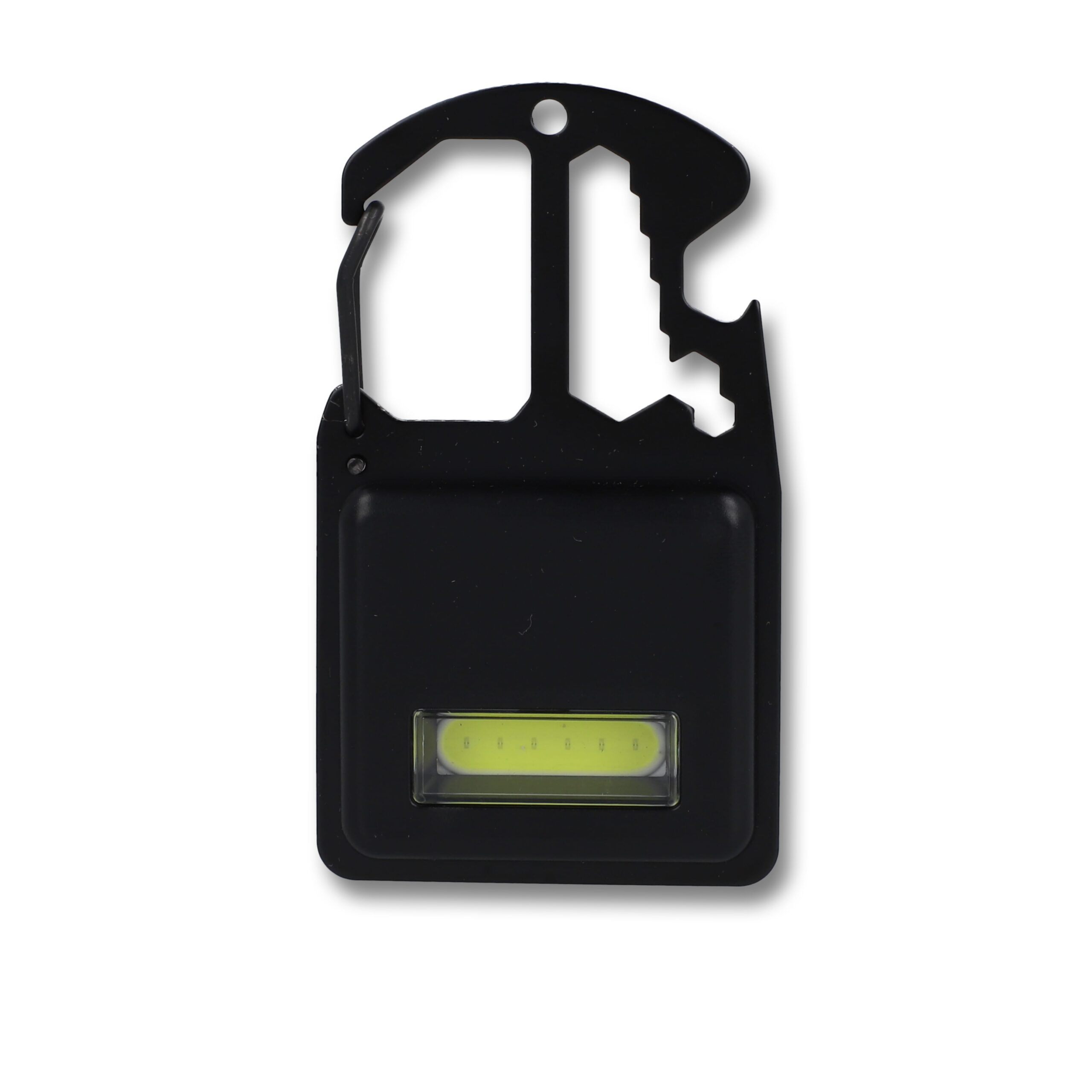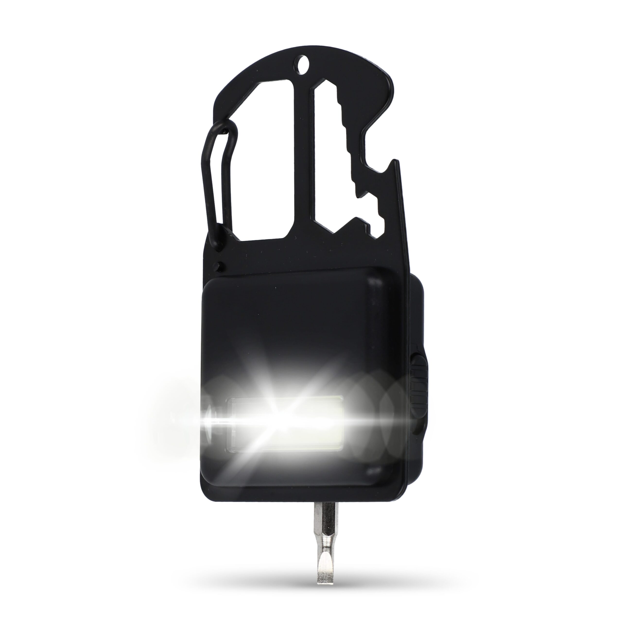 Befestigen Sie dieses handliche, taschengroße, multifunktions Werkzeug an Ihrer Tasche oder Ihrem Gürtel, oder verwenden Sie den Magneten, um es an einer beliebigen magnetischen Fläche für freihändigen Einsatz des Lichts zu befestigen. Dieses Werkzeug enthält fünf zusätzliche Funktionen: Flaschenöffner, Maulschlüssel, COB-Licht, Kreuzschlitzschraubendreher und Flachkopfschraubendreher.