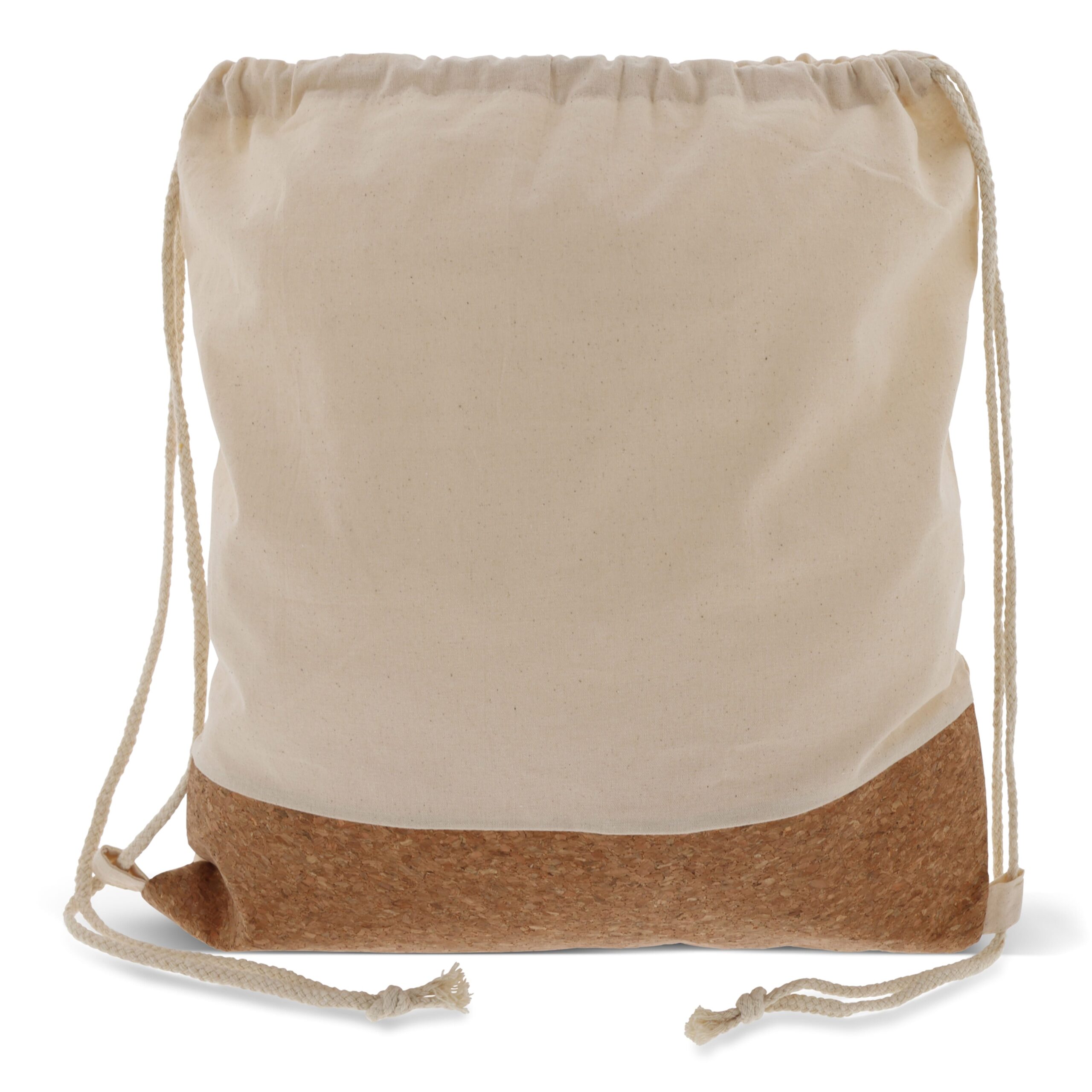 Rucksackbeutel aus Baumwolle und Kork. Einfach und bequem um auf dem Rücken zu tragen.