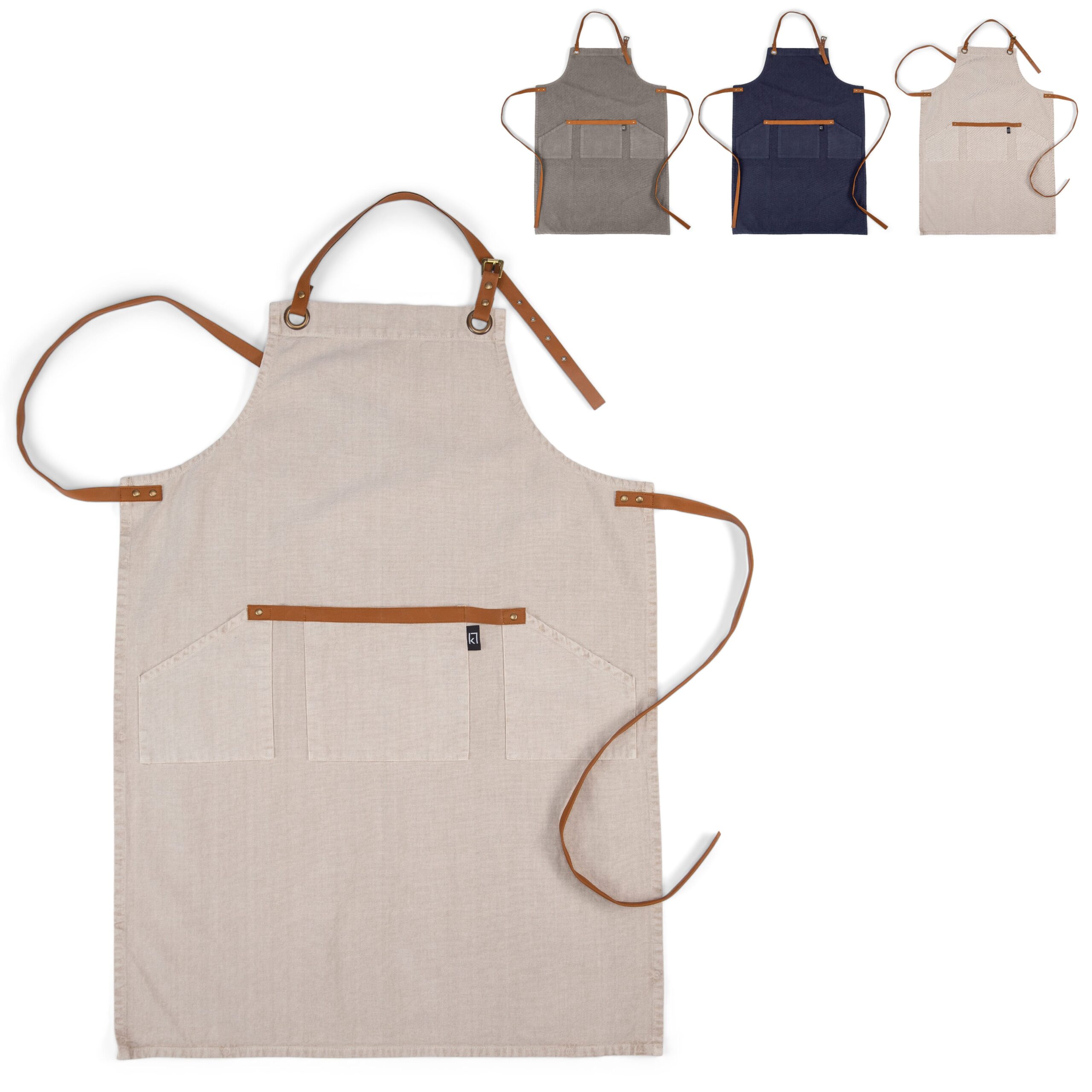 Schürze aus reiner Baumwolle mit verstellbarem Band im Nacken und drei Taschen in der Taille. Riemen und Details aus PU-Leder.