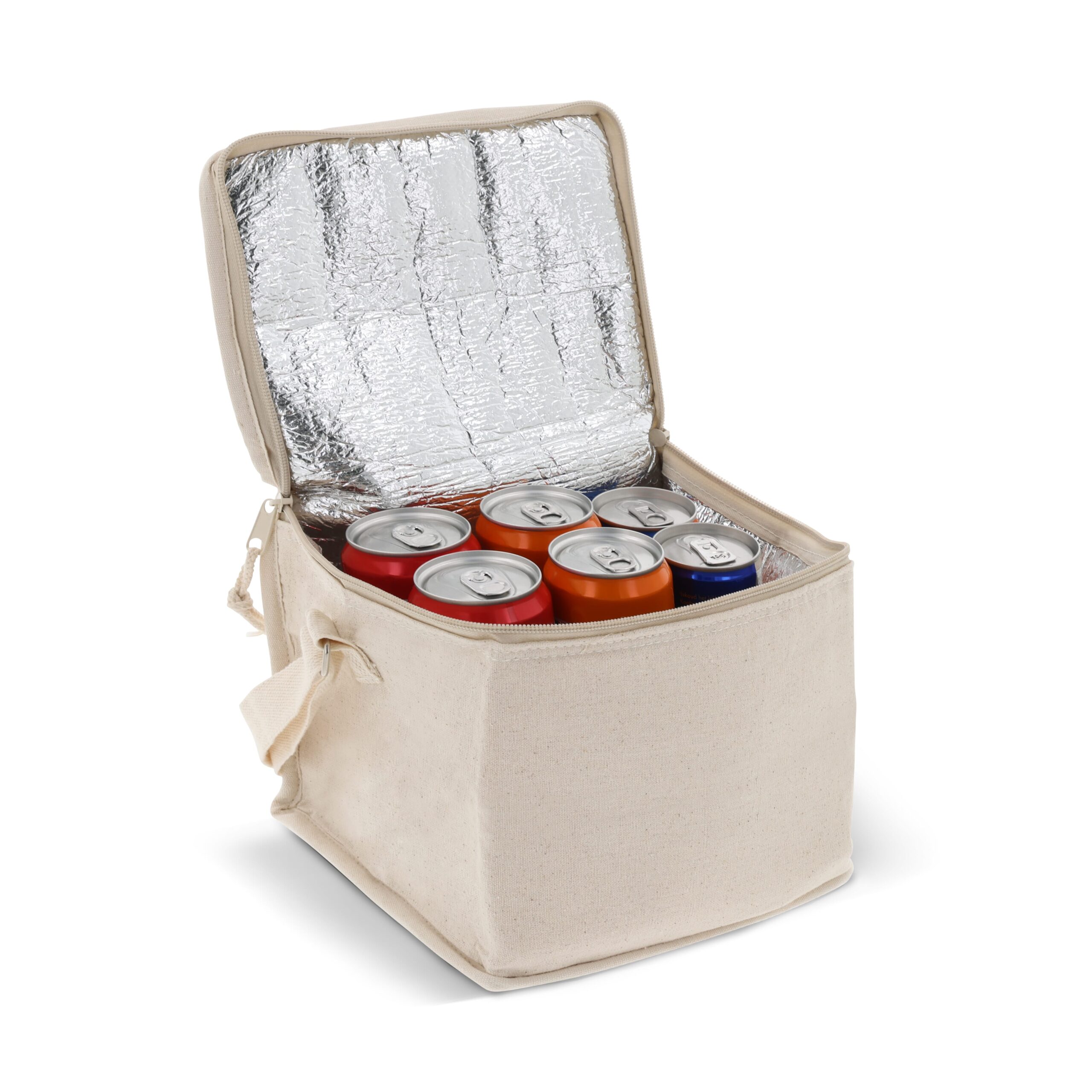 Diese Kühltasche mit einer Aussenhülle aus 100 % Baumwolle ist perfekt, um Ihre Produkte kühl zu halten. Der Tragegriff erleichtert Ihnen den Transport.