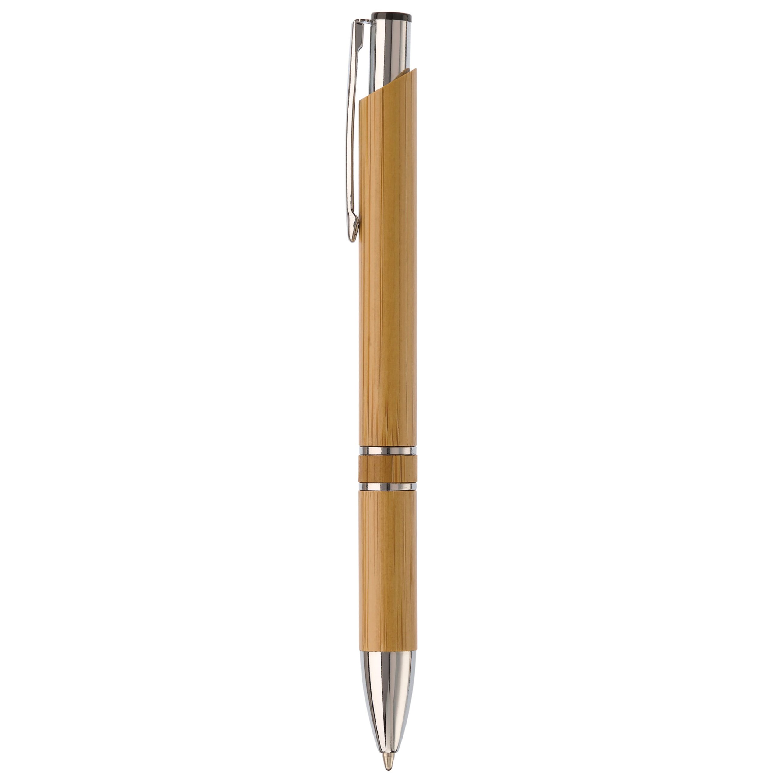 Kugelschreiber aus Bambus mit Metallclip und metallisierter Spitze. Der Kugelschreiber hat eine schwarzschreibende Mine.