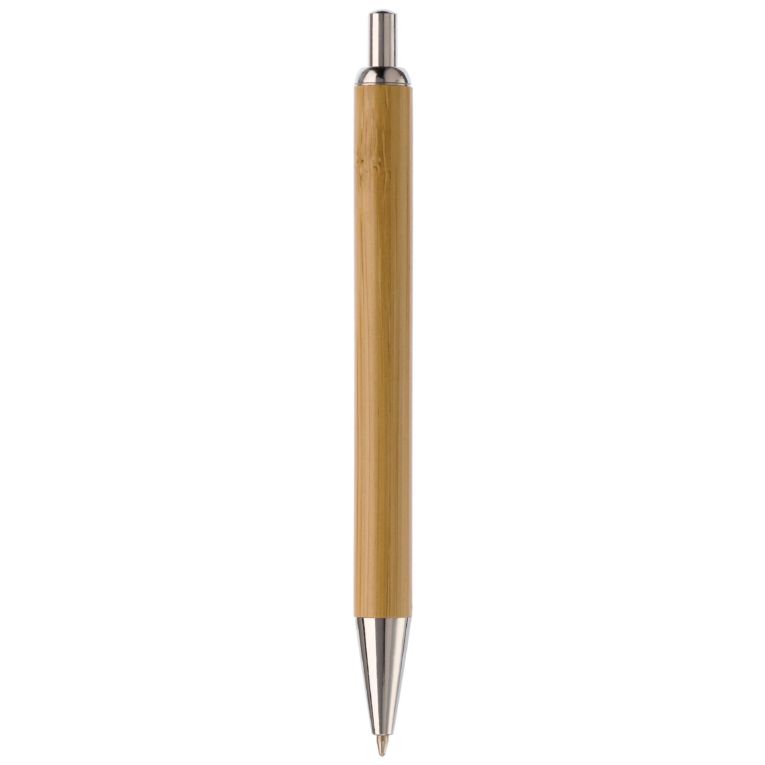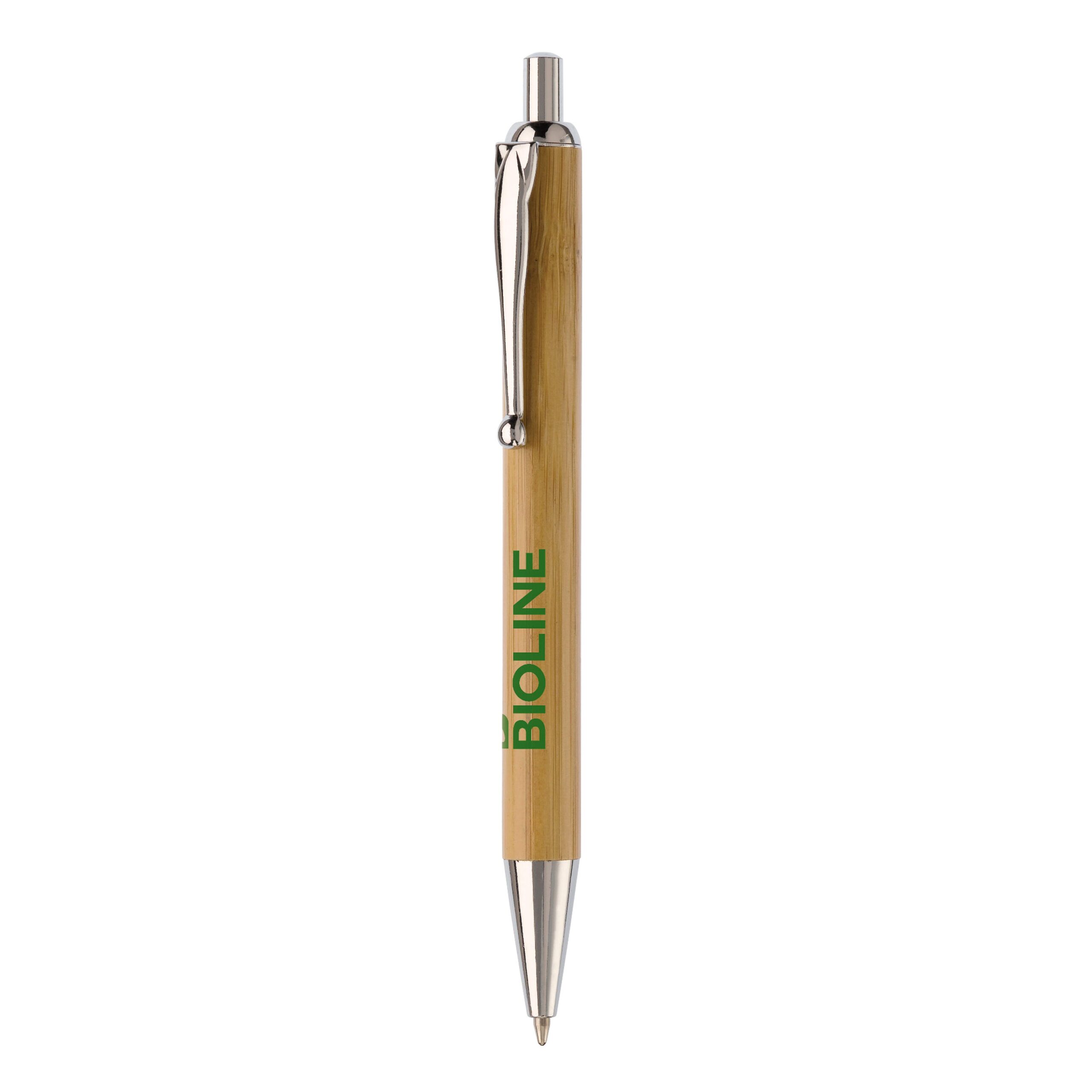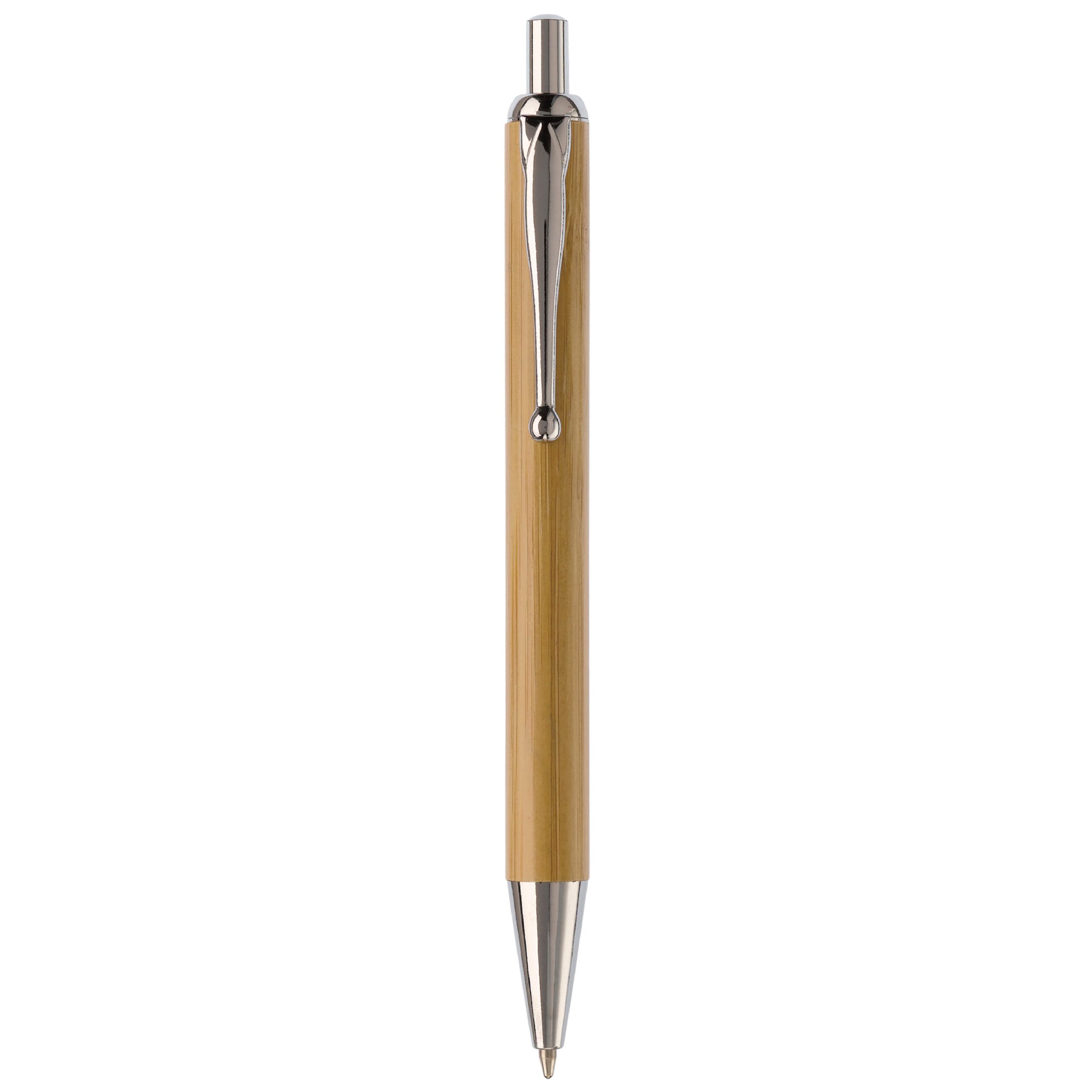 Kugelschreiber aus Bambus mit Metallclip und metallisierter Spitze. Der Kugelschreiber hat eine schwarzschreibende Mine.