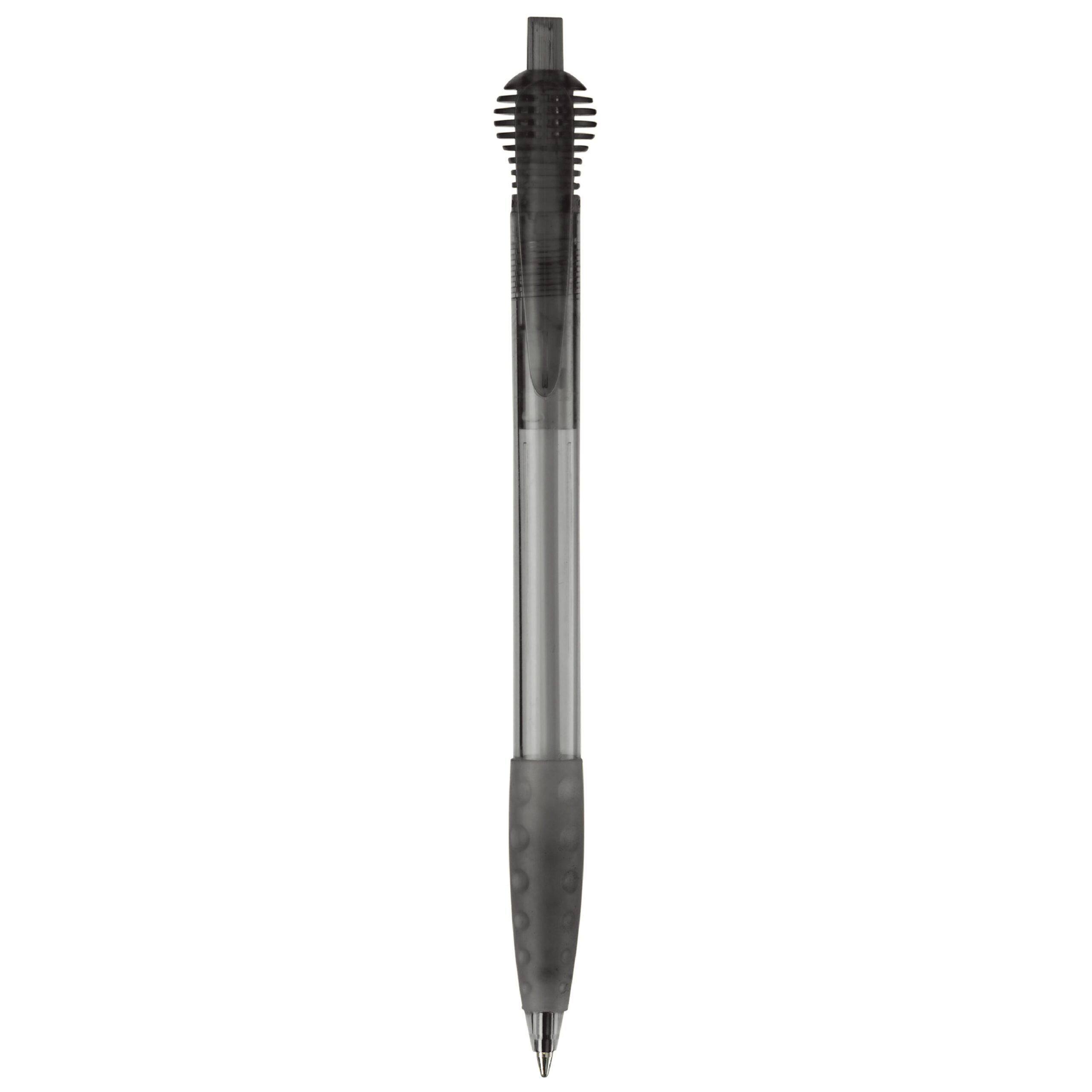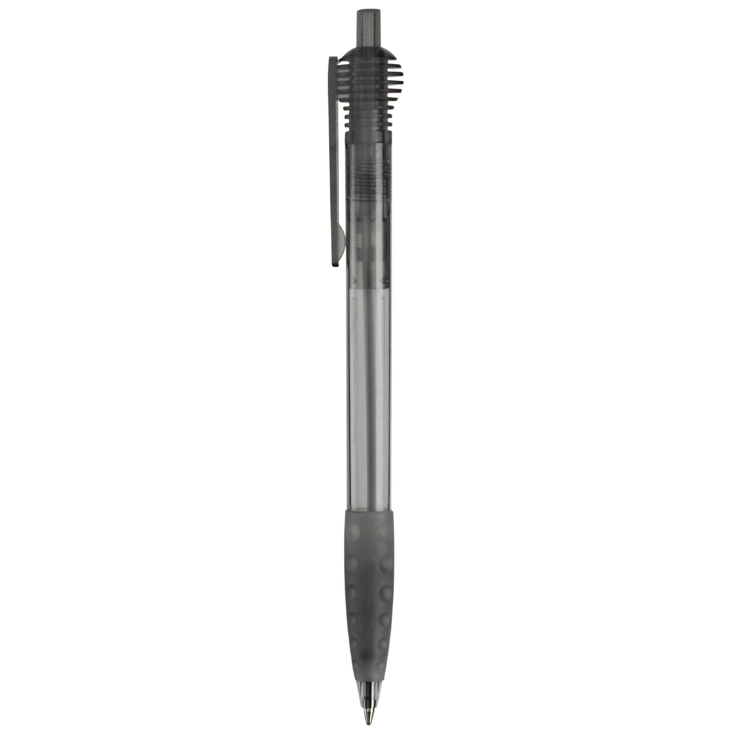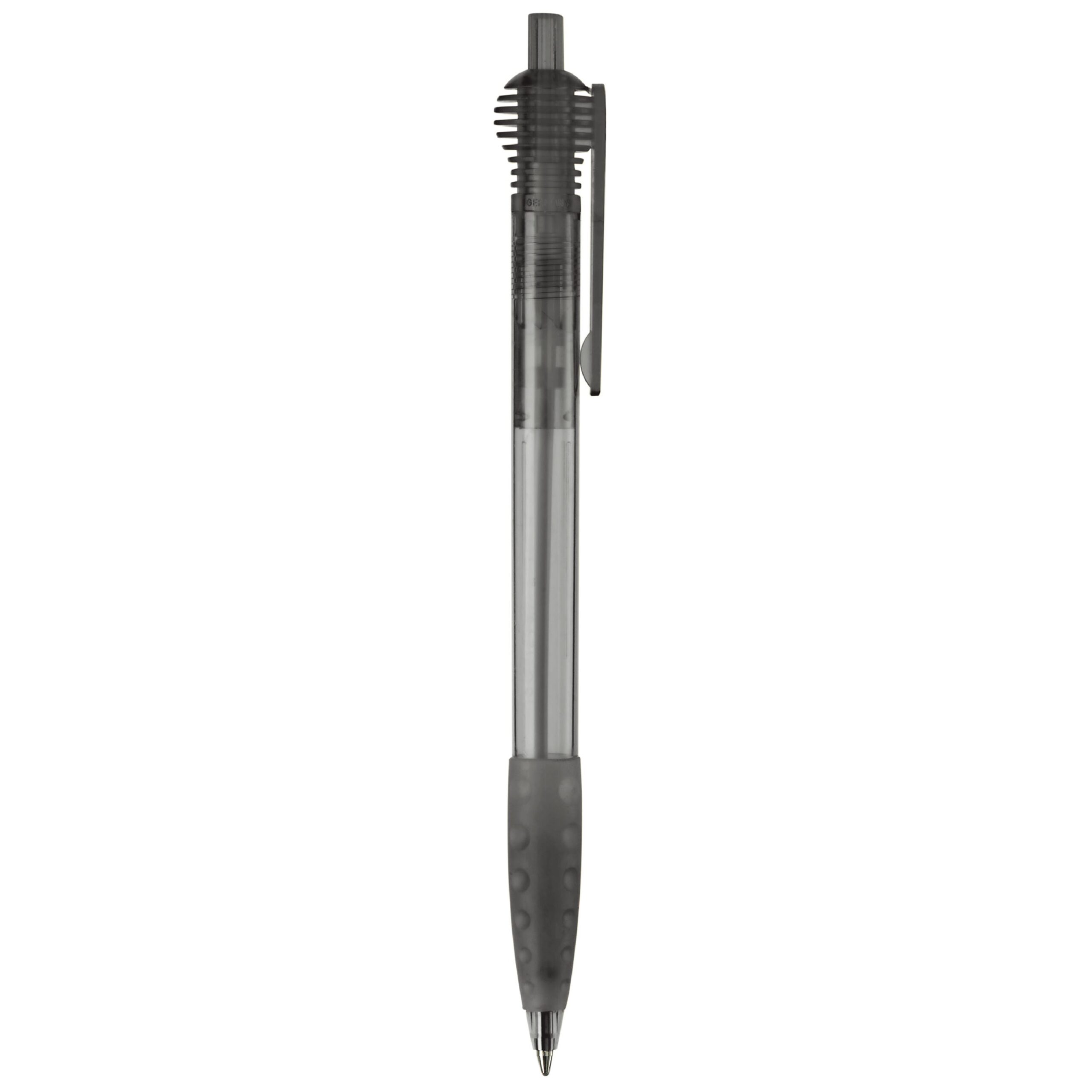Schlanker Toppoint Kugelschreiber mit rundem Clipteil und Gummimanschette. Made in Germany. Ausgestattet mit einer X20-Mine, blauschreibend. Schreibleistung 2,5km Transparent.