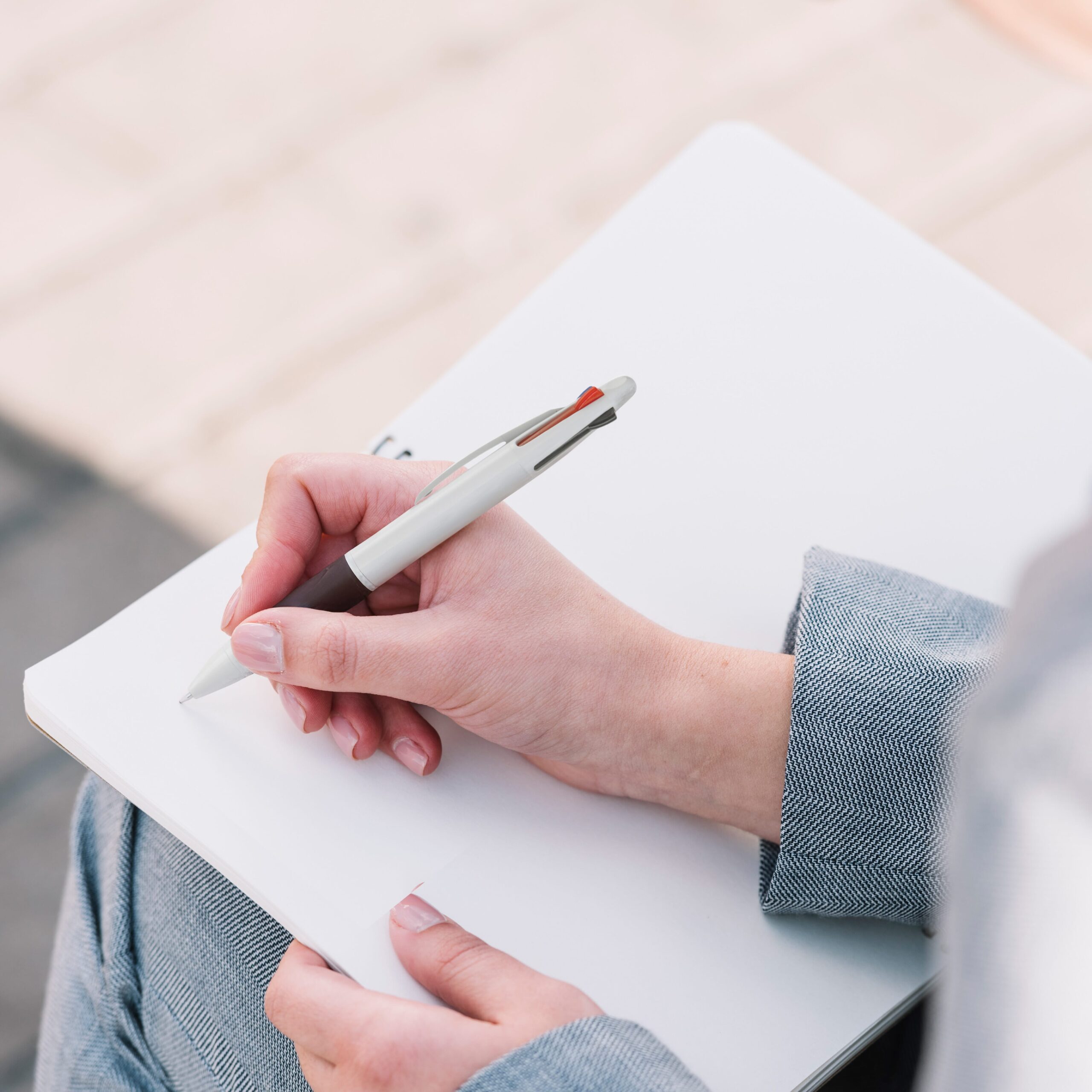 Weißer, Hardcolour Kunststoffkugelschreiber mit farbiger Gummimanschette. 4 Schreibfarben: Blau, rot, schwarz und grün.