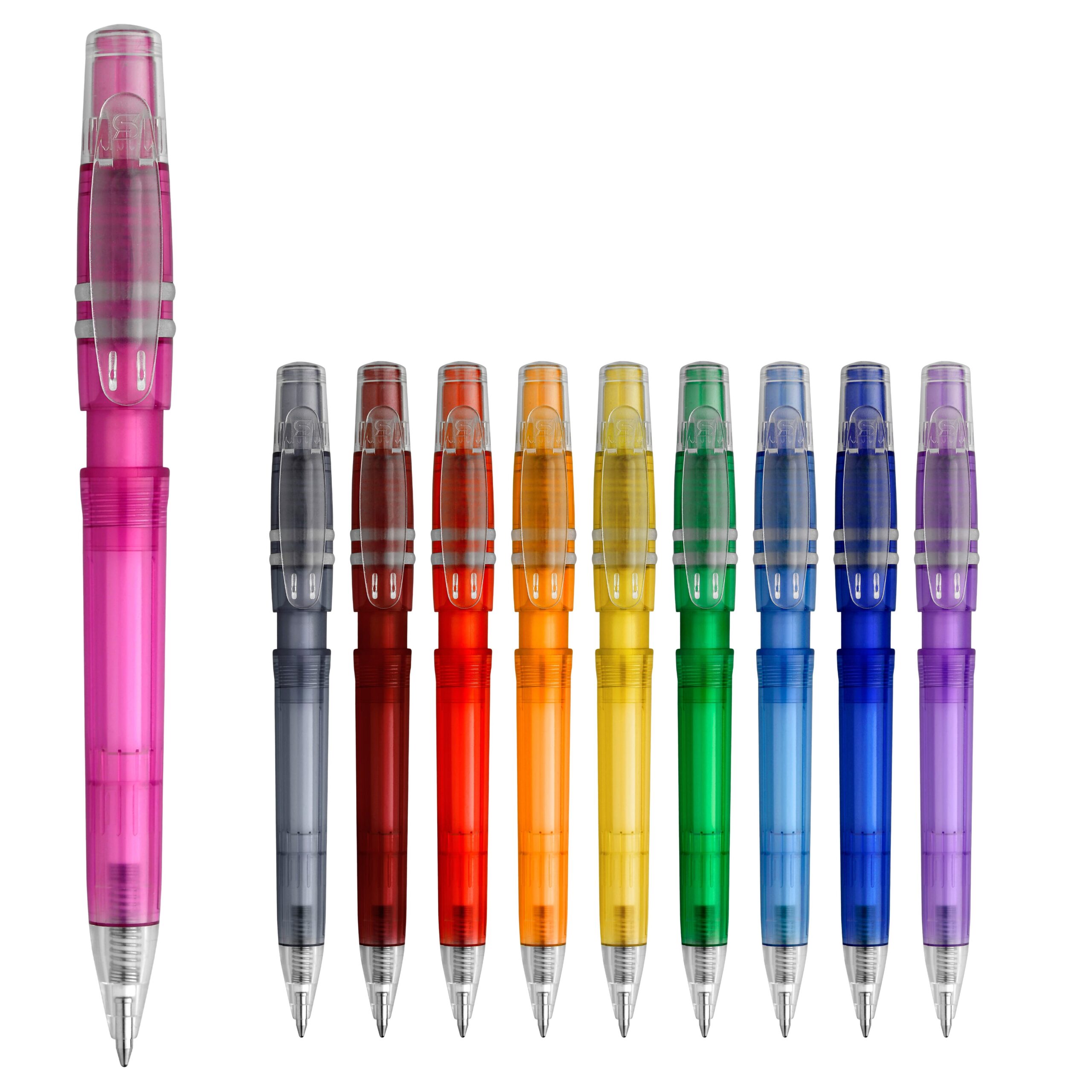 Der transparente Kugelschreiber Nora mit farbigen Schaft und transparentem Clip. Die Ringe im Drücker, der Clip und die Spitze sind klar transparent. Ausgestattet mit einer blau schreibenden Jumbo-Refill-Mine. Der Druckkugelschreiber besteht aus ABS und wird in Europa hergestellt. Ab einer Abnahmemenge von 5.000 Stück sind eigene Farbkombinationen möglich.