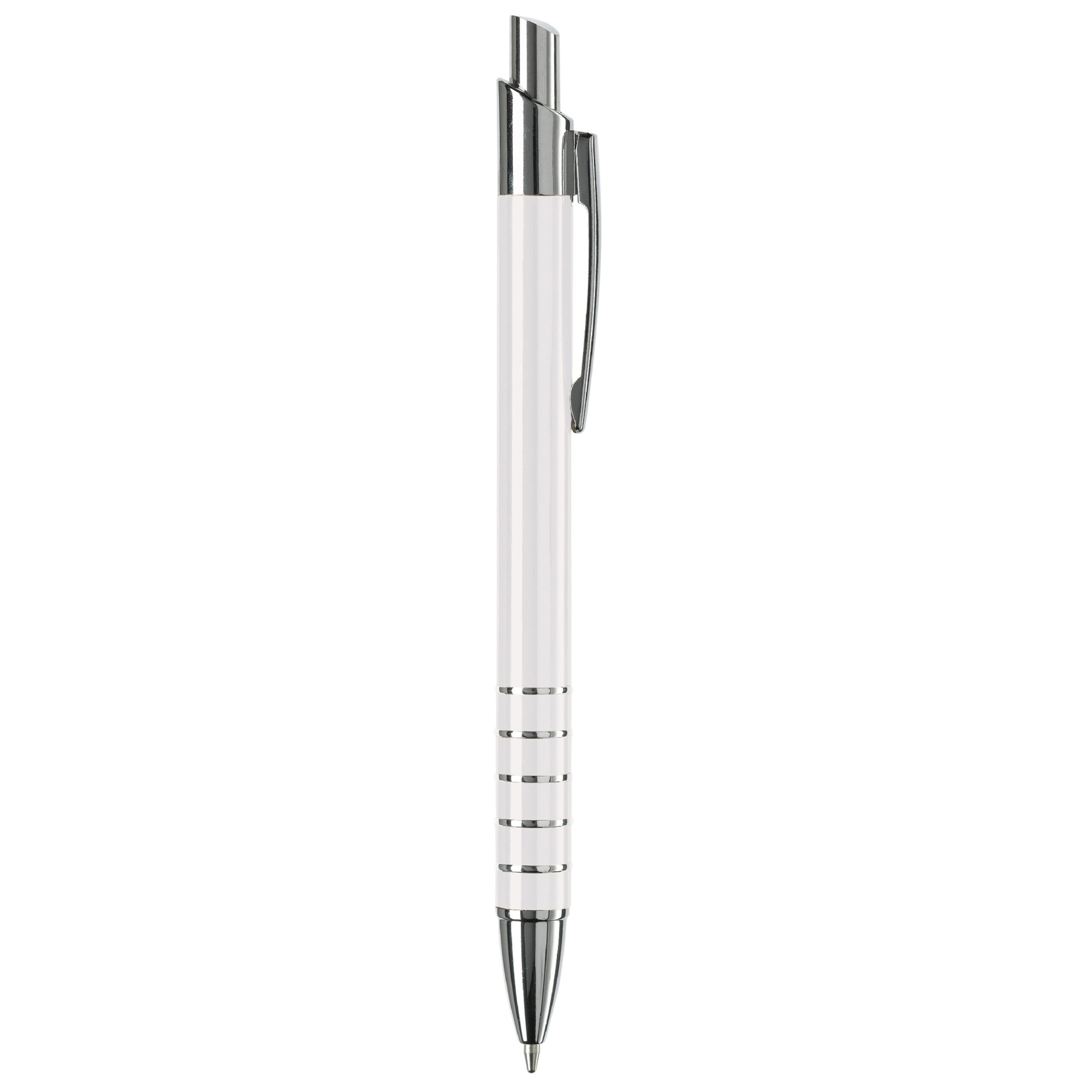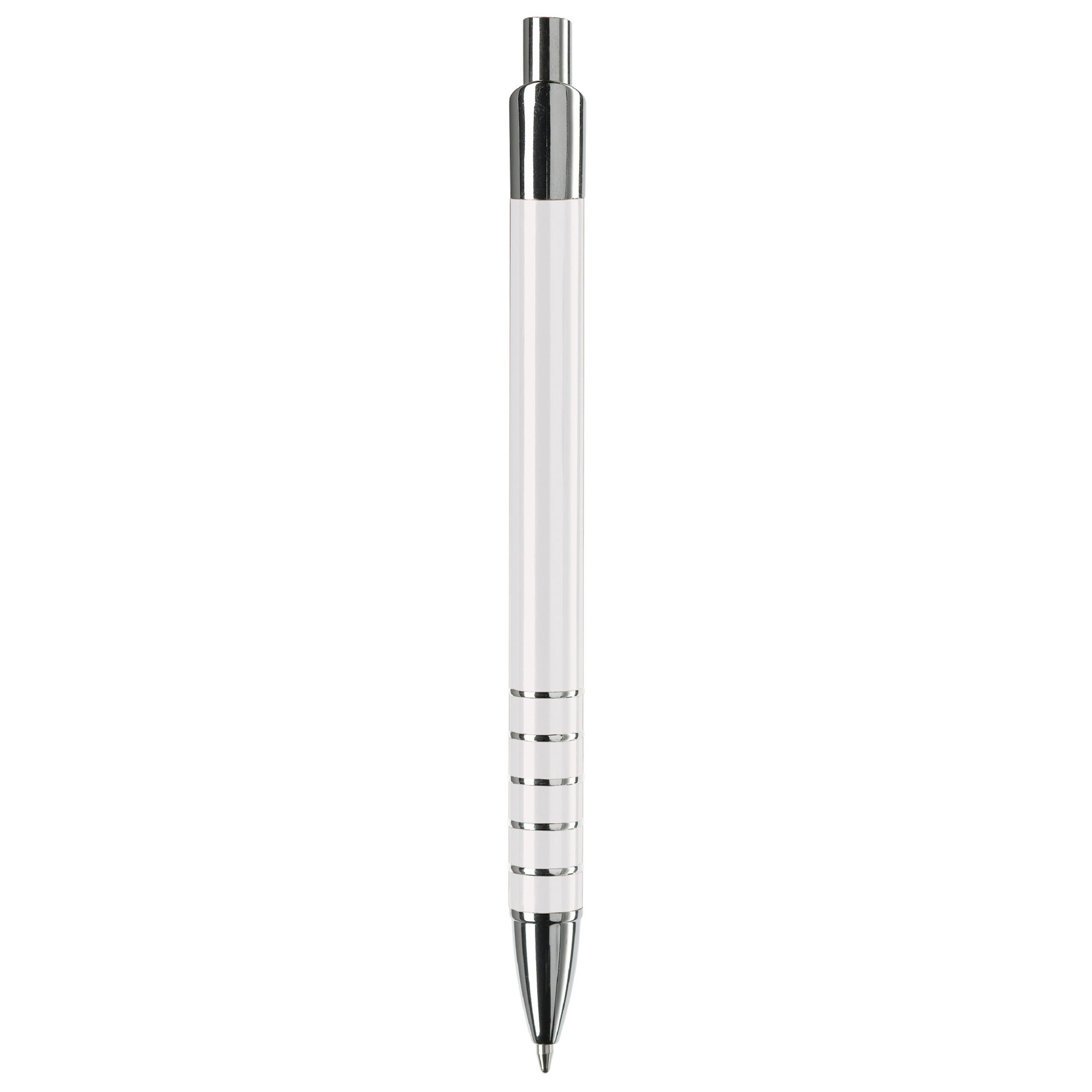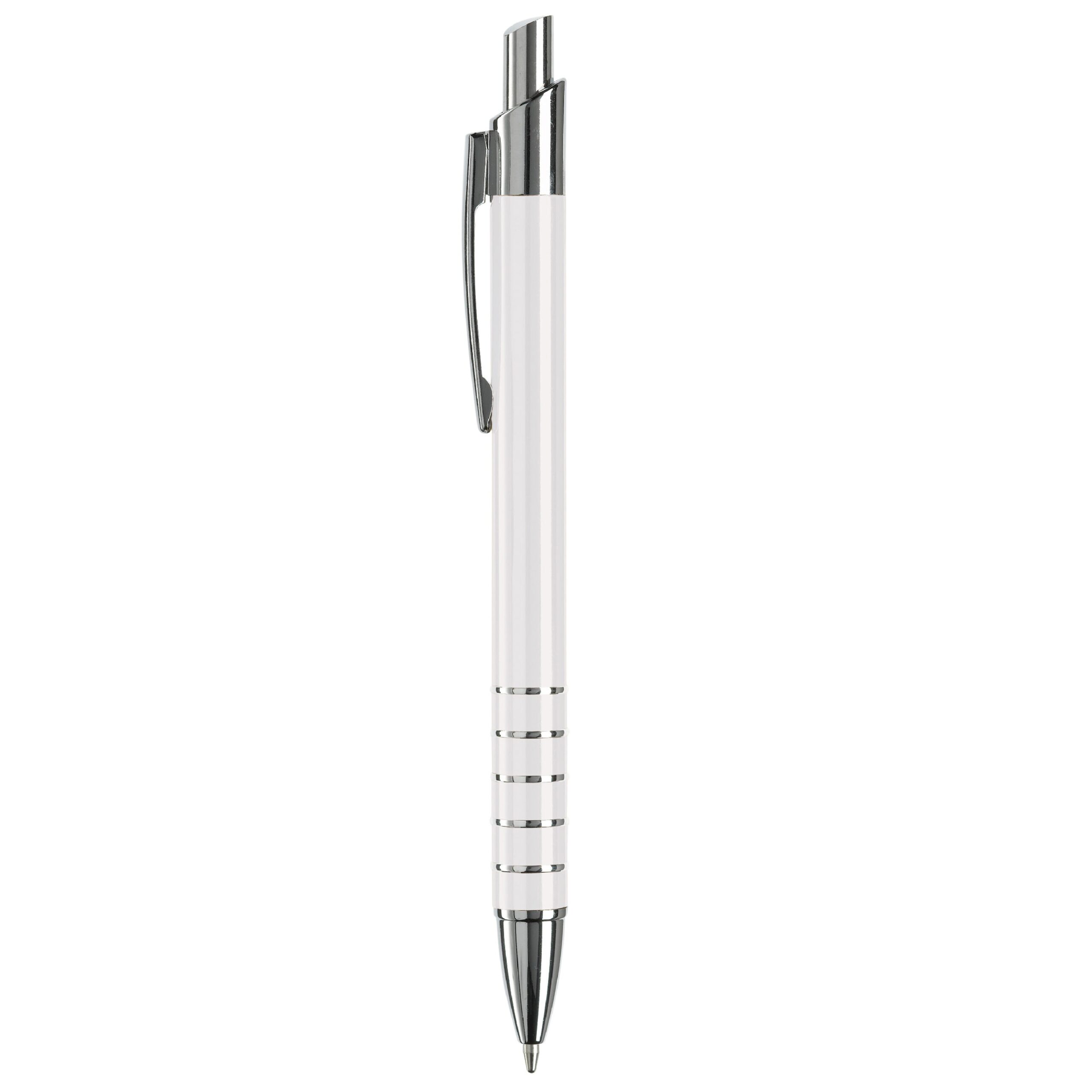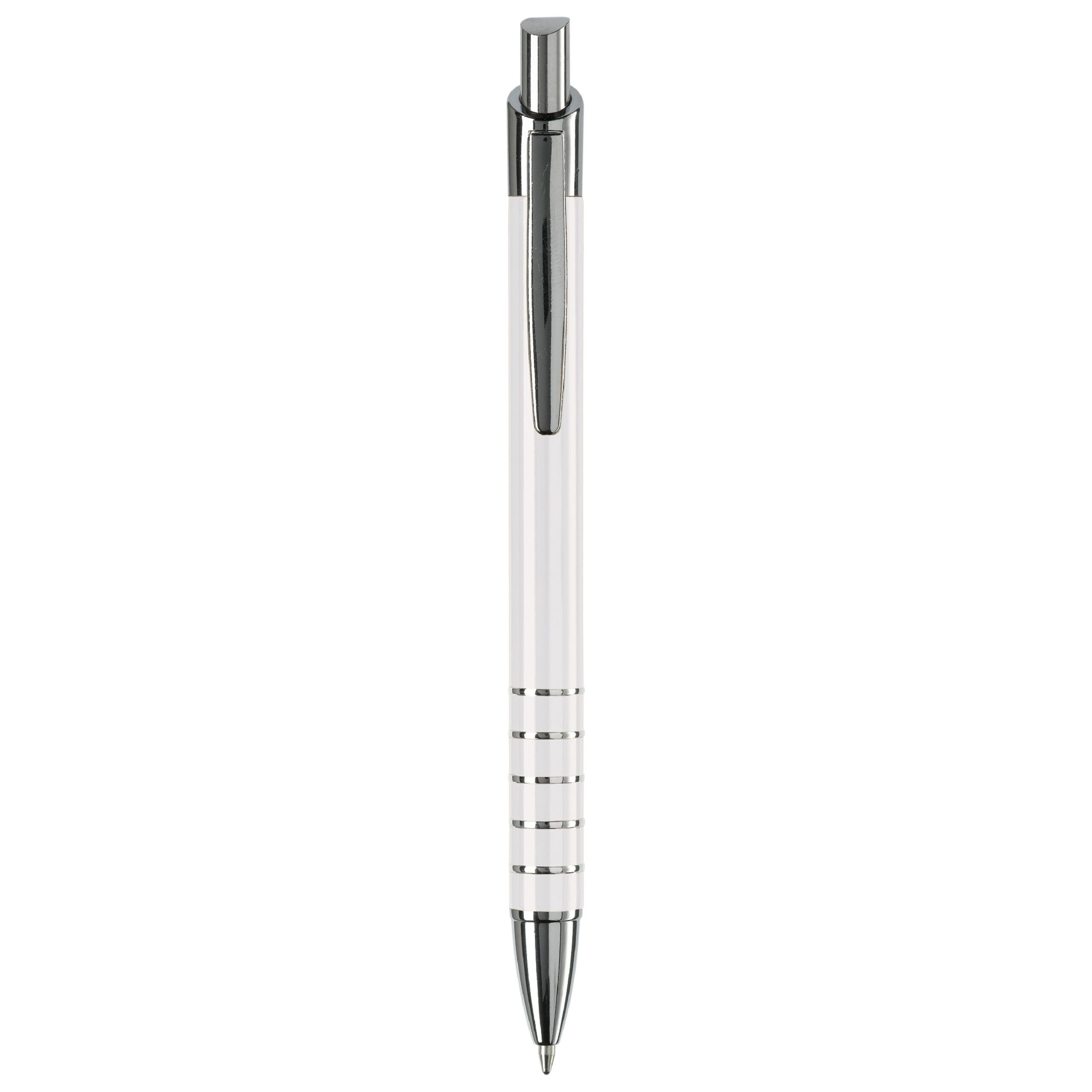 Schlanker Aluminium Kugelschreiber mit 5 chromfarbenden Ringen in der Griffzone und chromfarbenden Teilen. Schwarzschreibende Kunststoffmine.