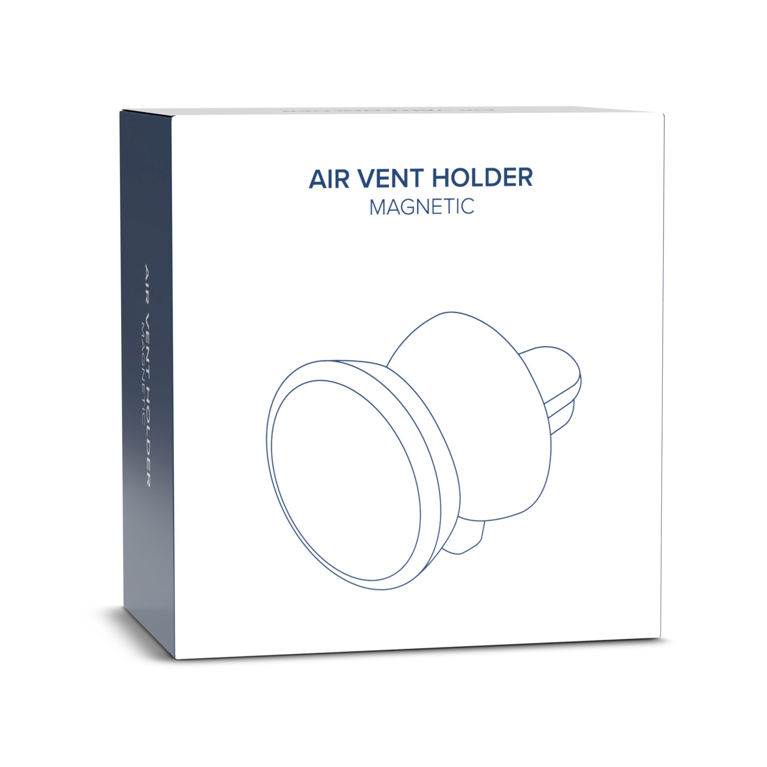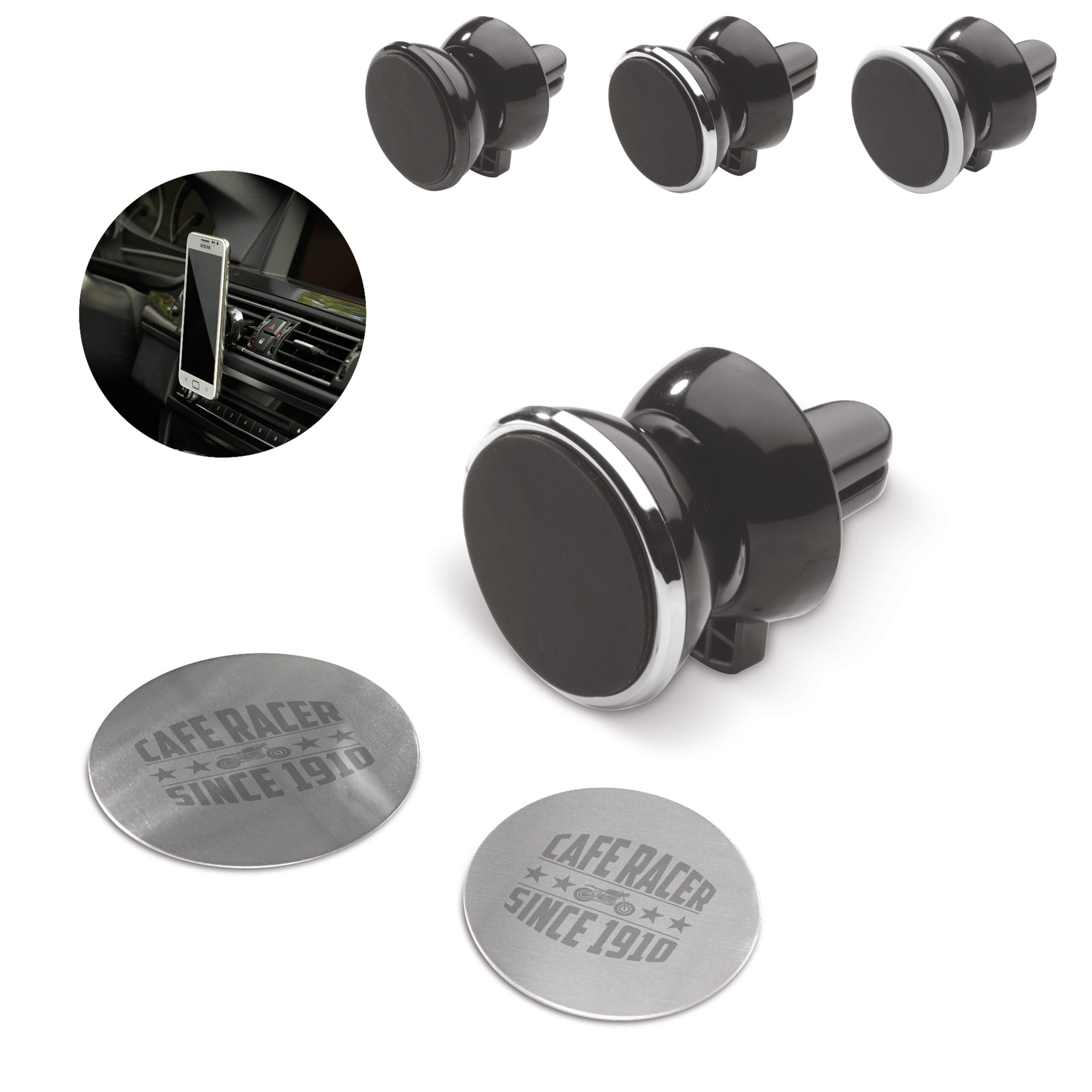 Magnetischer Handyhalter aus zwei Teilen: eine Metallplatte mit Aufkleber zum Anbringen auf der Rückseite des Handys und einem magnetischen Halter für das Lüftungsgitter im Auto. Nutzen Sie die Lüftung als Handyhalter.