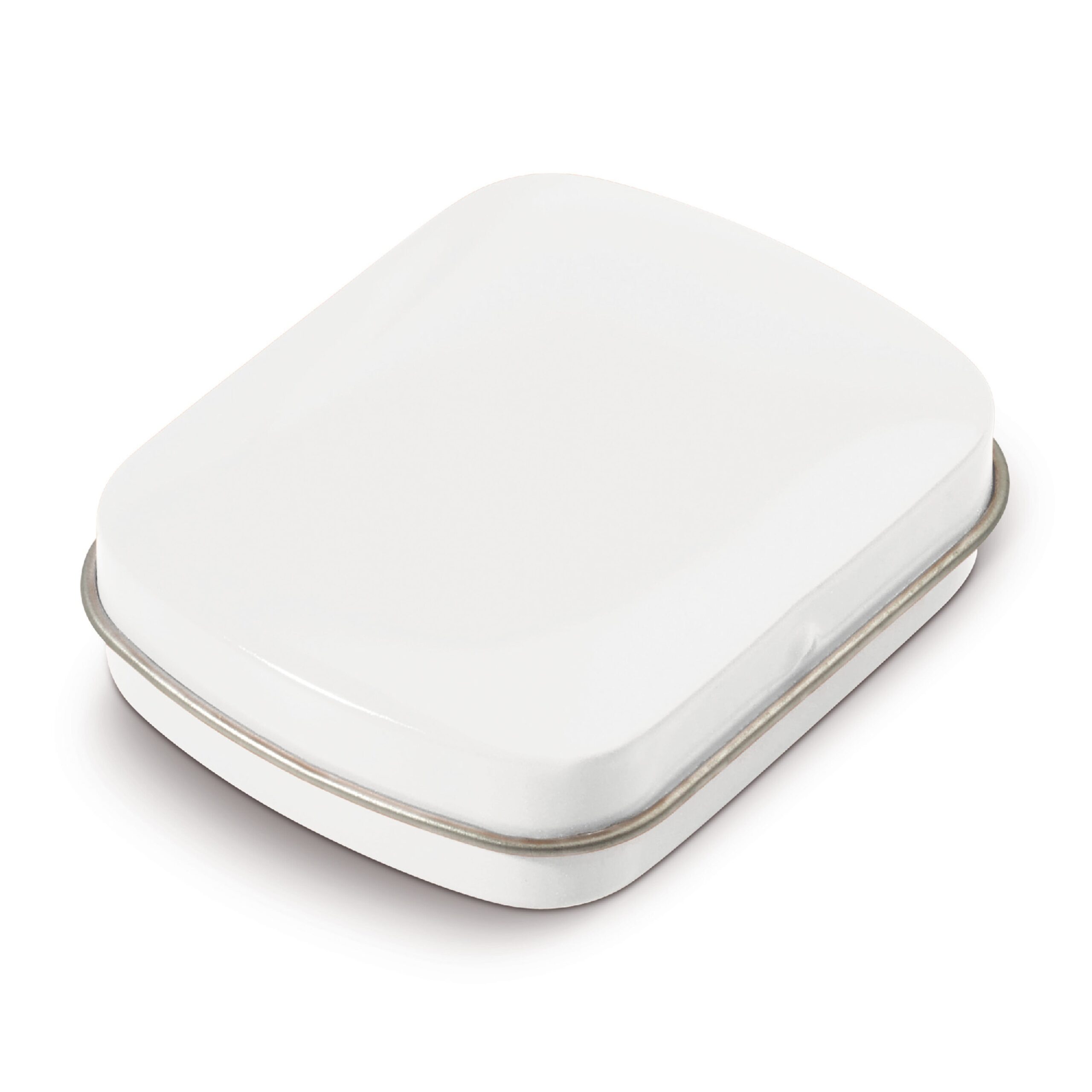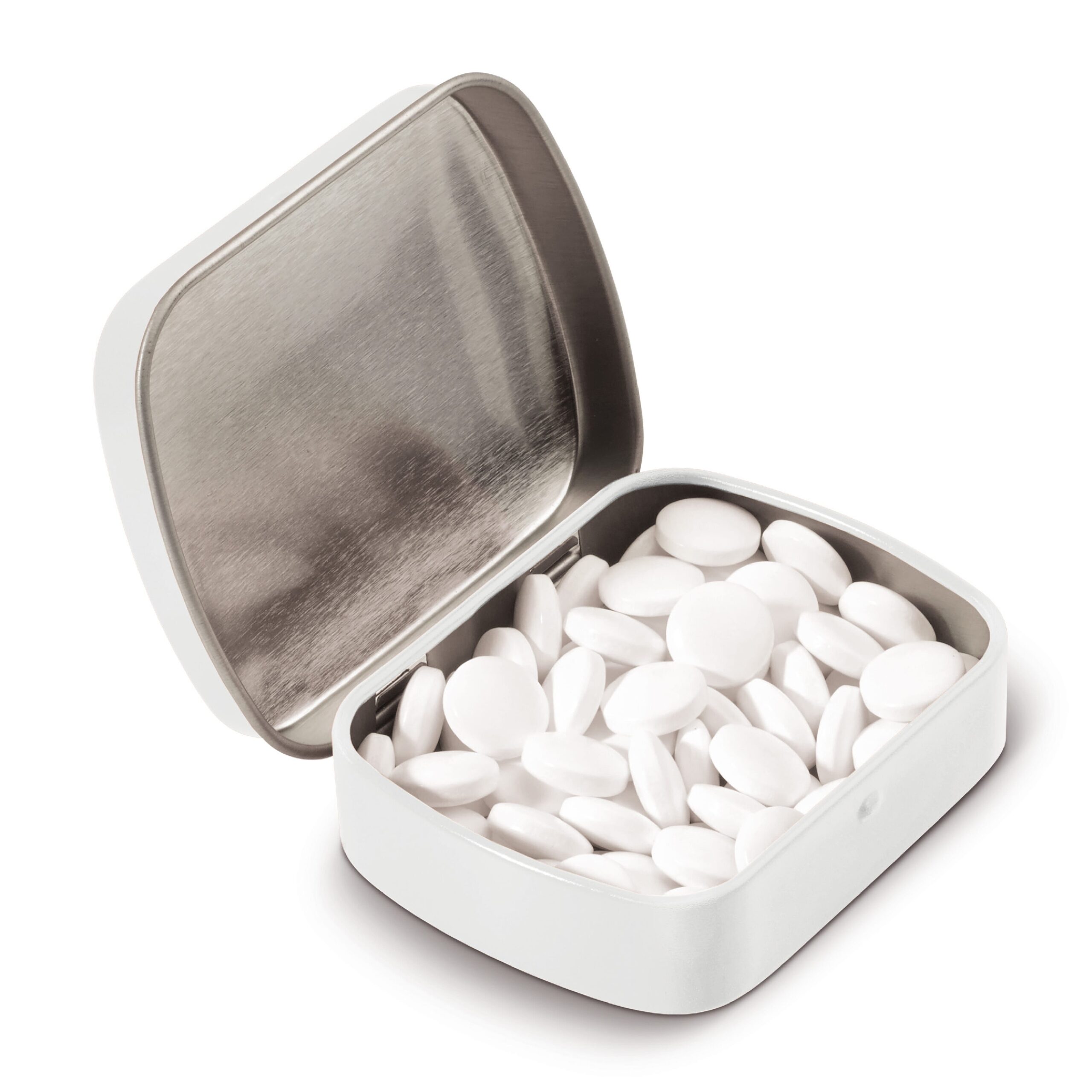 Quadratische Pfefferminzdose, gefüllt mit 23g holländischer Pfefferminzbonbons. Nicht zuckerfrei.
