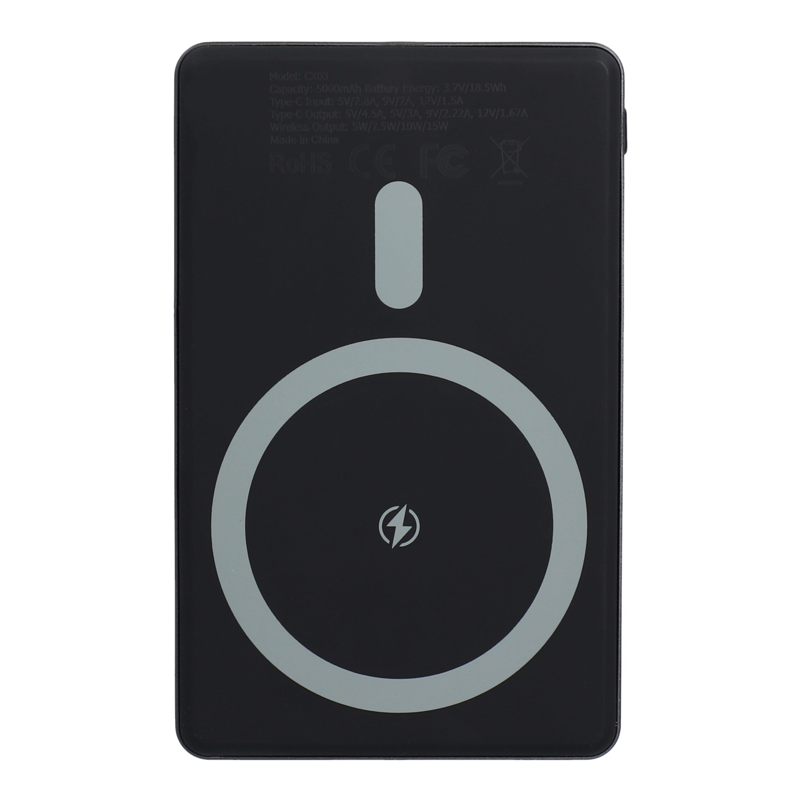 MagSafe-kompatible 5000-mAh-Powerbank mit 15 W kabellosem Laden und schnellem Typ-C-Eingang/Ausgang. Ultraflach (9.22 mm), leicht (112 g), ideal für Reisen. Vollständig aufgeladen in 2-3 Stunden. Aus recyceltem ABS, inkl. 22 cm USB-C-Kabel.
