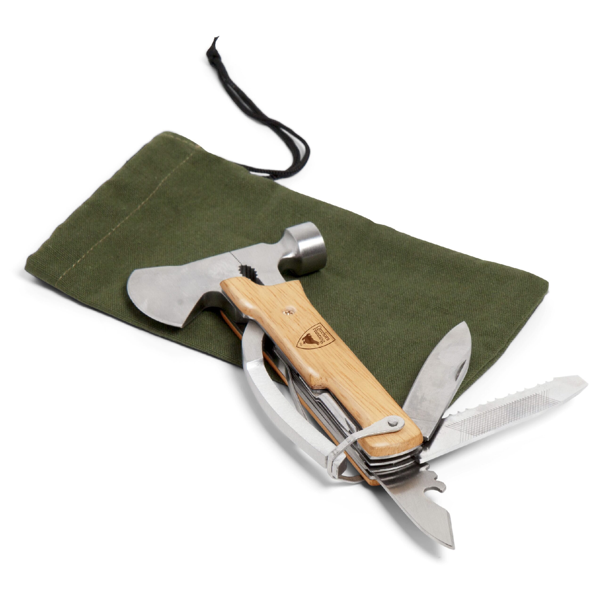 Ein handliches Multitool für unterwegs, ob im Haus oder im Freien. Enthält eine Zange, einen Hammer, eine kleine Axt, ein Messer, eine Nagelfeile, einen Schraubendreher (flacher Kopf) und einen Dosenöffner. Wird mit einer Leinentasche geliefert und ist in einem Geschenkkarton verpackt. Orrefors Hunting Produkte sind solide und robuste Qualitätsprodukte, die Sie überall und jederzeit verwenden können.