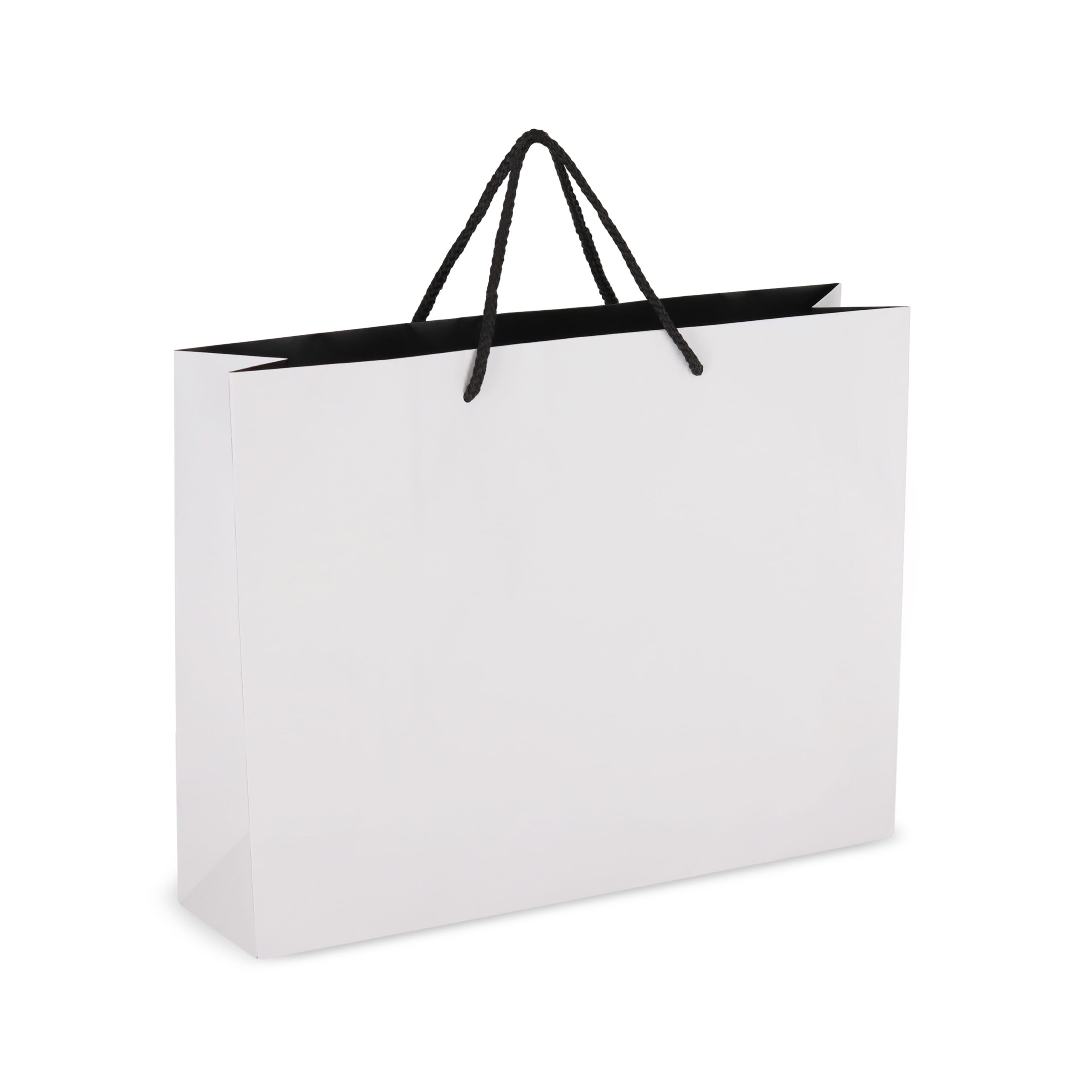 Elegante Geschenktasche aus Papier mit 5 mm dicken Kordeln aus recyceltem Polyester. Sie ist für ein Gewicht von bis zu 5 kg ausgelegt und hat ein luxuriöses Aussehen mit schwarzen Griffen und einer schwarzen Innenseite. Perfekt zum Überreichen von Geschenken.