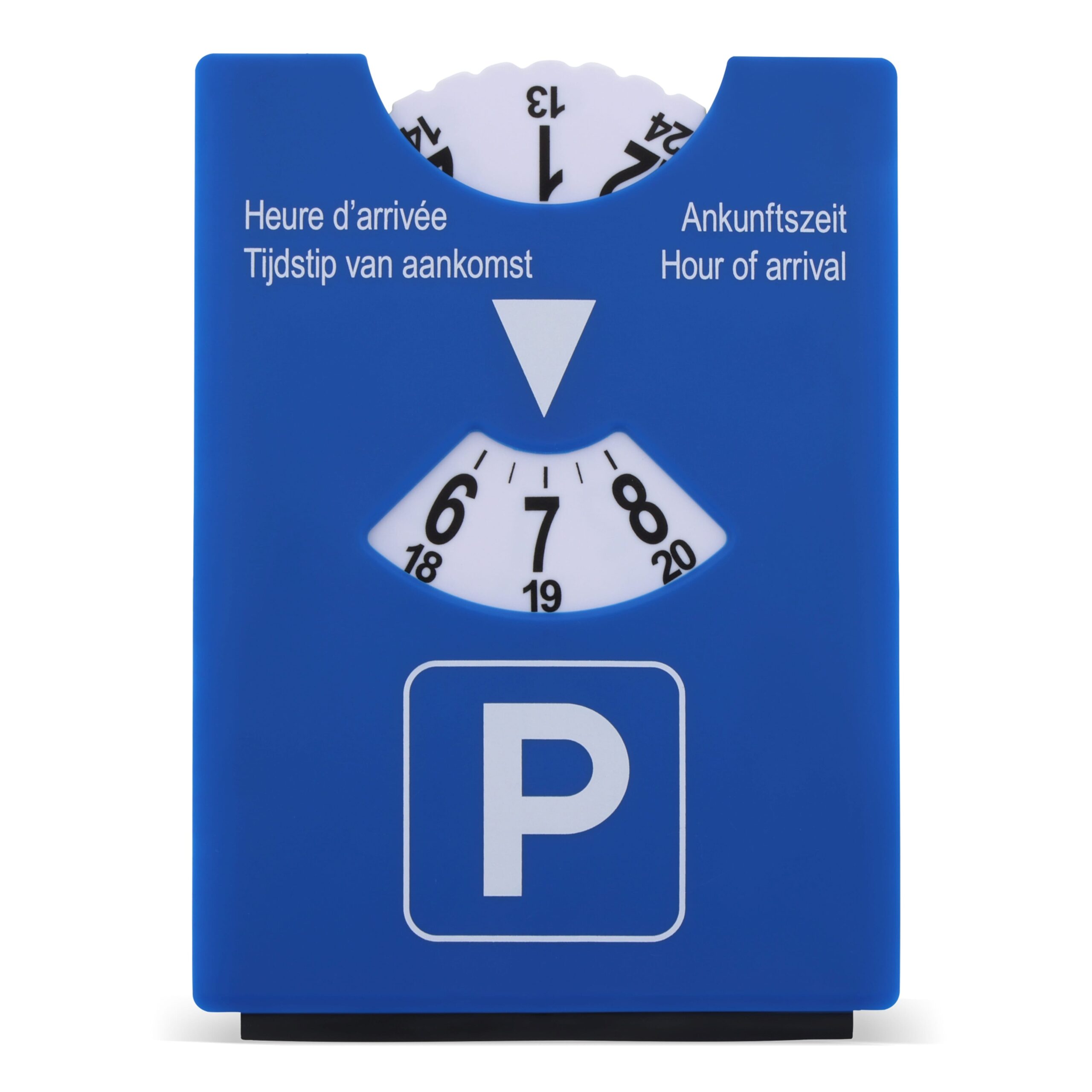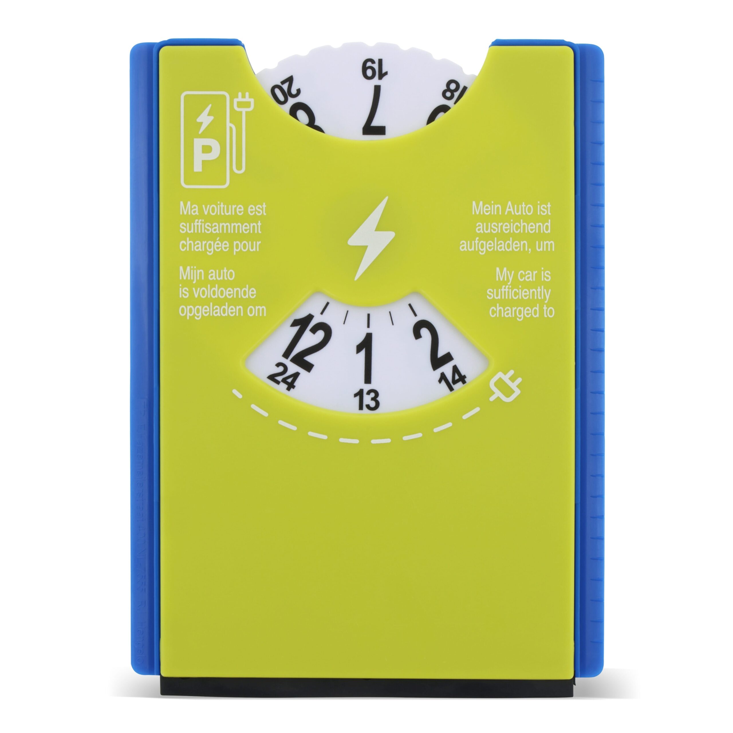 Parkscheibe und Eiskratzer im Toppoint-Design. Die Parkscheibe entspricht den europäischen Gesetzen (außer Frankreich). Die blaue Seite ist eine normale Parkscheibe, die grüne Seite kann beim Aufladen Ihres Elektro- oder Hybridautos verwendet werden.