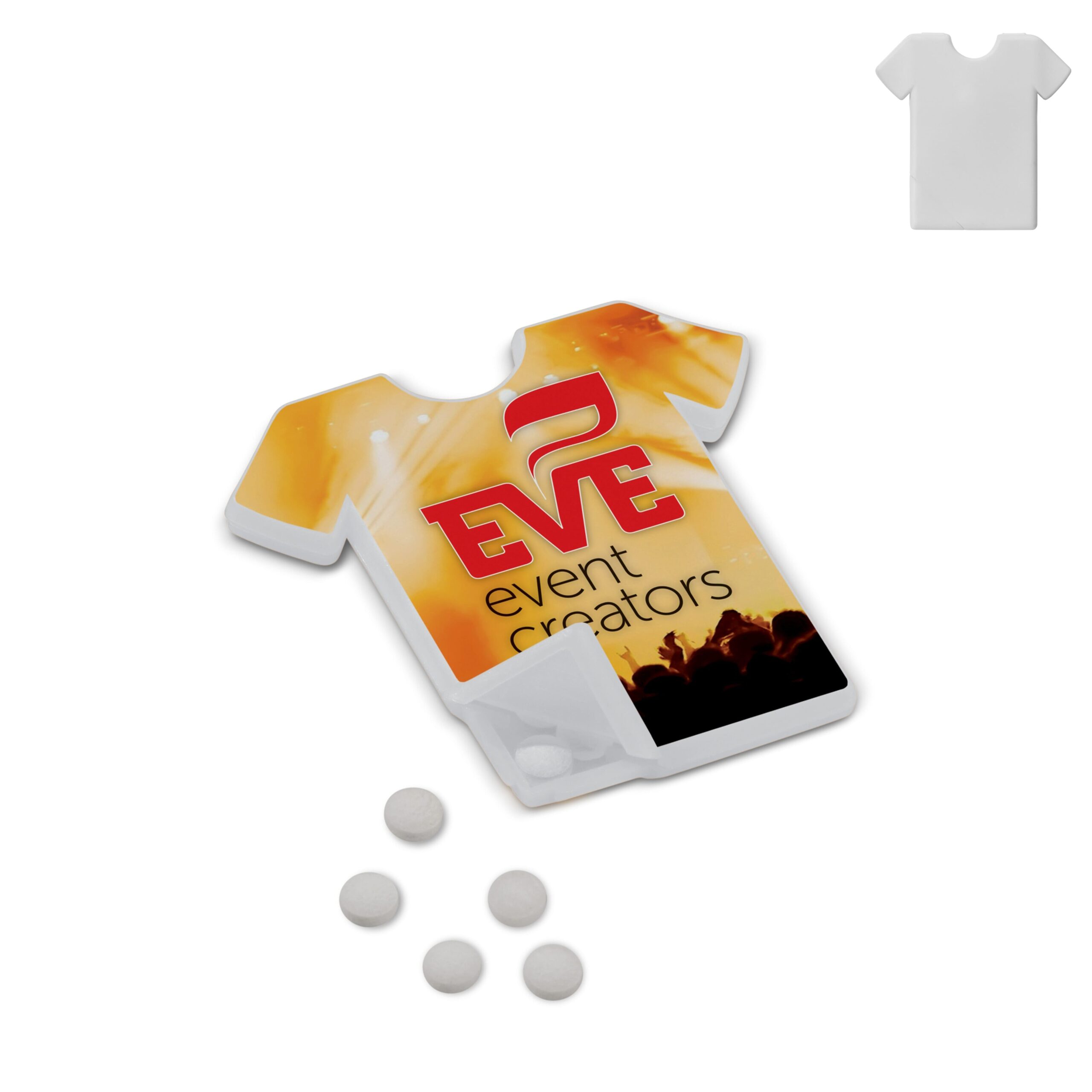 Pfefferminzspender in T-Shirt Form. Die Öffnung befindet sich am unteren Rand des T-Shirts. Ca. 7g zuckerfreies Pfefferminz. Der Artikel kann vollfarbig digital bedruckt werden. Produktspezifikationen auf der Rückseite des Spenders.