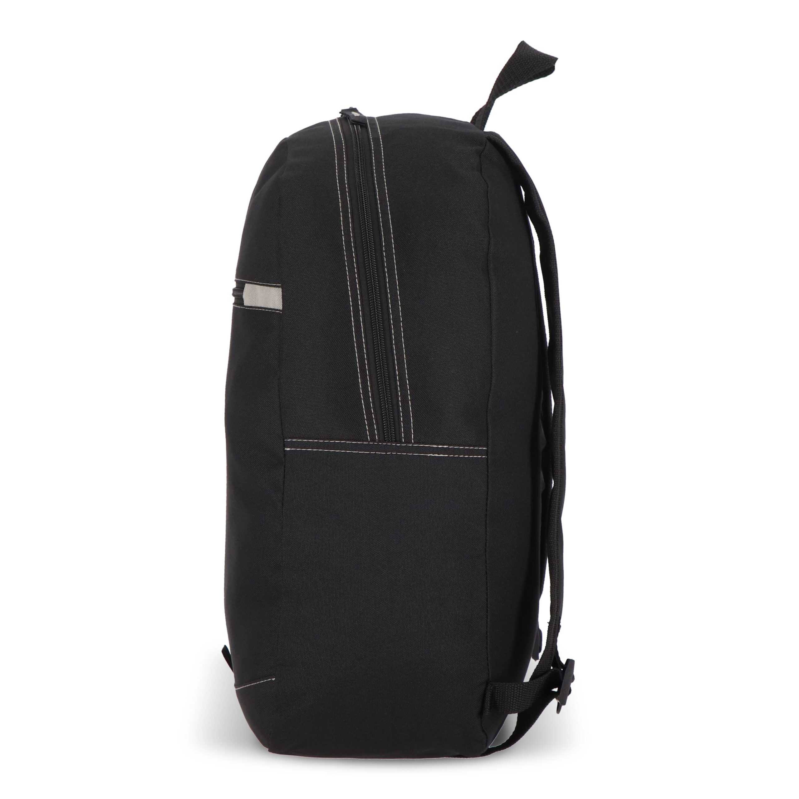 Dieser Rucksack ist aus recyceltem PET hergestellt. Er verfügt über verstellbare, gepolsterte Schultergurte, einen Griff an der Oberseite, ein Fach mit Reißverschluss an der Vorderseite, eine Netztasche an der Seite und einen kleinen reflektierenden Streifen für die Sichtbarkeit bei Nacht.