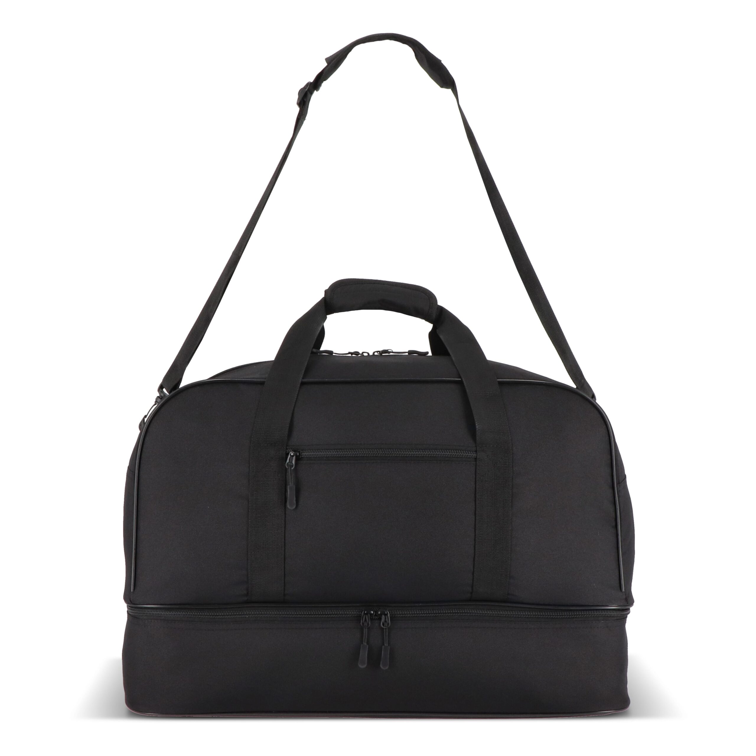 Reise- oder Sporttasche mit zwei Fächern aus recyceltem 600D-Polyester. Mit Griffen, abnehmbarer Schultergurt, Frontfach mit Reißverschluss und stabiler Bodenplatte. Die zwei Fächer trennen nasse/verschmutzte Kleidung oder Handtücher nach dem Training bzw. Schuhe von der Kleidung auf Reisen.