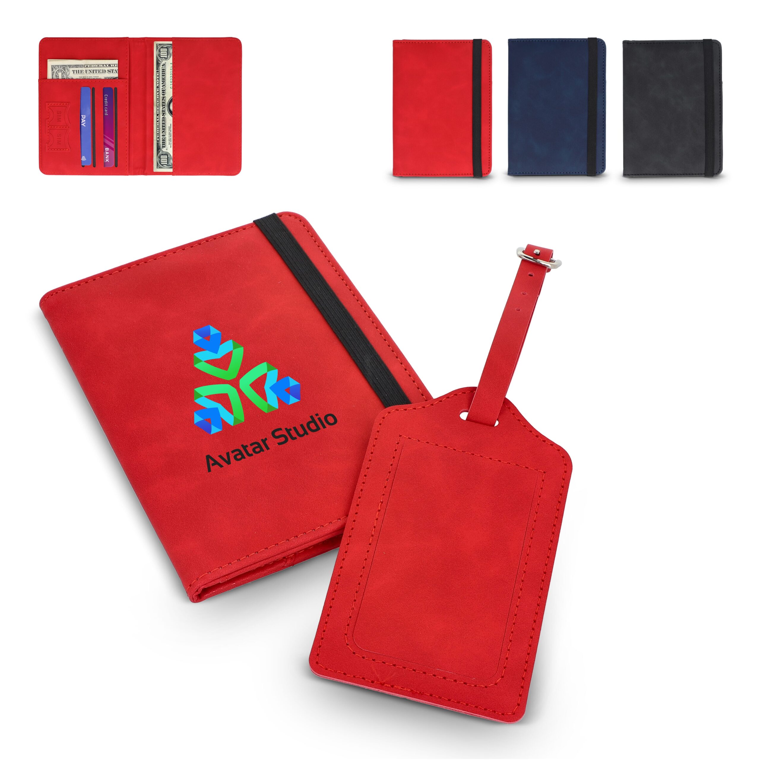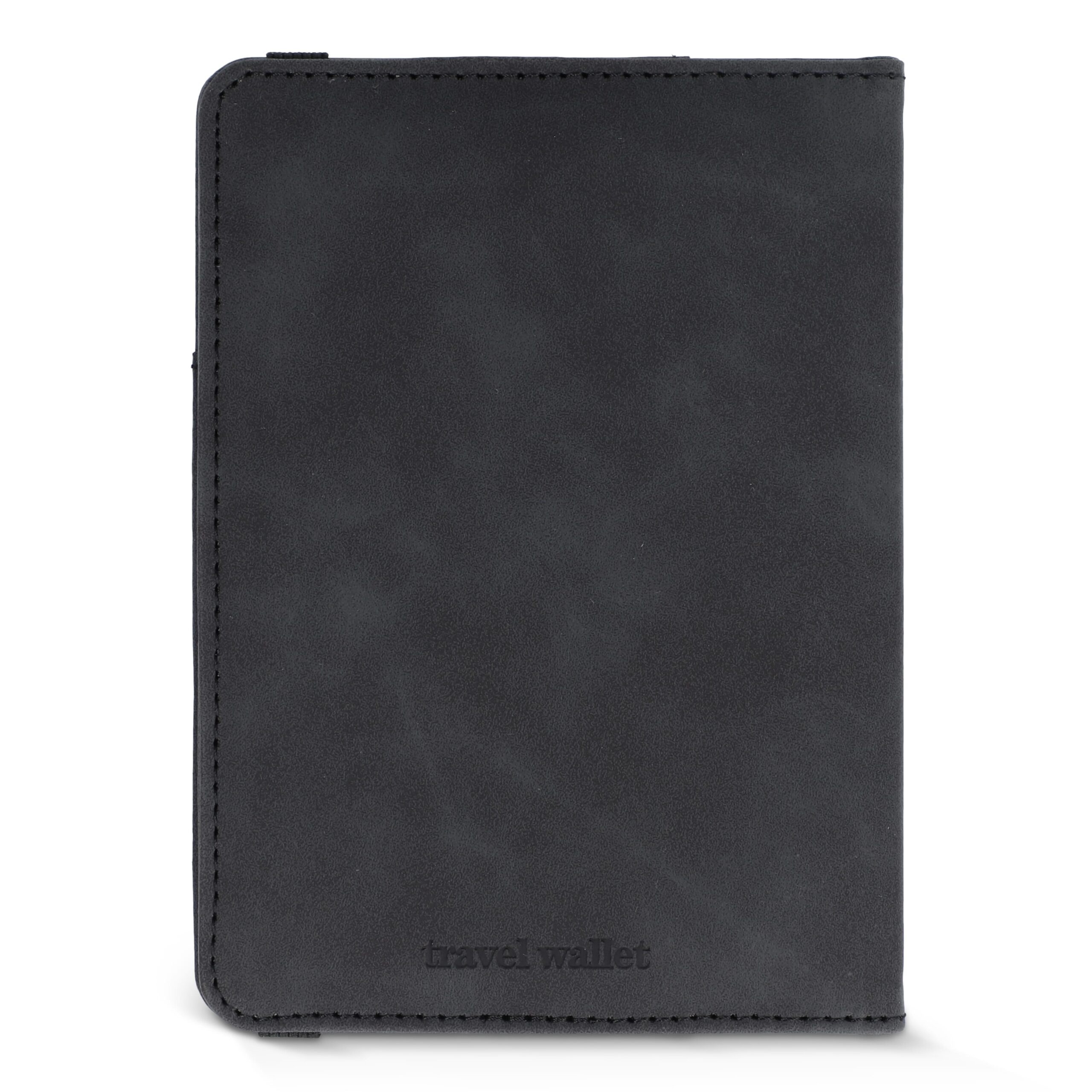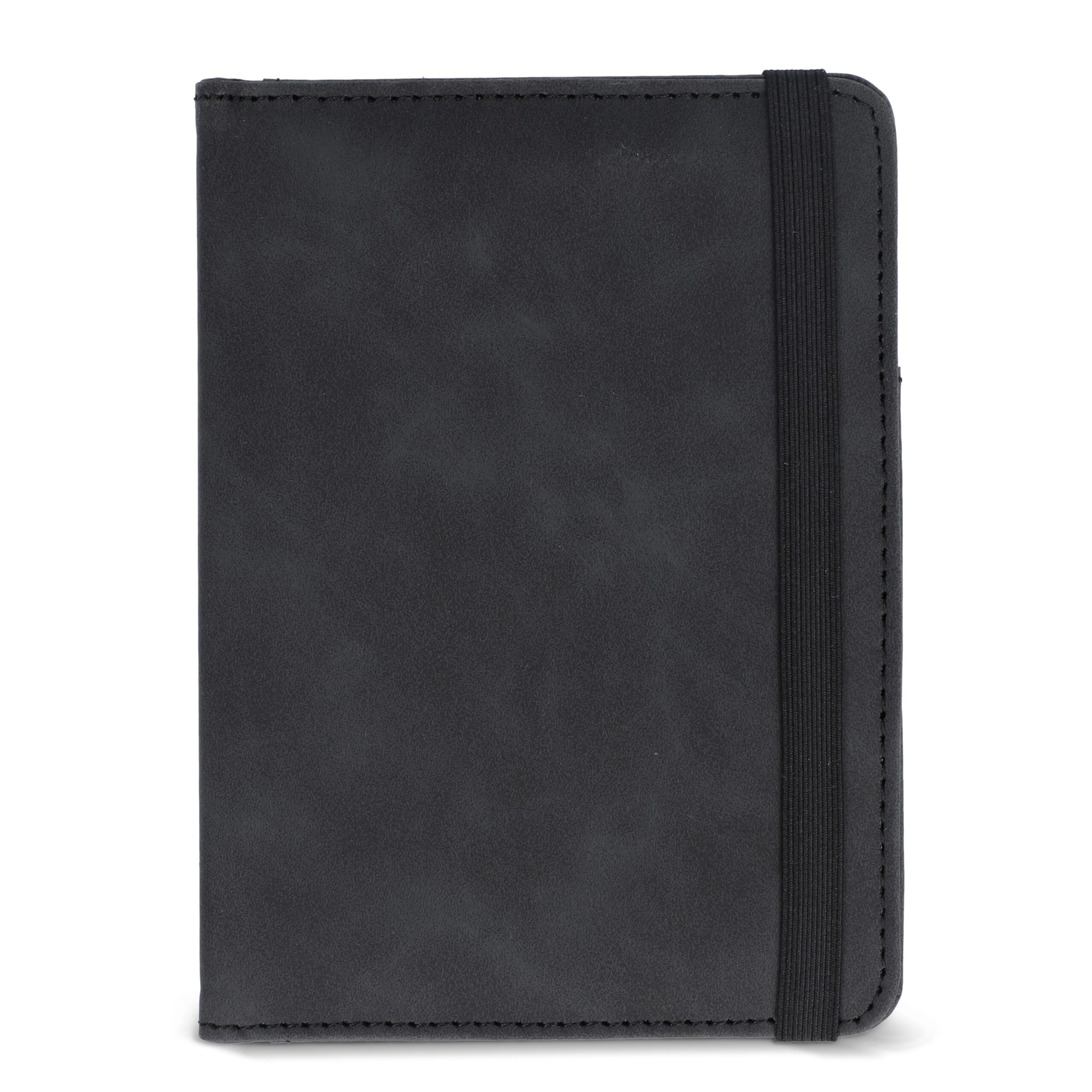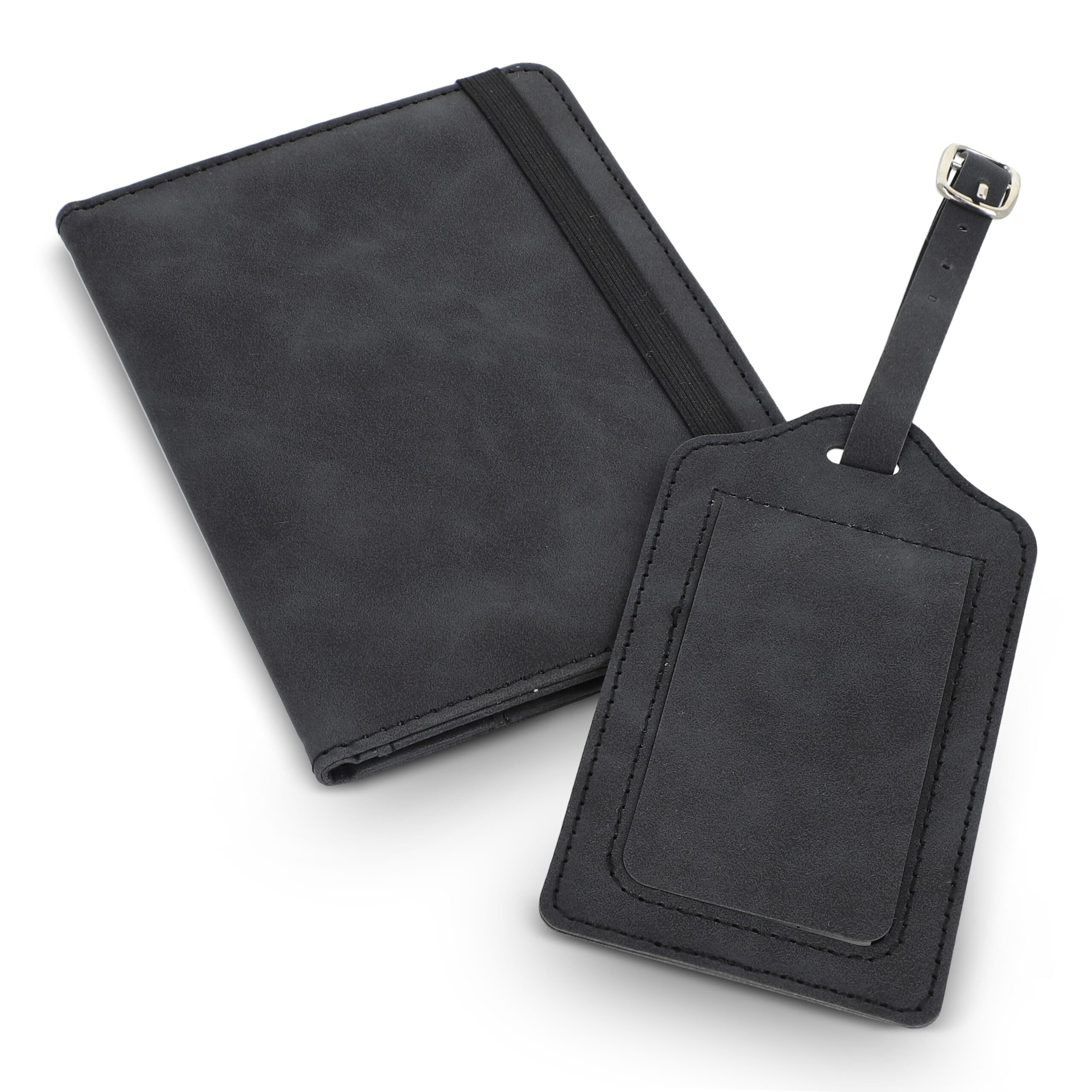 Reiseset mit PU-Reisedokumentetui mit RFID-Schutz, elastischem Verschluss, Platz für Pass, 4 Kreditkarten, 2 SIM-Karten, weitere Fächer (z. B. Bordkarten). Inkl. Gepäckanhänger mit Schnallenriemen und Kontaktkarte (Name, Telefon, Adresse, E-Mail) auf Englisch.