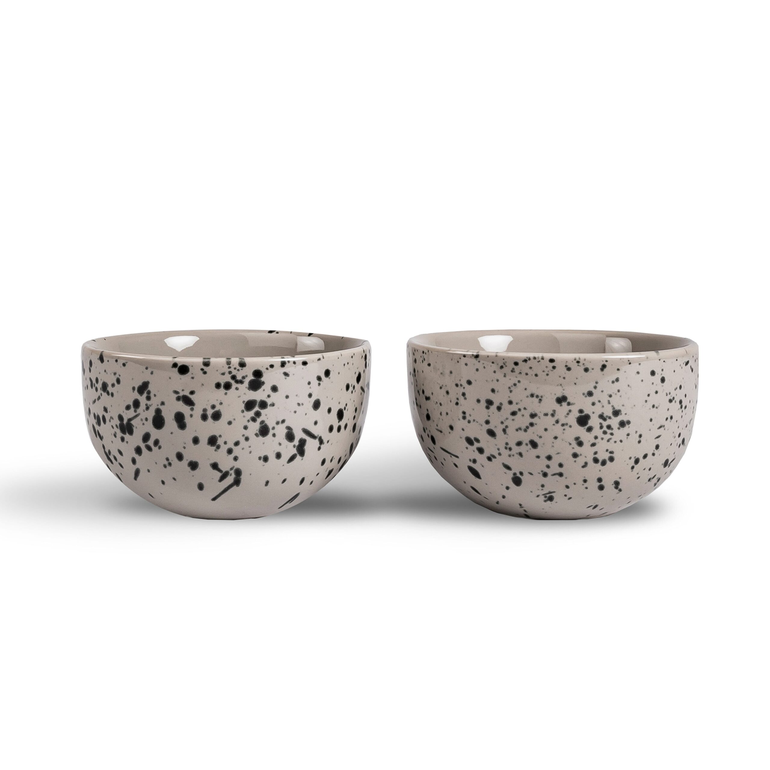 Eine handgefertigte kleine Schale für Snacks. Die Farbe ist ein beige/grauer Farbton mit einem schönen Spritzmuster in Schwarz. Diese Schale hat nur an der Außenseite ein Muster, um Harmonie und Charakter zwischen den verschiedenen Teilen der Serie zu schaffen. Hergestellt aus Stein. Verkauft im 2er-Pack. Da die Ditte-Schalen handgefertigt sind, können Farbe und Oberfläche von Produkt zu Produkt variieren. Jedes Produkt ist einzigartig in seinem Aussehen.