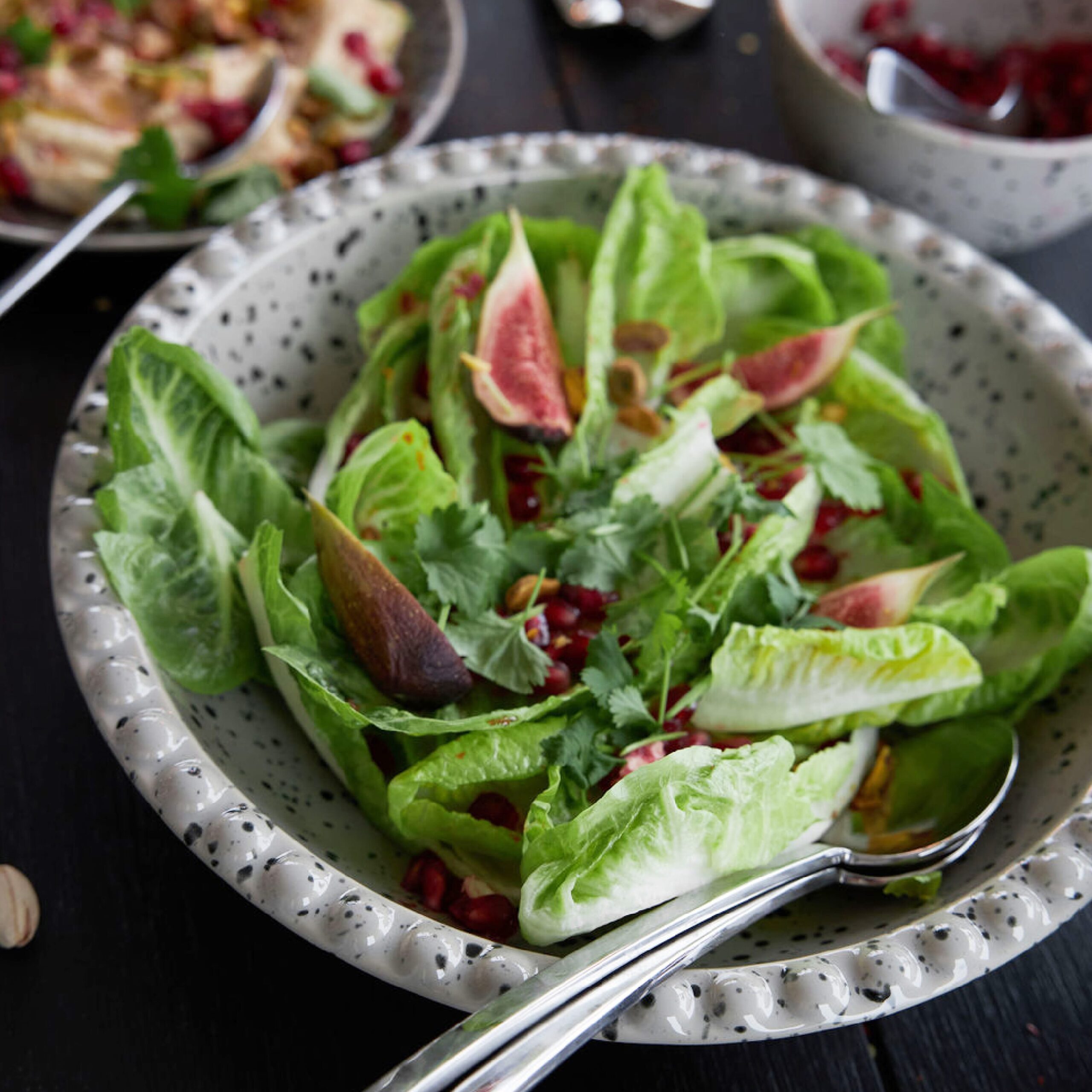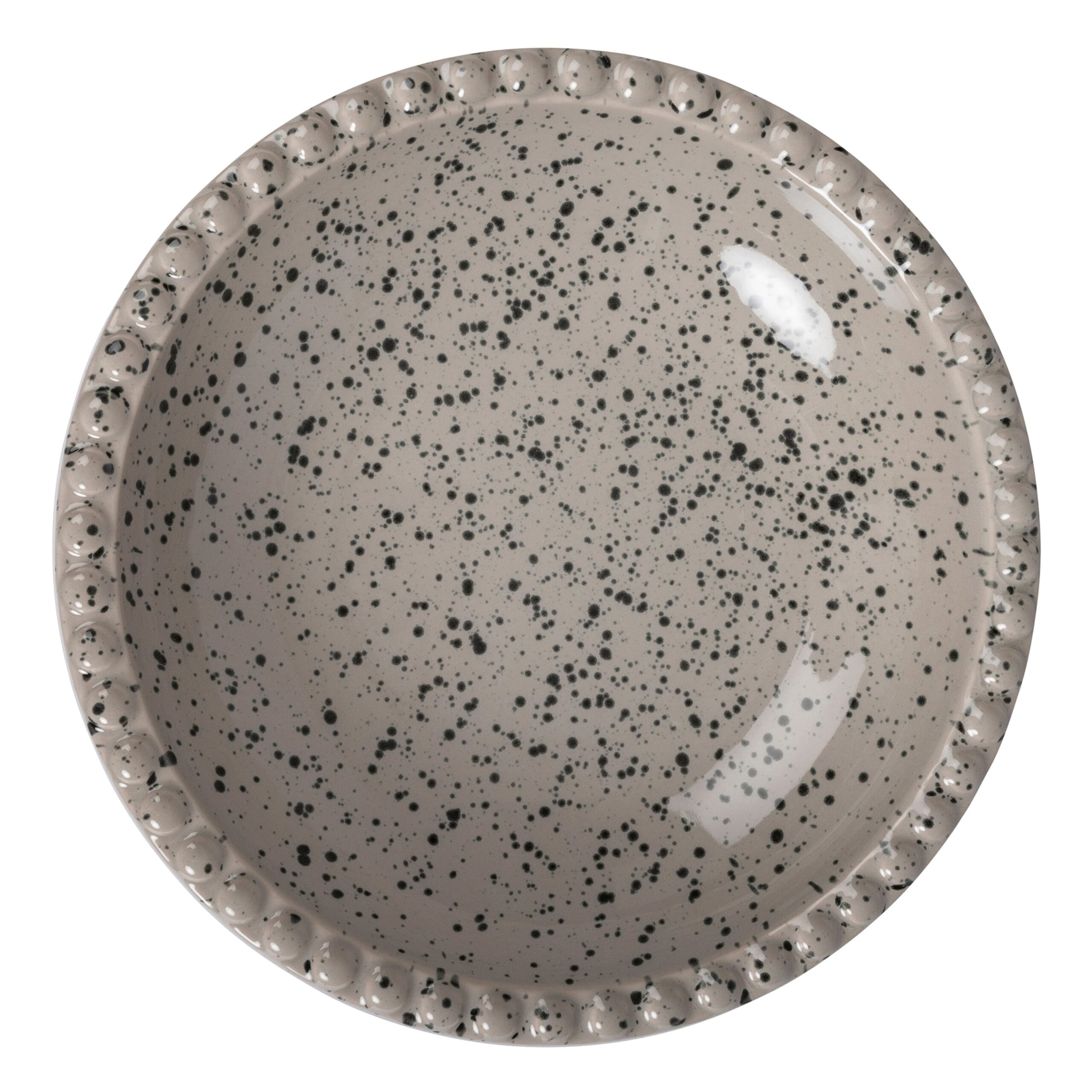 Eine große Servierschale für Salat, Brot oder Obstsalat. Die Farbe ist ein Beige-Grau-Ton mit einem hübschen Spritzmuster in Schwarz. Der Rand ist mit kleinen Quadraten verziert, die dem gemeinsamen Essen das gewisse Etwas verleihen. Hergestellt aus Steingut. Ditte ist handgefertigt, daher können Farbe und Oberfläche von Produkt zu Produkt variieren. Jedes Produkt ist einzigartig in seinem Aussehen.