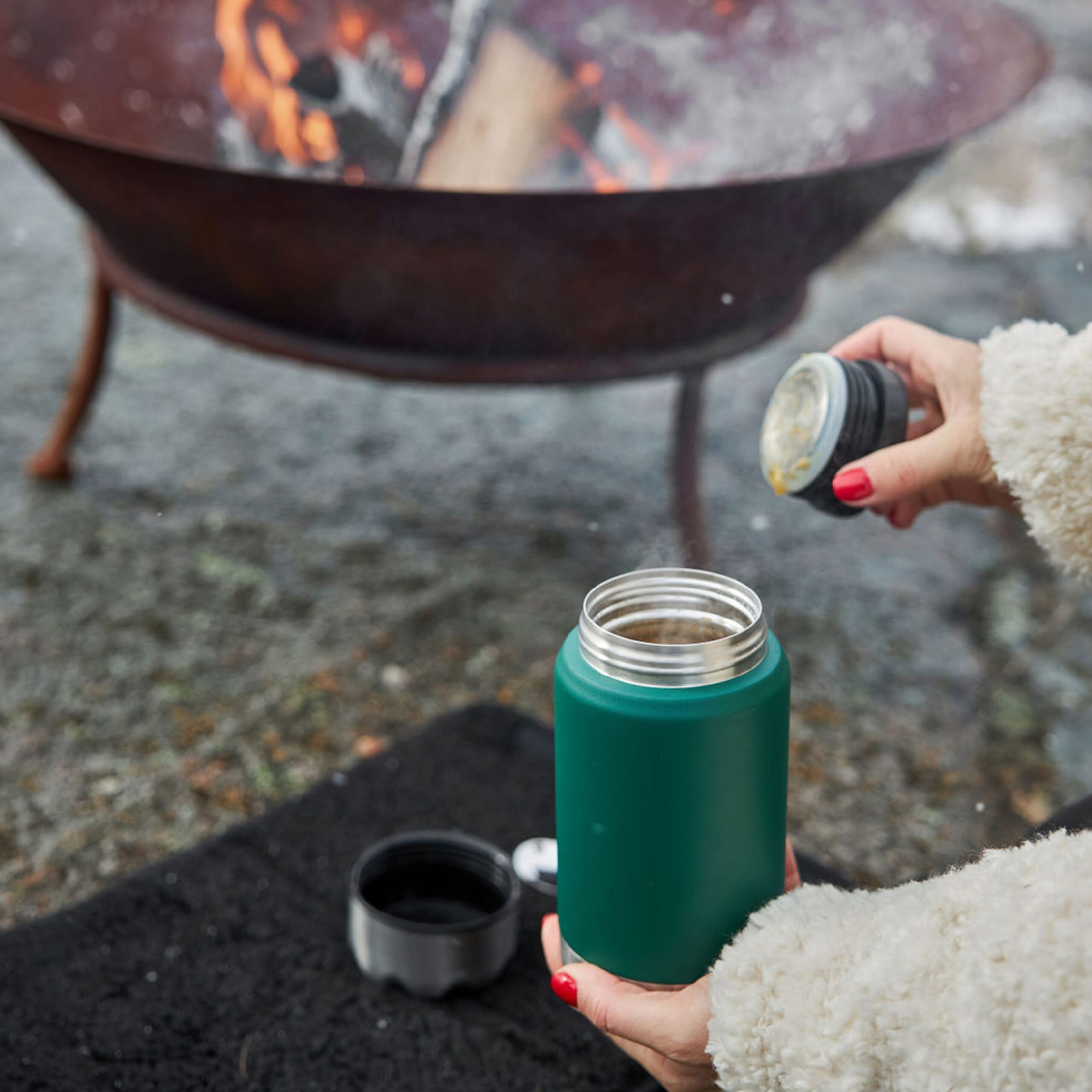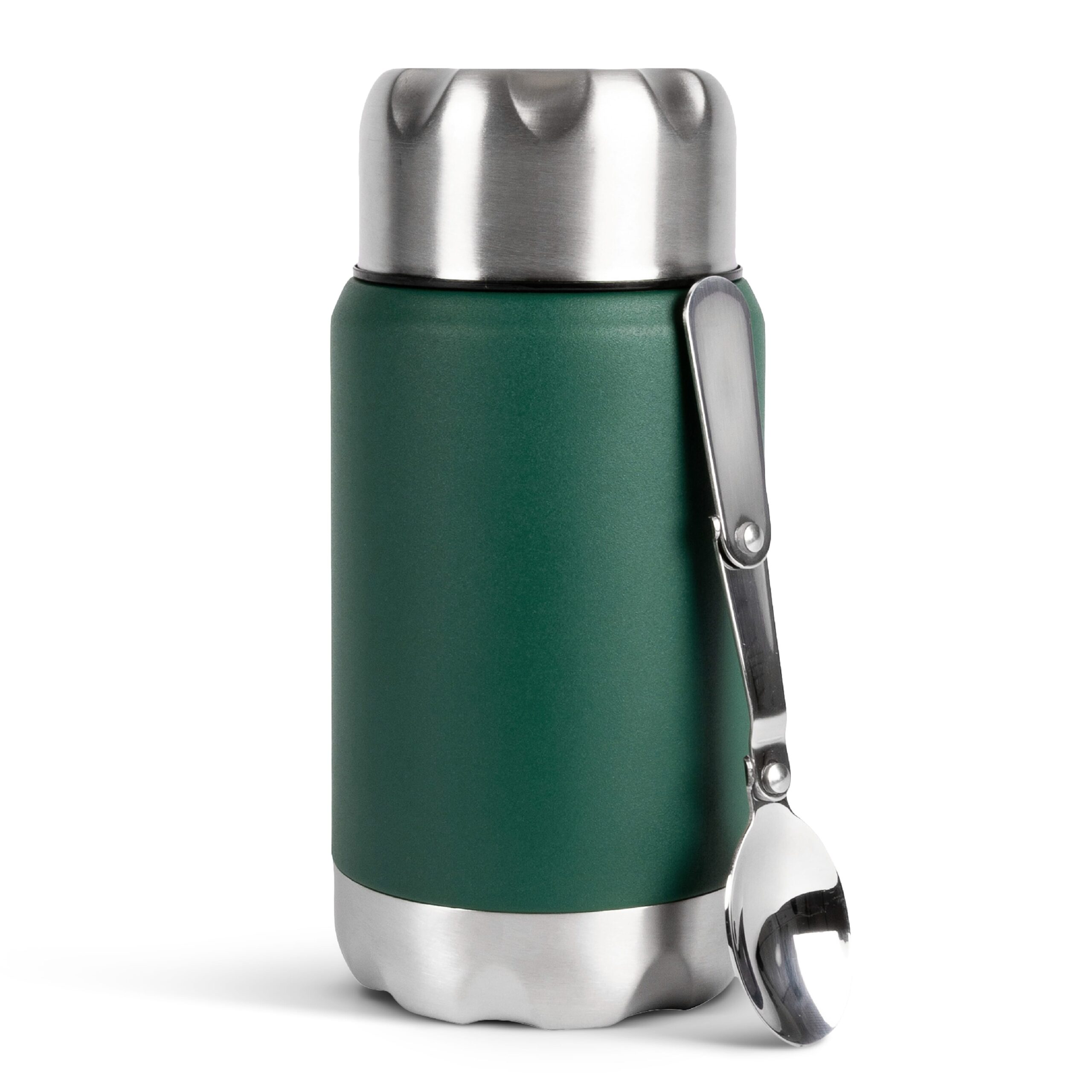 Kleine, handliche Thermosflasche mit dem gewissen Extra. Elegantes Design aus rostfreiem Stahl mit einem kleinen Klapplöffel im Deckel. Durch den großen Hals ist sie leicht zu reinigen und eignet sich perfekt zum Befüllen mit z. B. Suppe. Hält Ihre Speisen oder Getränke 24 Stunden lang eiskalt oder 12 Stunden lang heiß.