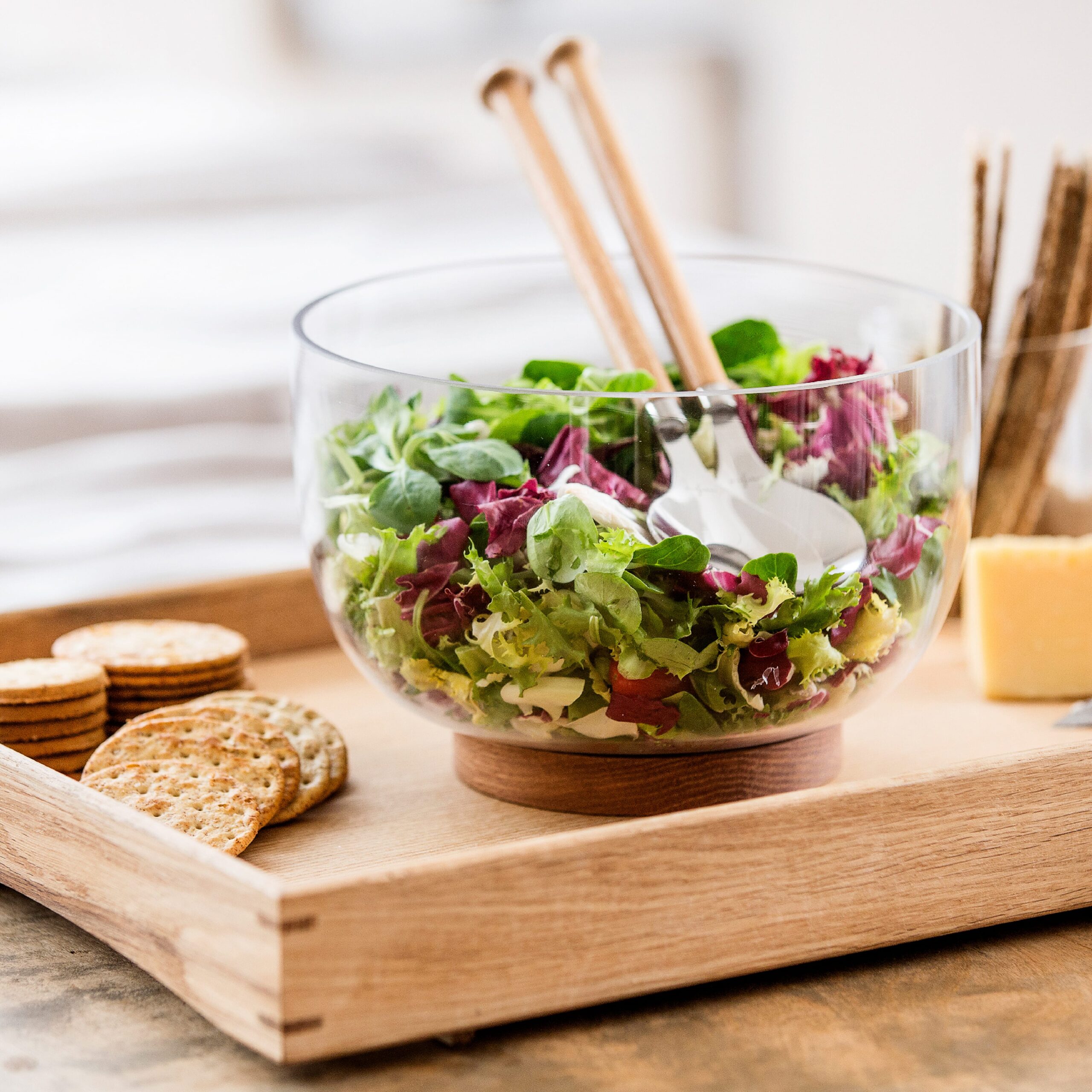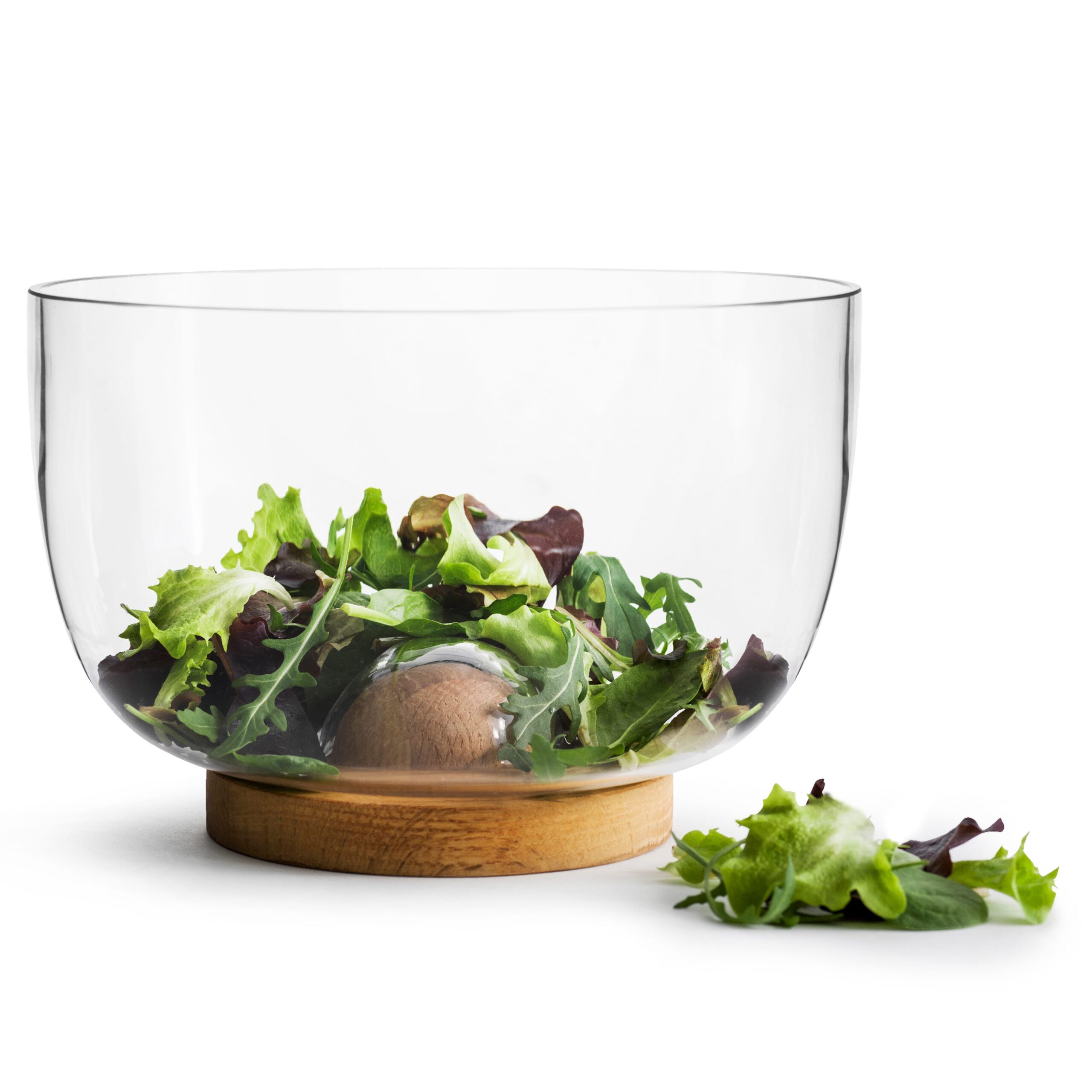 Servierschüssel in coolem Design mit einer Bodenplatte aus massiver Eiche, die abnehmbar ist und die darunter befindlichen Gegenstände schützt. Perfekt für Salat oder Obst. Denken Sie daran, die Bodenplatte regelmäßig zu ölen.