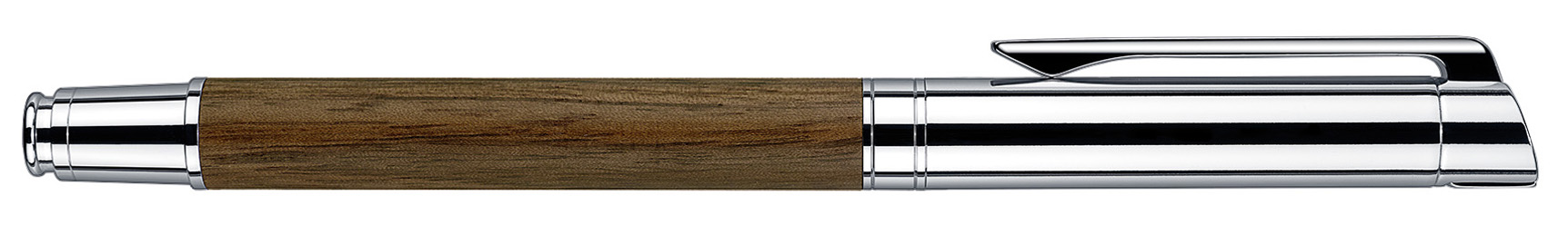Der Tizio Rollerball kombiniert Nussbaumholz mit Metall zu einem Schaft von besonderer Ausdruckskraft. Die individuelle Holzmaserung sorgt für Natürlichkeit, während Kappe, Spitze und Beschlagteile in glänzendem Chrom eine sportlich-elegante Optik unterstreichen.