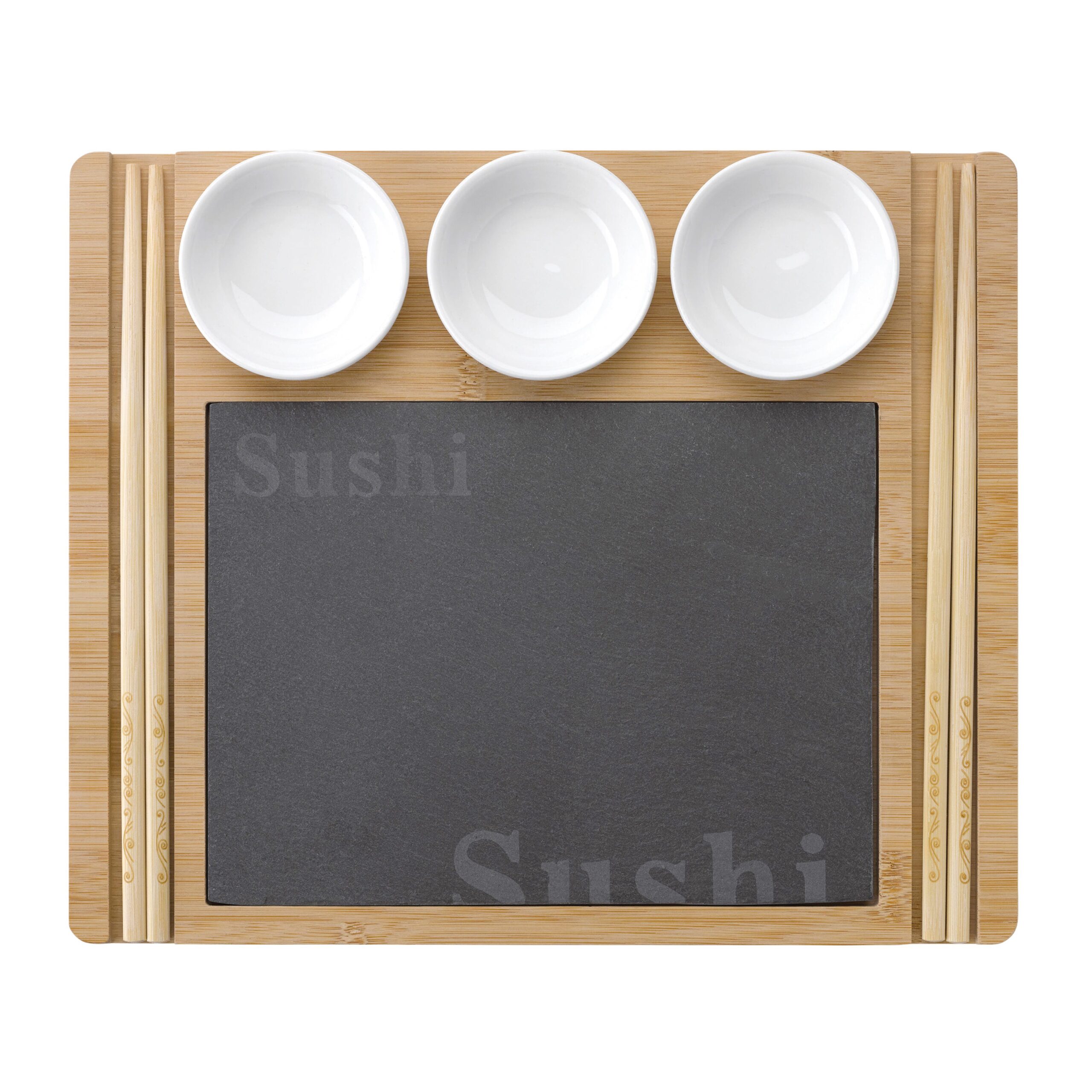 Sushi-Brett für zwei Personen, bestehend aus einem hölzernen Serviertablett mit einer Sushi-Platte aus Schiefer. Wird mit zwei Sets Essstäbchen und drei Keramikschalen geliefert.