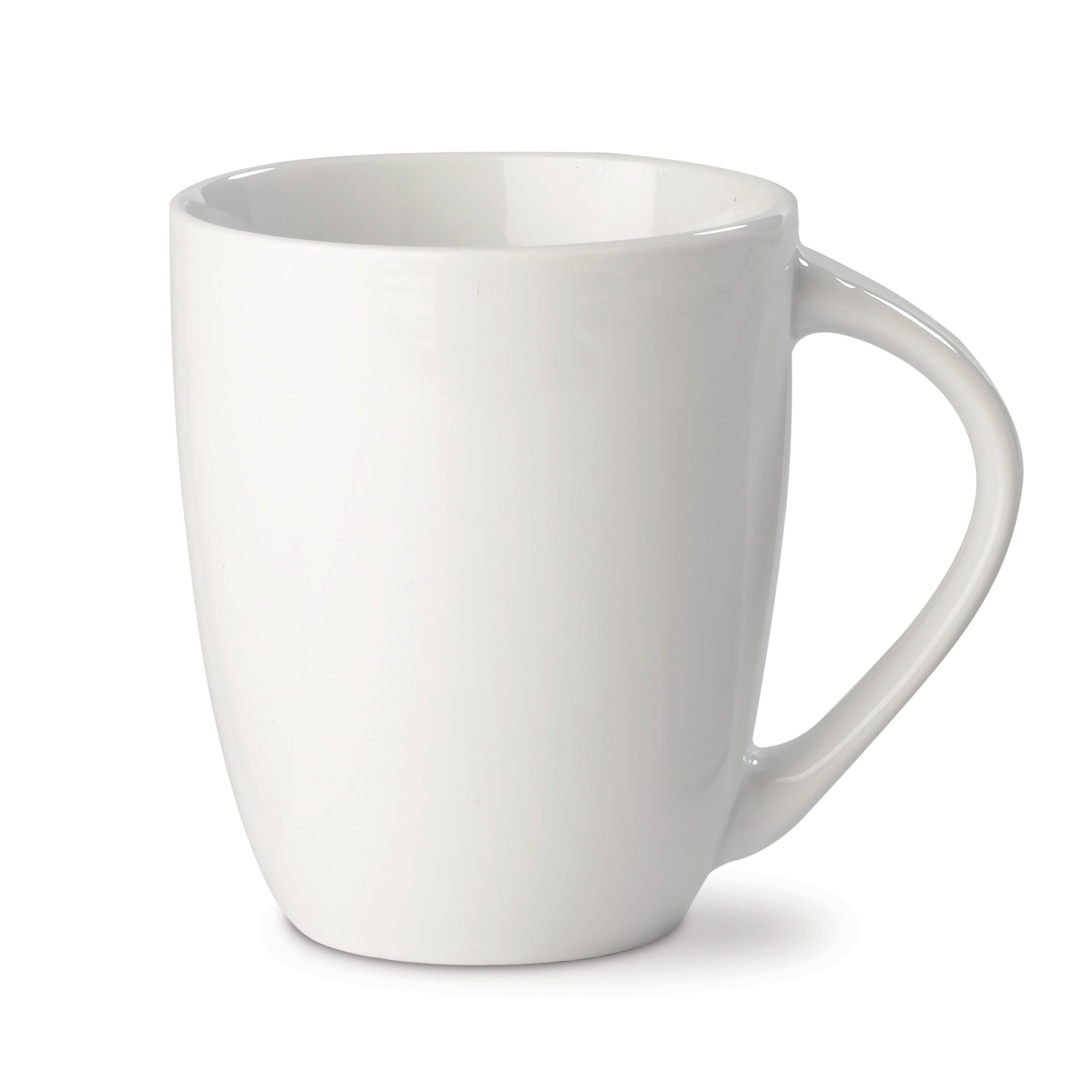 Hochwertiger weißer Porzellanbecher – Made in Europe. Konisches Modell mit großem Henkel.