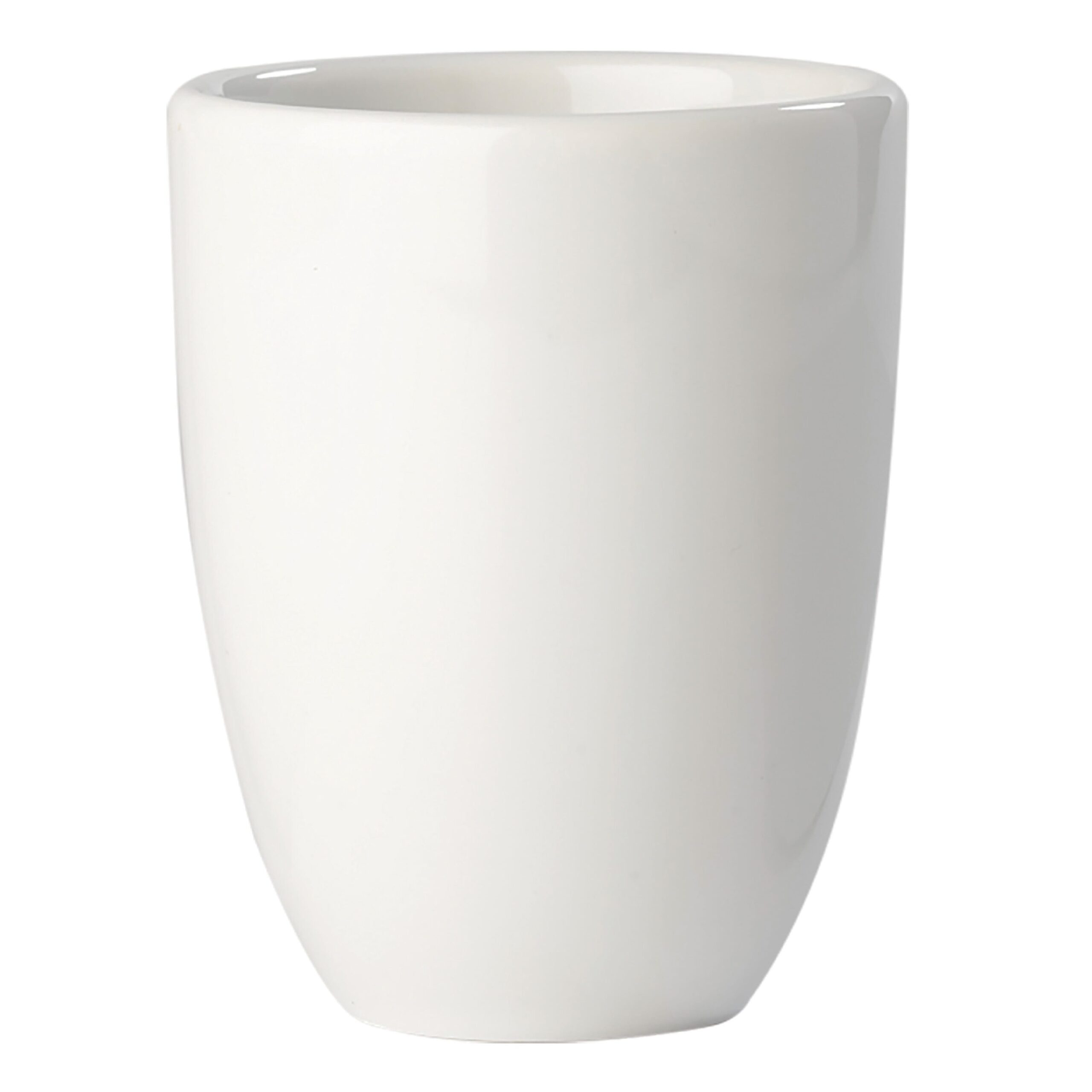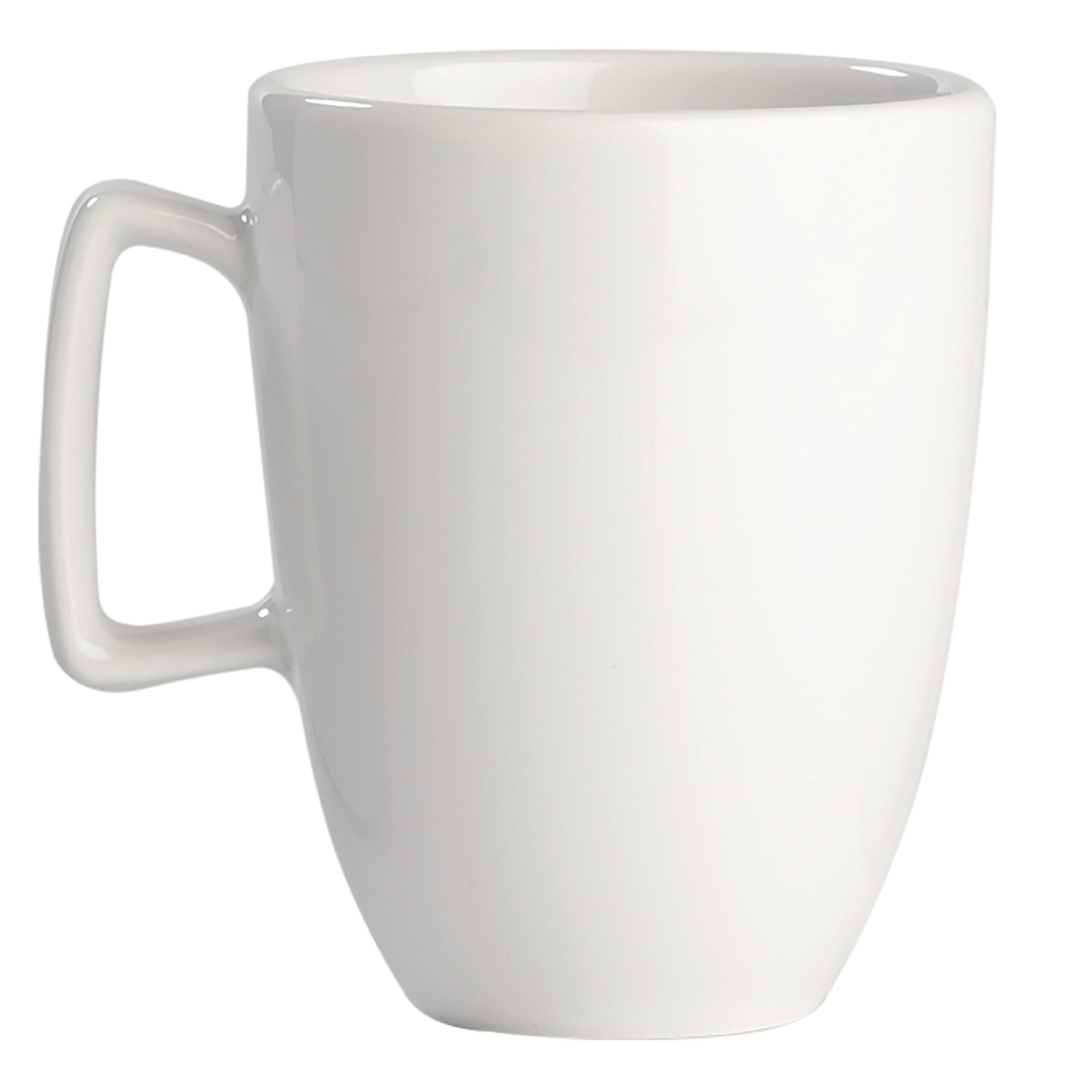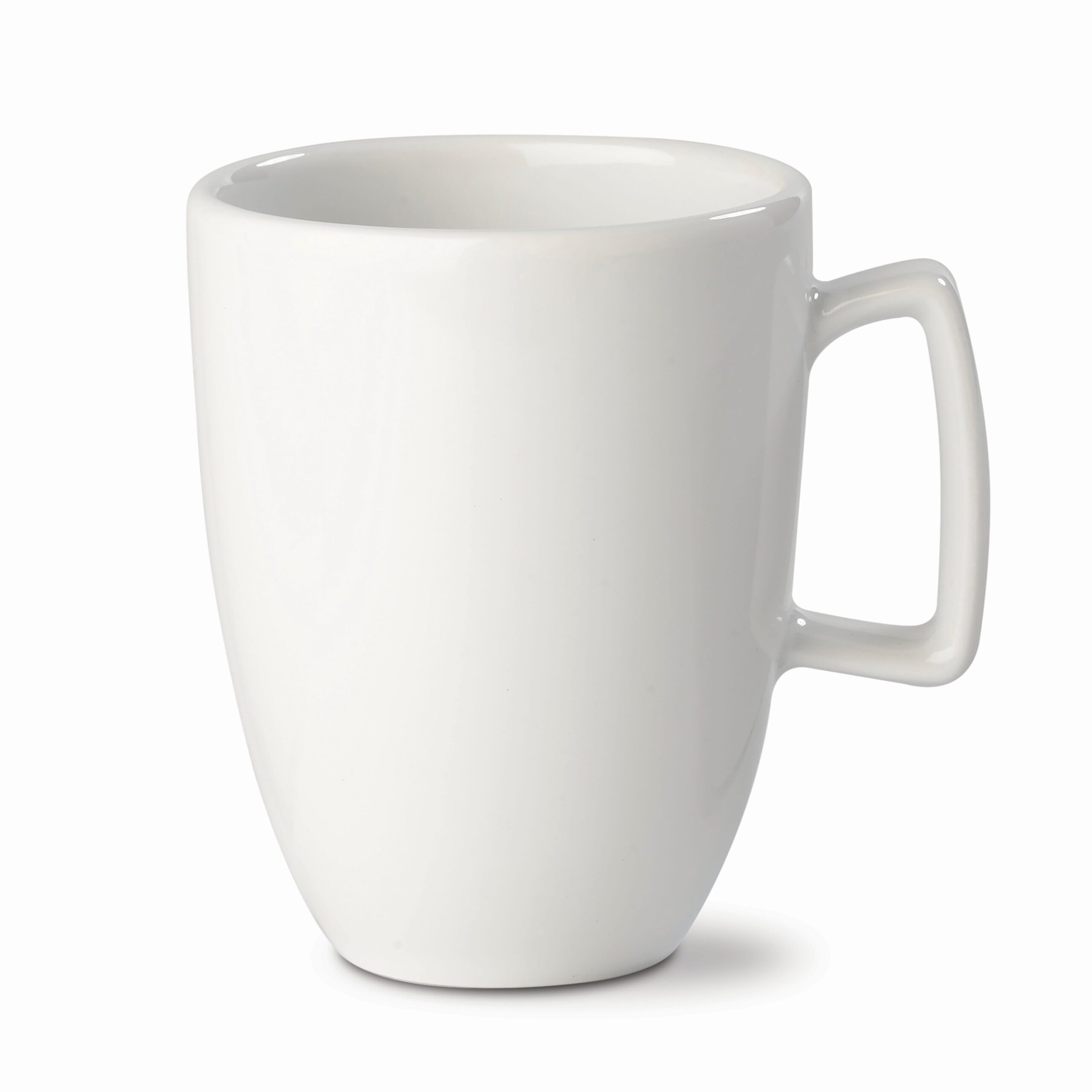 Weißer, edler Porzellanbecher von hochwertiger Qualität. Made in Europe. Ein edles Design mit eckigem Henkel.