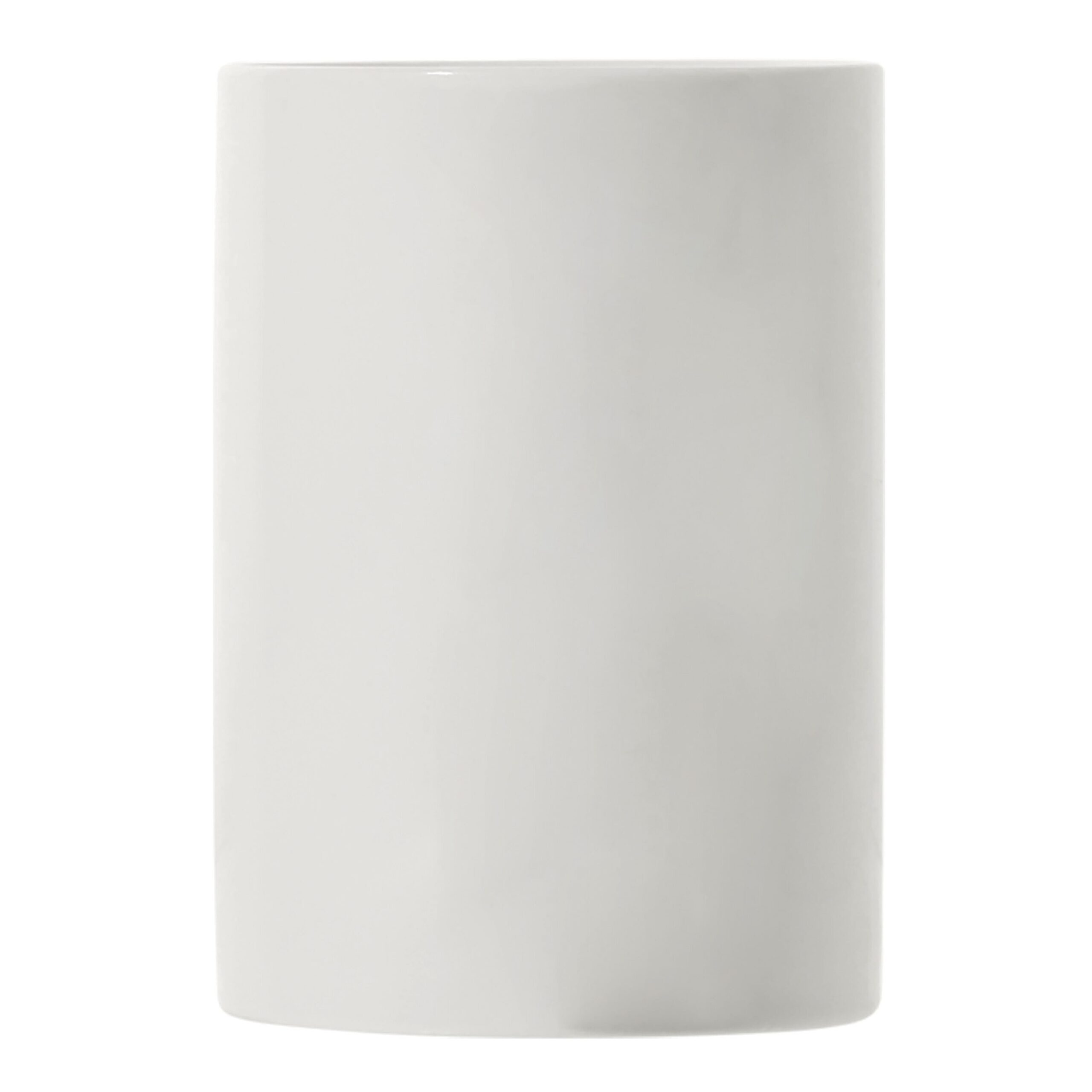 Weißer eleganter Porzellanbecher in schmaler Form mit lang gebogenem Henkel. Ein moderner Langzeitwerbeträger.