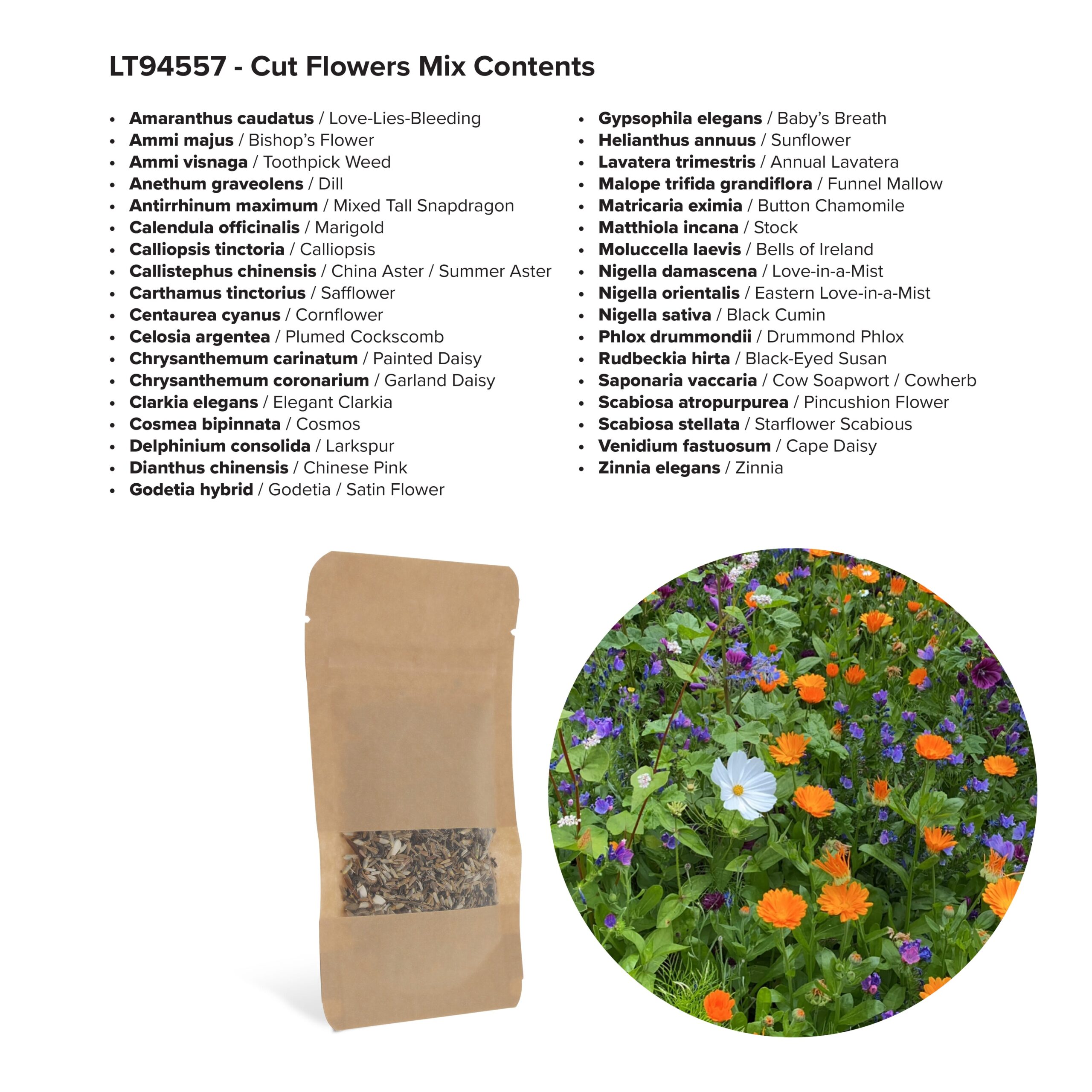 Kraftpapiertüte mit 4 Gramm Schnittblumensamen, geeignet für 2 m² Blumen. Ein wirklich nachhaltiges Geschenk.