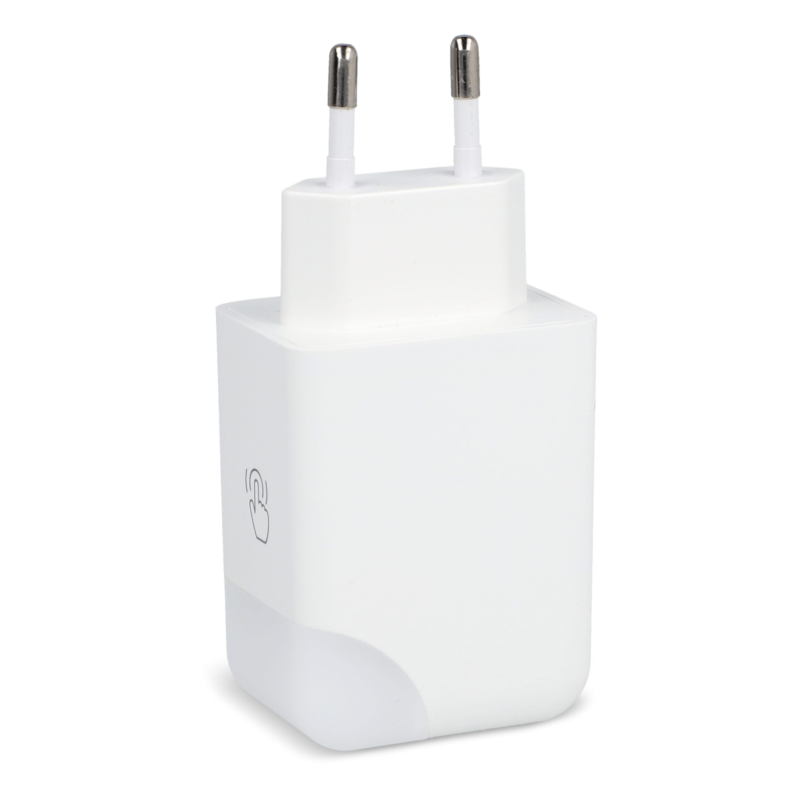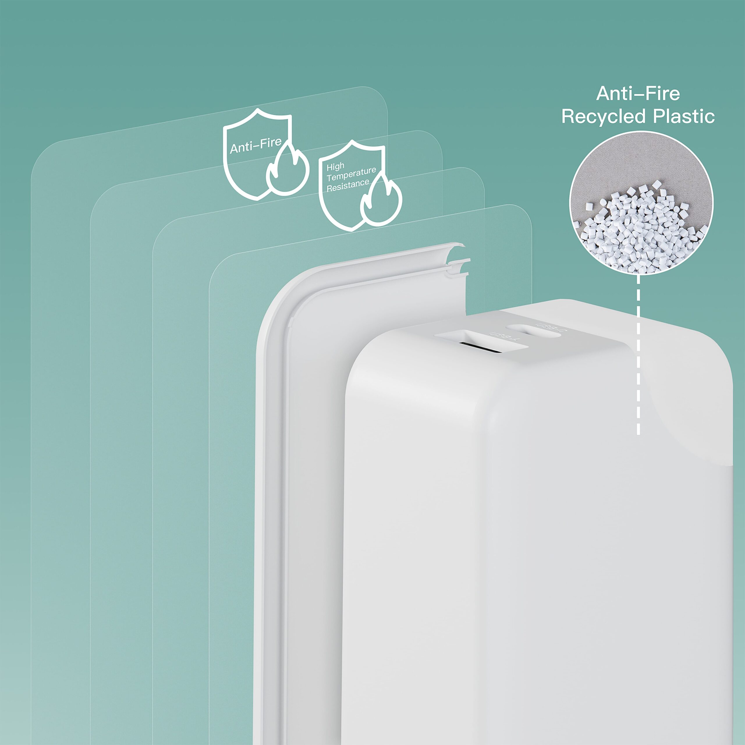 Dieses 65-W-GaN-Netzteil ist für das schnelle und effiziente Aufladen von Laptops, Tablets und Smartphones konzipiert. Er verfügt über einen USB-A-Anschluss mit bis zu 18 W Leistung und einen Typ-C-Anschluss mit bis zu 65 W Leistung. Wenn beide Anschlüsse gleichzeitig verwendet werden, bietet er eine maximale Leistung von 9 W pro Anschluss. Die intelligente Ladeanzeige zeigt nicht nur den Ladestatus an, sondern schaltet sich auch aus, sobald das Gerät vollständig aufgeladen ist, und kann durch Berühren manuell ausgeschaltet werden. Das kompakte und praktische Design macht es einfach zu benutzen. Es ist aus feuerfestem, recyceltem Kunststoff hergestellt, der Sicherheit und Nachhaltigkeit gewährleistet. Egal, ob Sie zu Hause, im Büro oder unterwegs sind, dieser Adapter ist eine zuverlässige Stromversorgungslösung für alle Ihre Geräte.